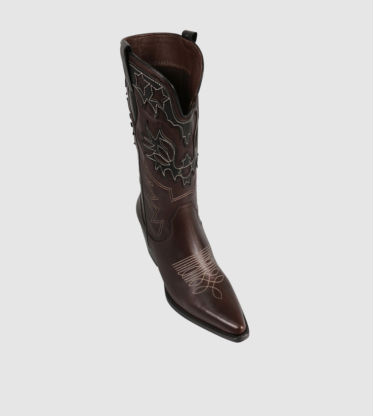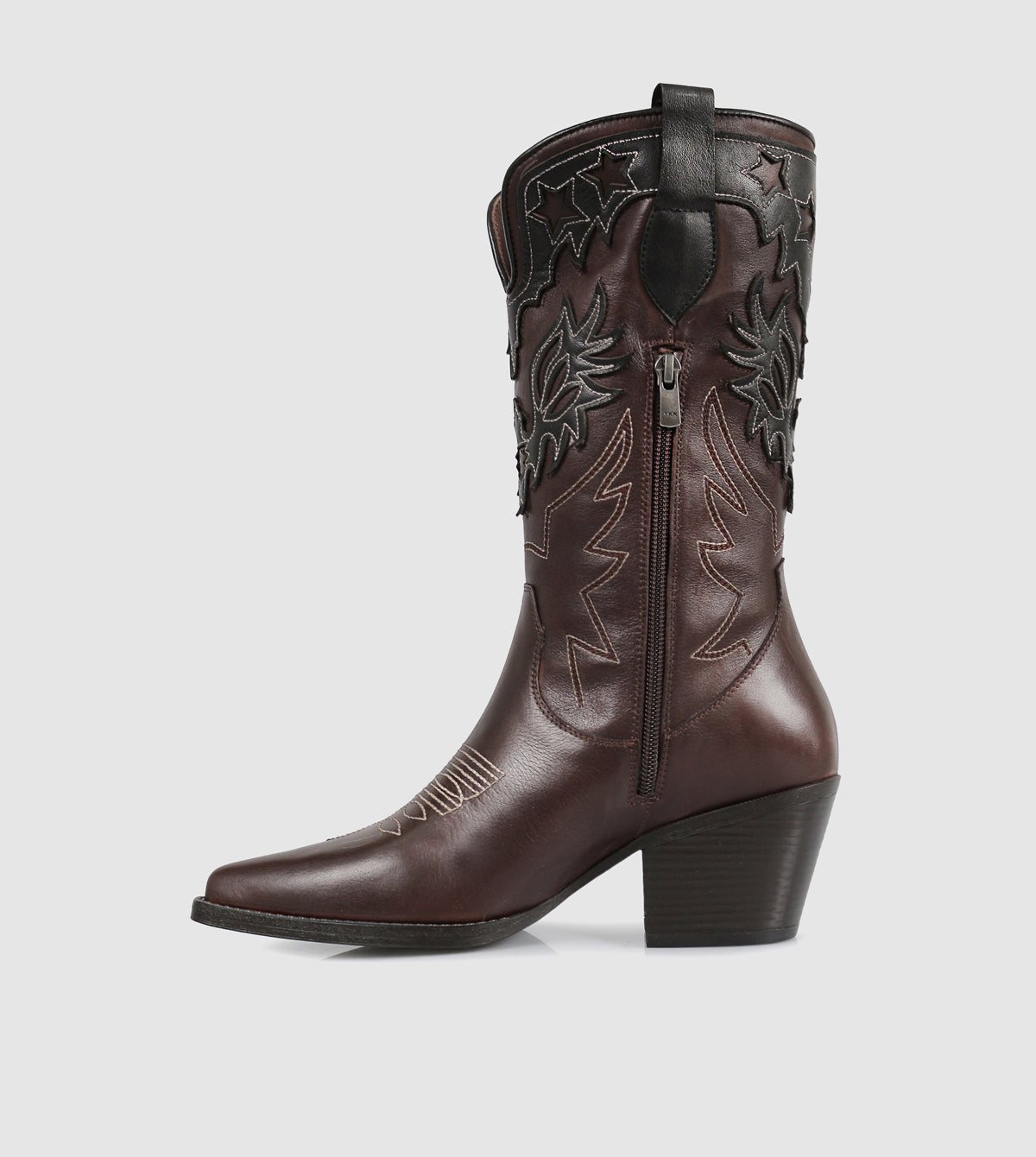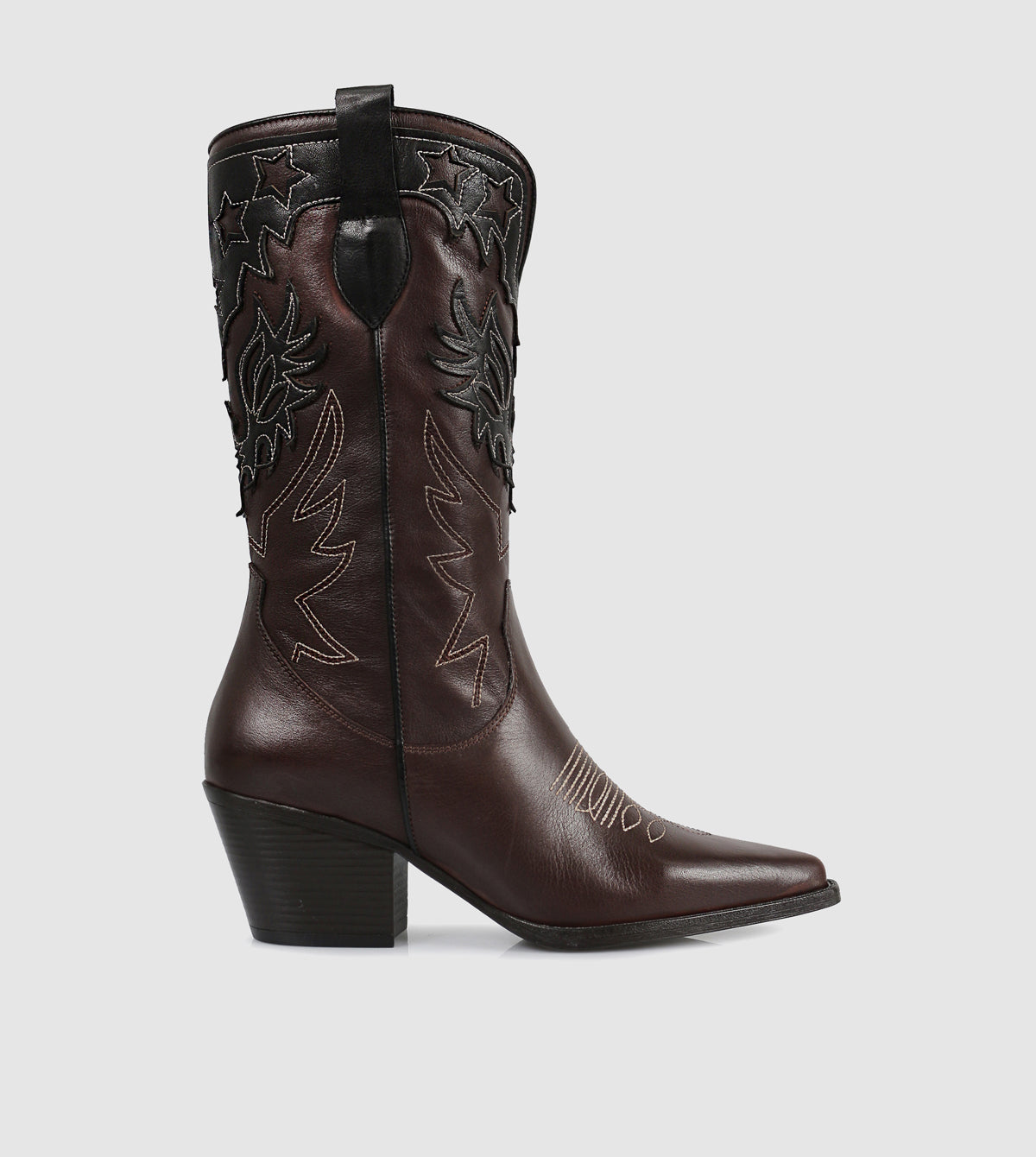 The Zoey Mid Boots by S Sempre Di bring a bold Western-inspired aesthetic to modern footwear. Crafted from premium leather, these mid-calf boots feature striking two-tone detailing with intricate embroidery for a statement look. A pointed toe and sturdy block heel add a refined touch, while the pull tabs ensure easy wear. Designed for both style and comfort, these boots make a versatile addition to any wardrobe.