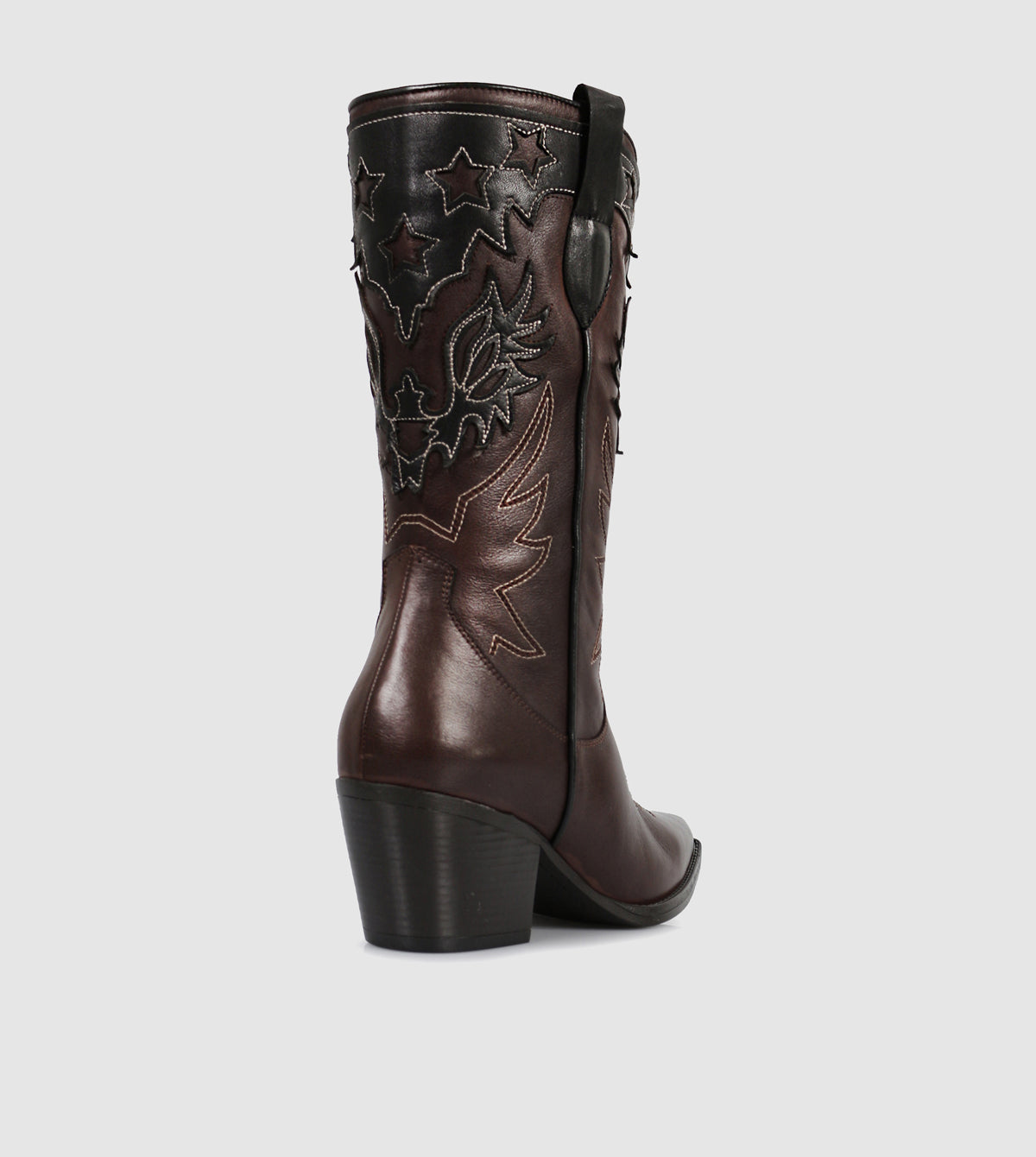 - Western-inspired mid-calf boot silhouette