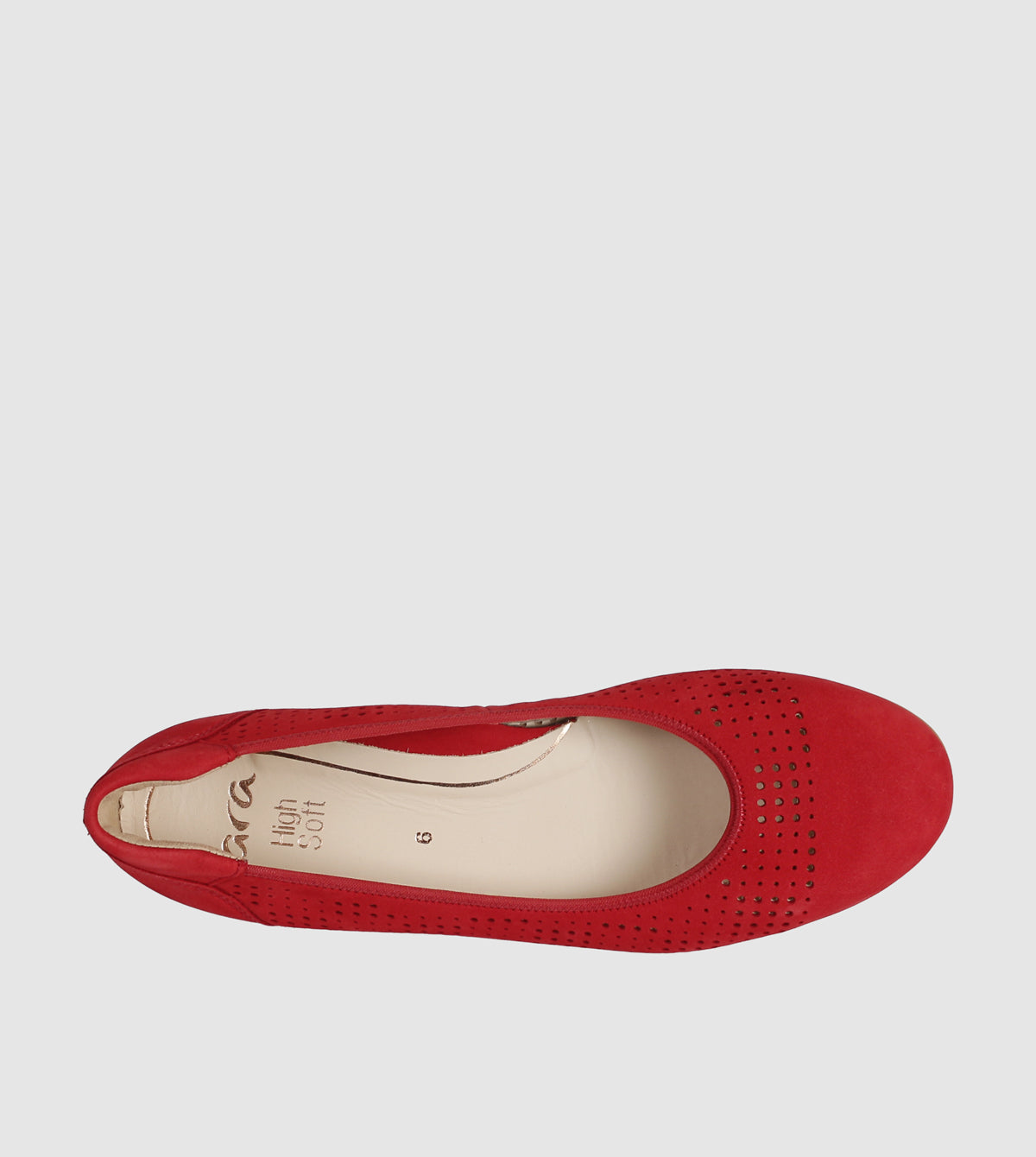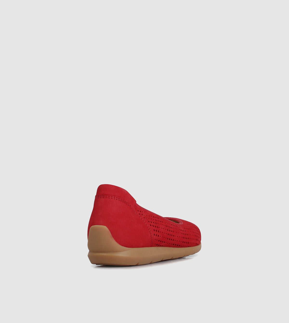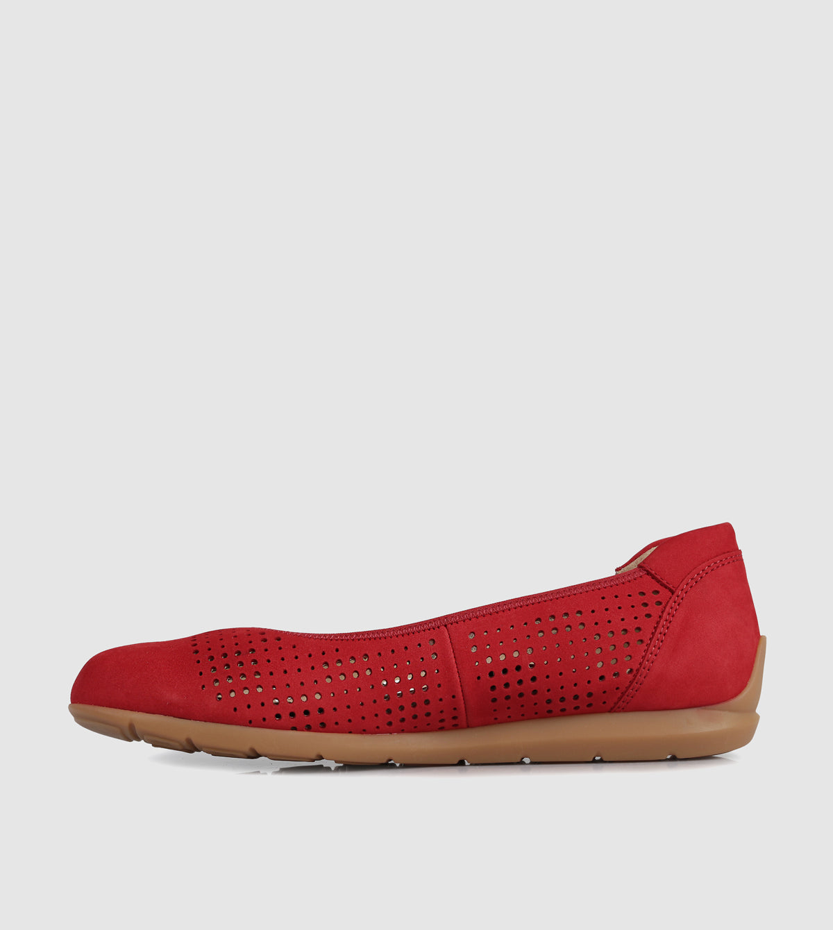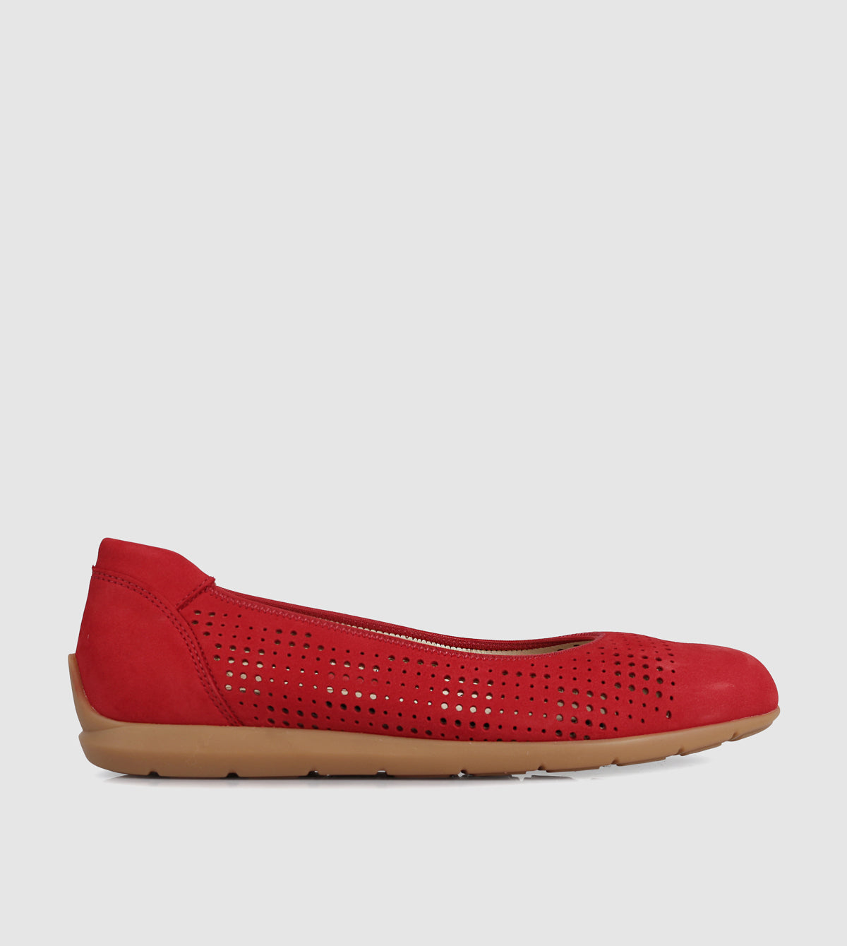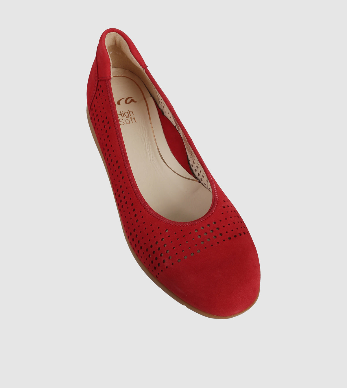 Introducing the Kumi ballet flat by Ara, where modern design meets ultimate comfort. Crafted in a sleek red with a hint of perforated detailing, this flat is a perfect choice for those seeking a blend of style and breathability. Whether paired with jeans or a summer dress, the Kumi flat is versatile enough for any occasion.