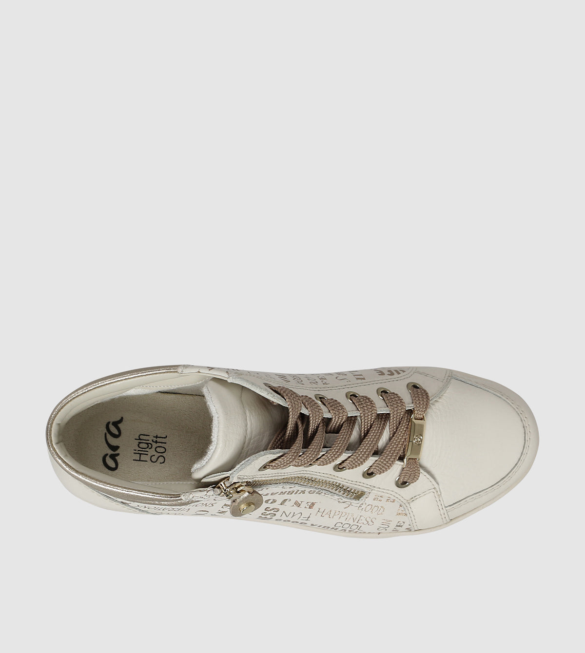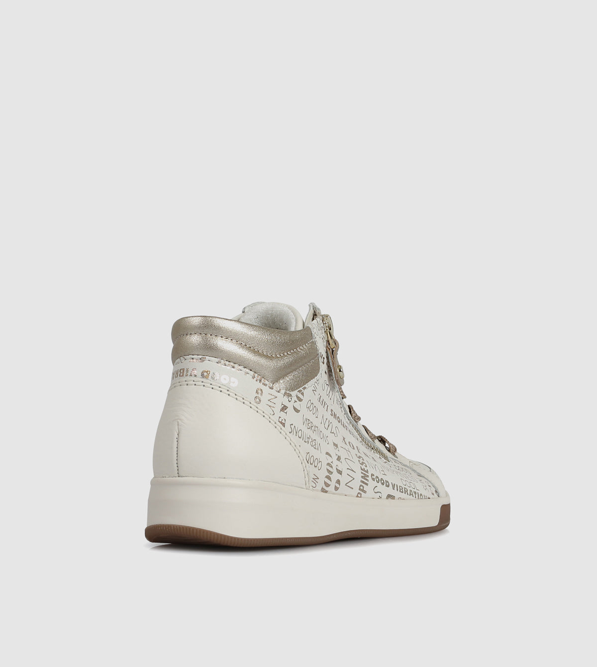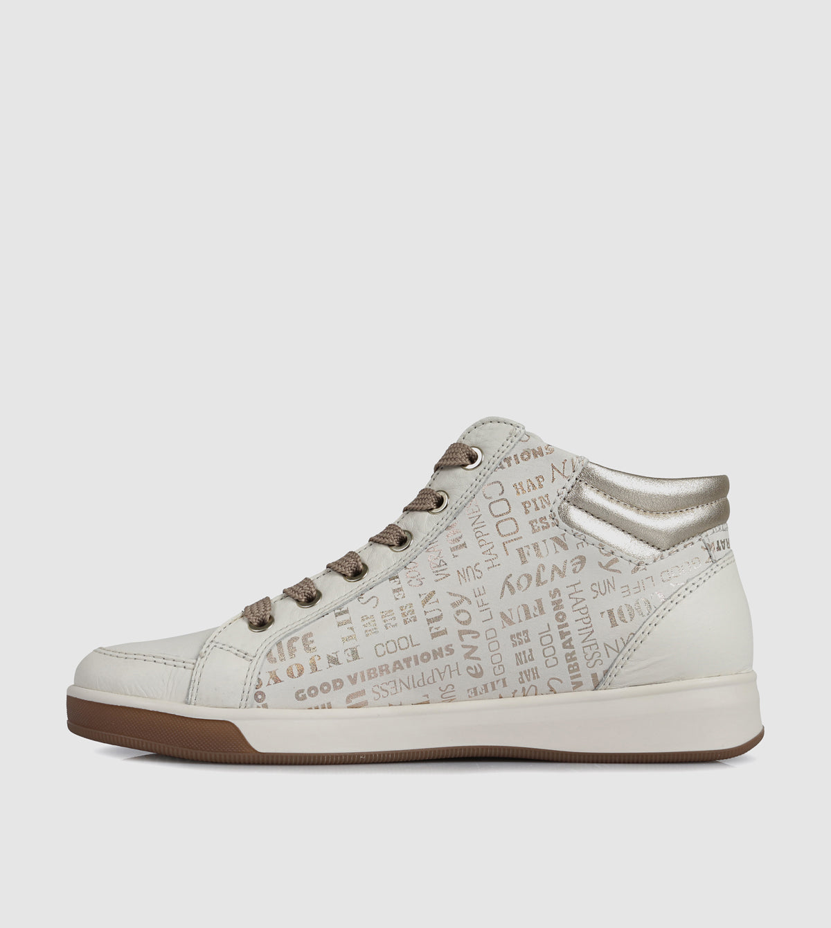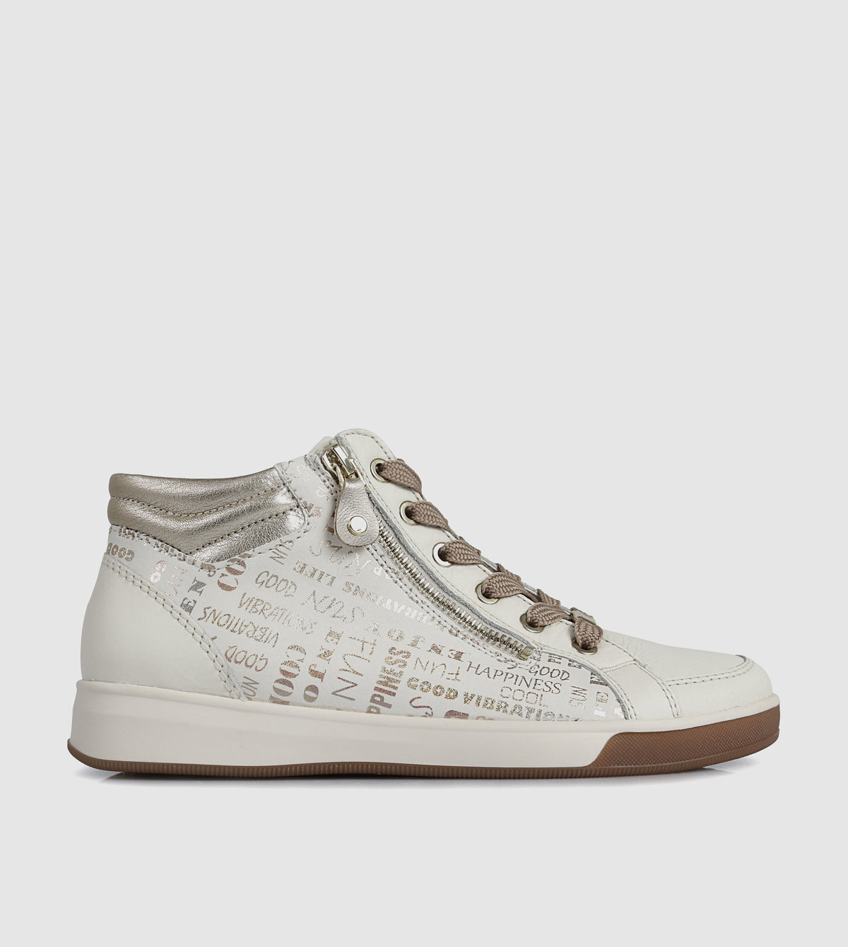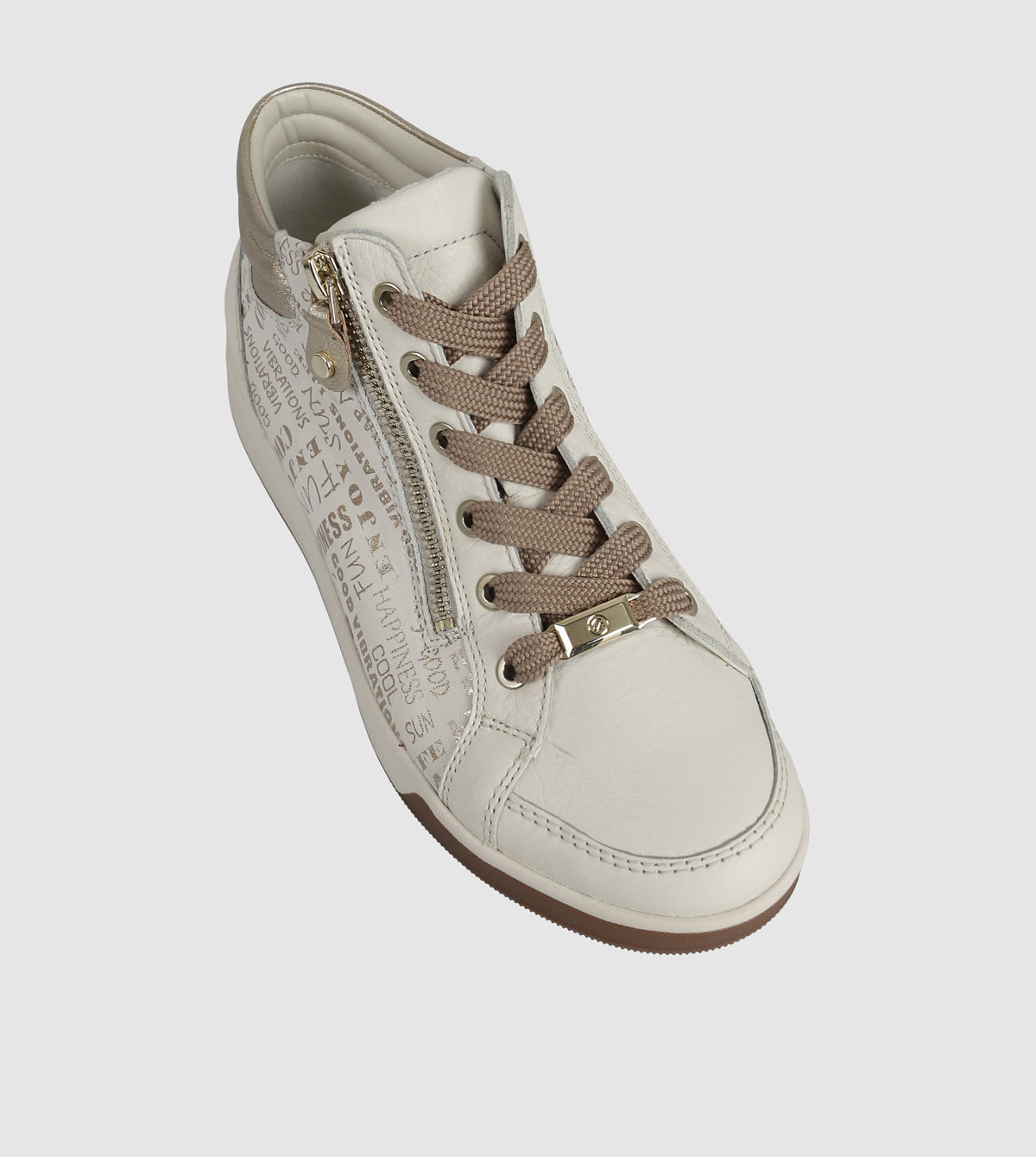 Unleash your adventurous spirit with the Donya high-top sneaker by Ara, a stylish mix of comfort and personality. Crafted in cream with metallic accents, this sneaker features playful text details that add a unique, expressive touch. Equipped with dual zippers for easy wear and a lace-up front for a secure fit, the Donya combines convenience with flair. Perfect for those who love a little edge in their everyday style.
