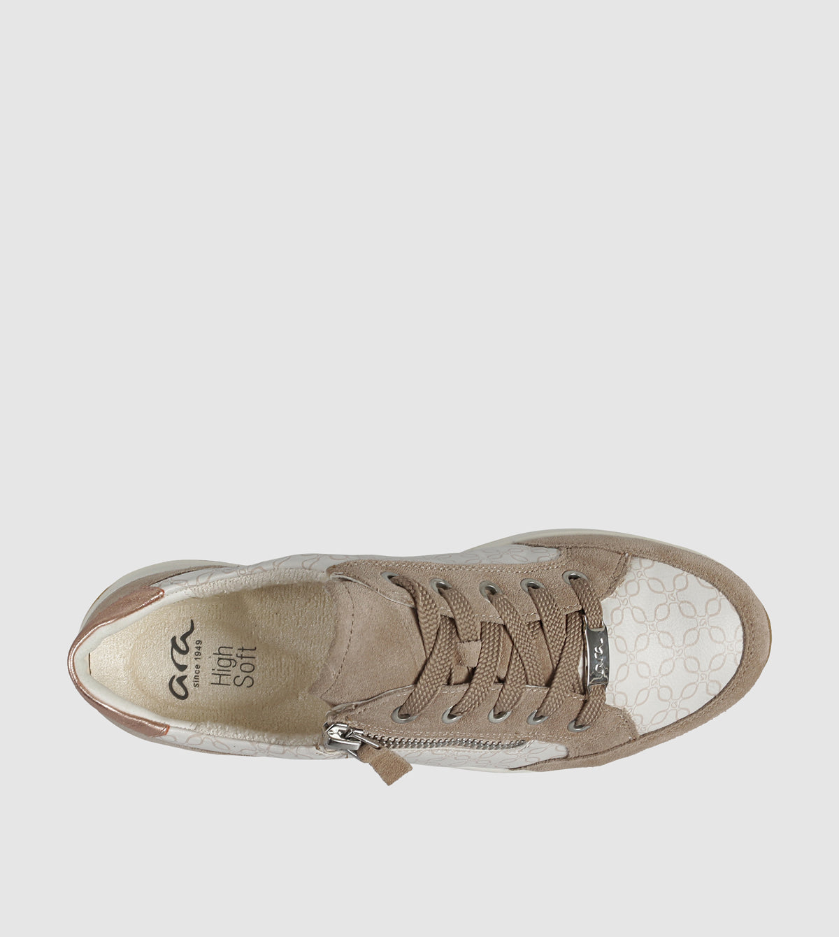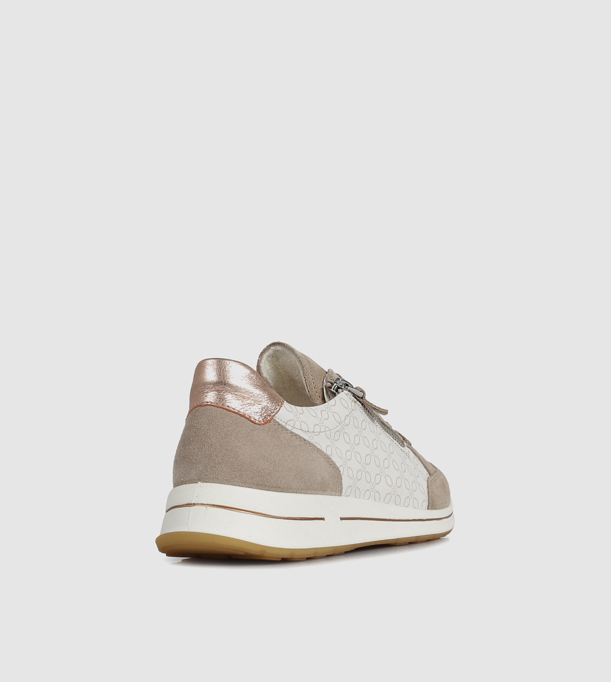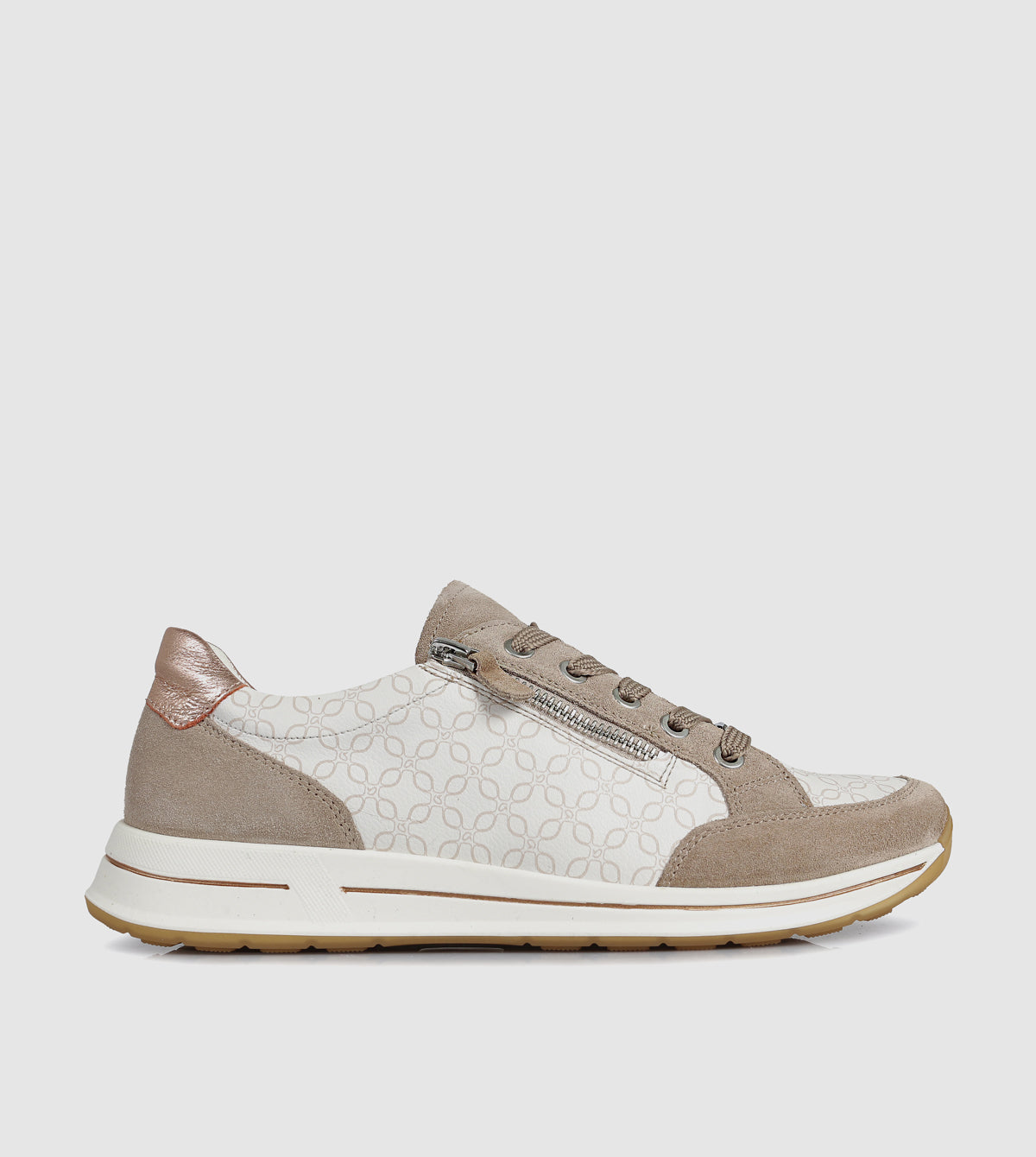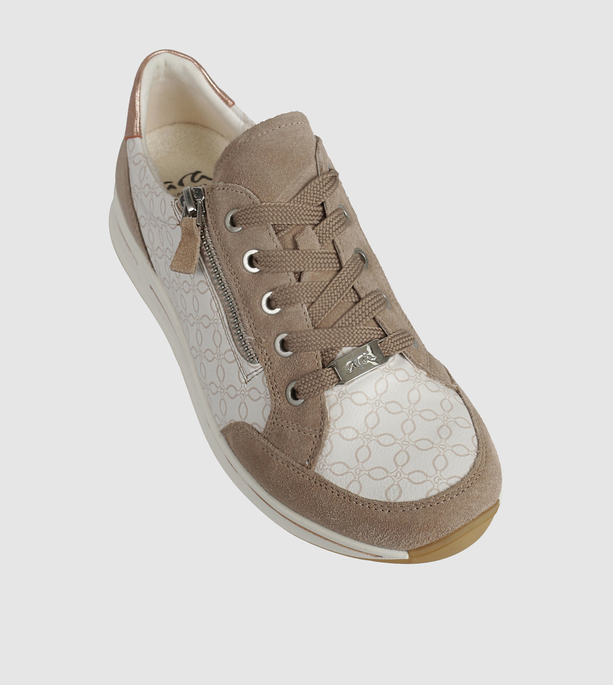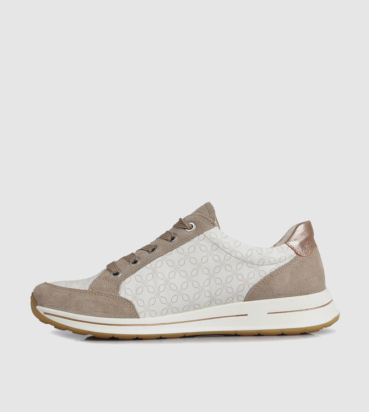 Step into casual elegance with the Enye sneaker by Ara, a versatile choice for everyday wear. This sneaker features a delicate geometric pattern on the upper, paired with soft suede and metallic rose gold accents for a sophisticated touch.Designed with comfort in mind, the Enye provides a cushioned insole and flexible sole for all-day support. Whether you're running errands or meeting friends, the Enye sneaker delivers a refined, athletic look.