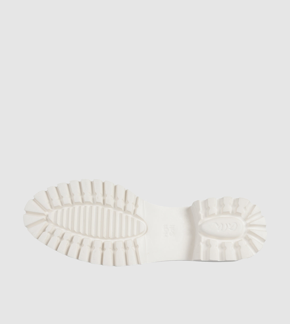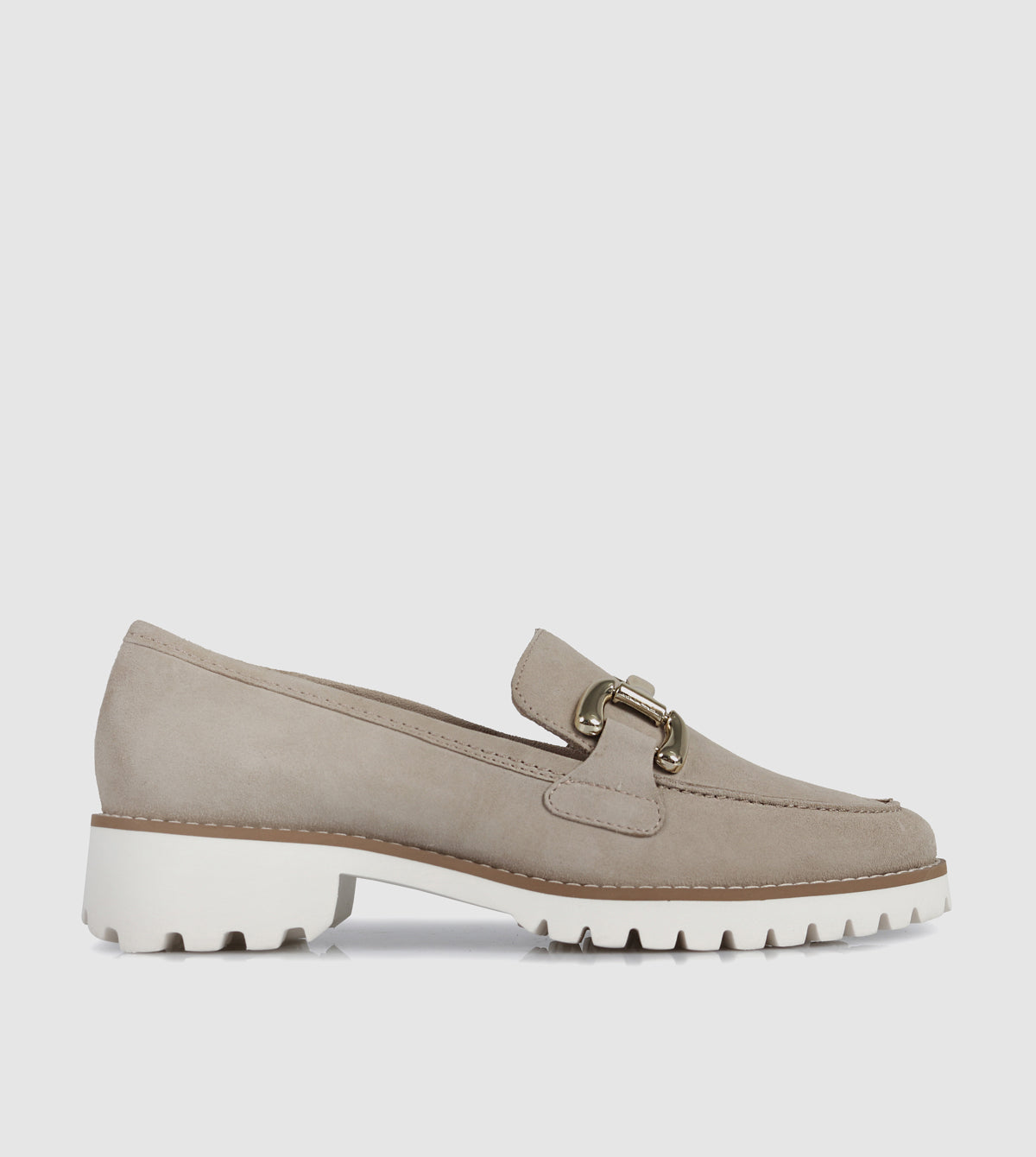 Introducing the Enid loafer by Ara, combining elegance with a rugged edge. Crafted in a soft taupe, it features a chunky white sole with deep grooves for excellent traction and a modern touch. The loafer is accented with a stylish gold buckle, adding a refined element to the casual design. Perfect for versatile wear, this shoe effortlessly pairs comfort with sophistication, making it an ideal choice for both casual and dressy occasions.