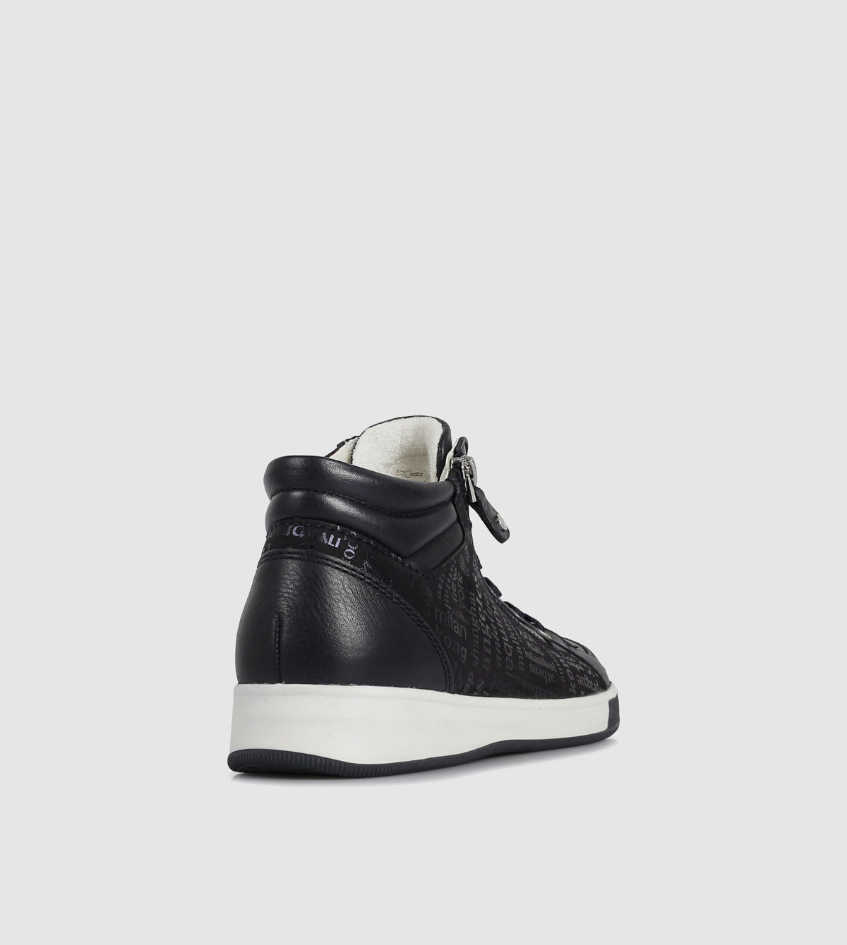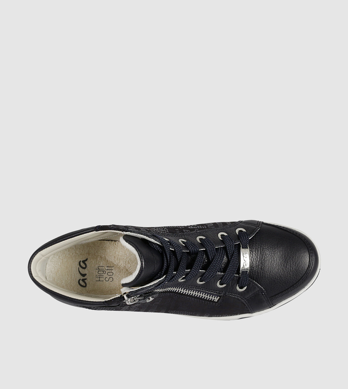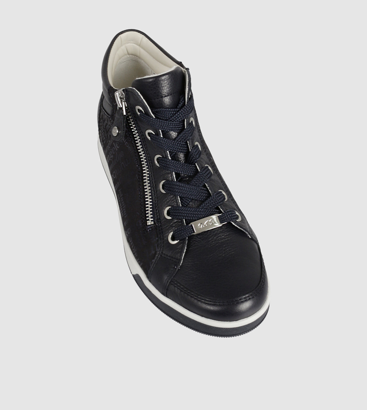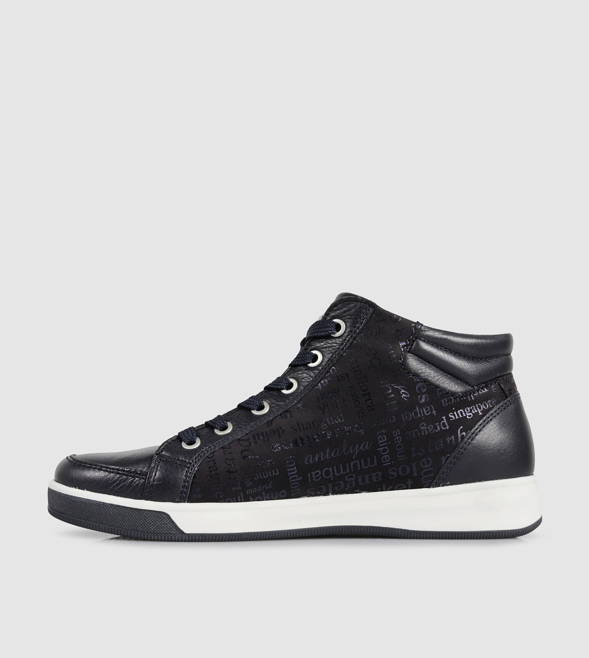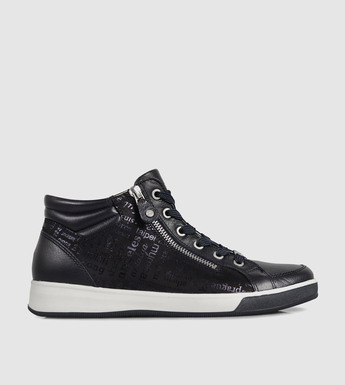 Elevate your street style with the Laydien high-top sneaker by Ara in sleek dark blue, featuring eye-catching text details for a modern twist. Designed with a side zipper for convenience and a lace-up front for a snug fit, this sneaker combines functionality with a bold look.
