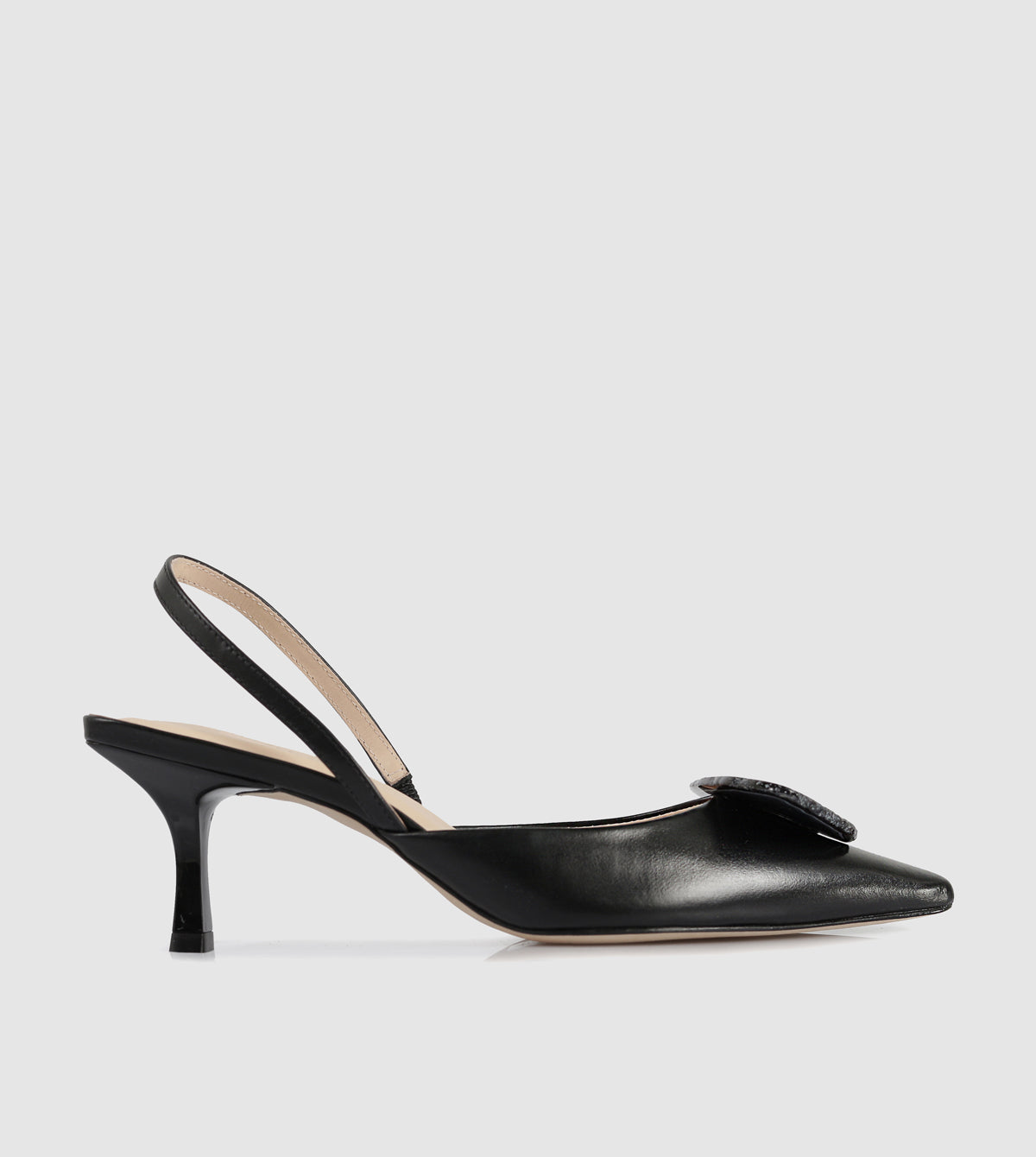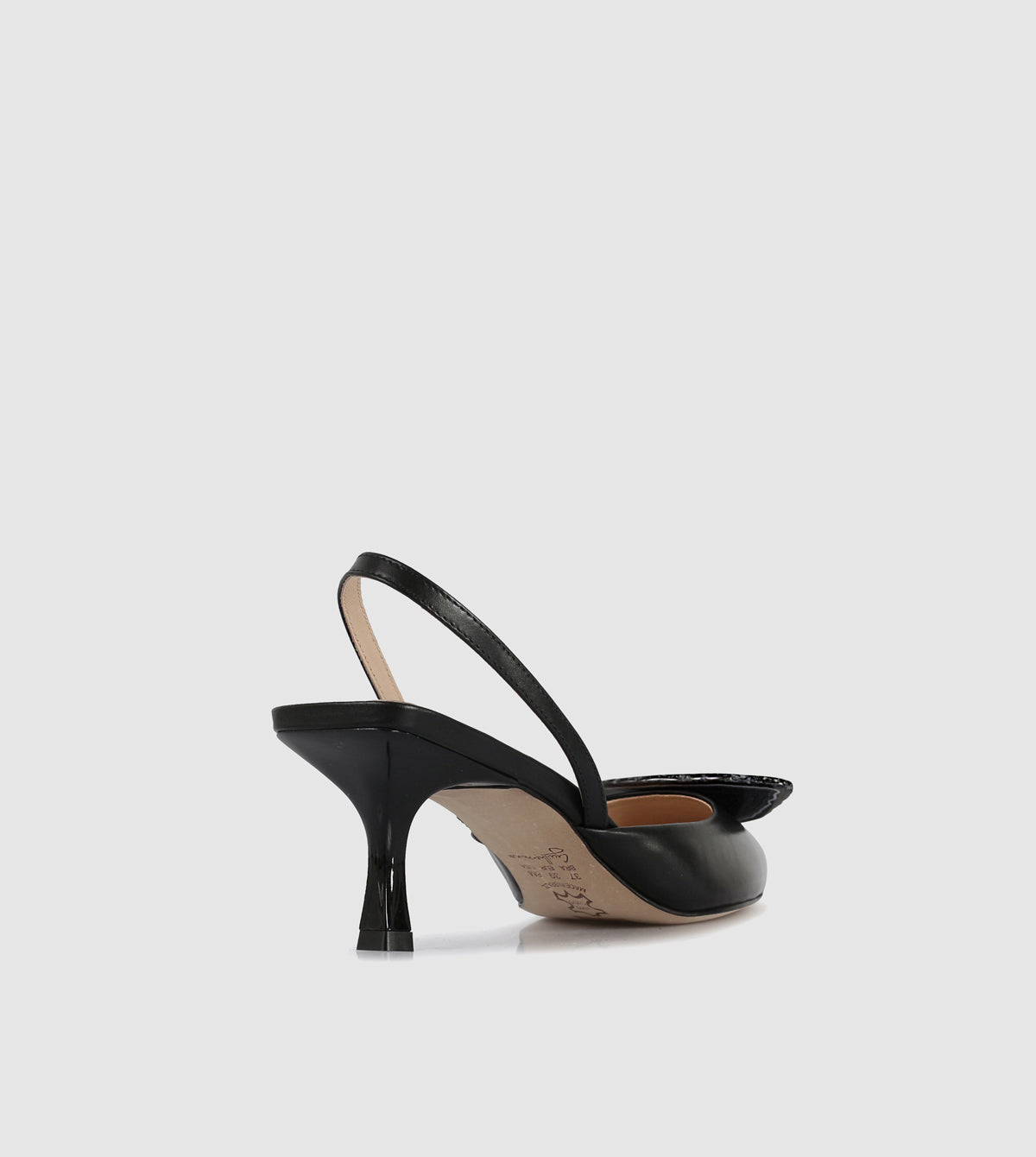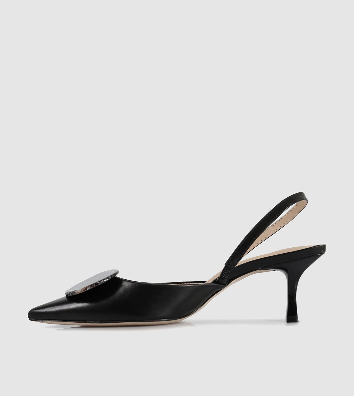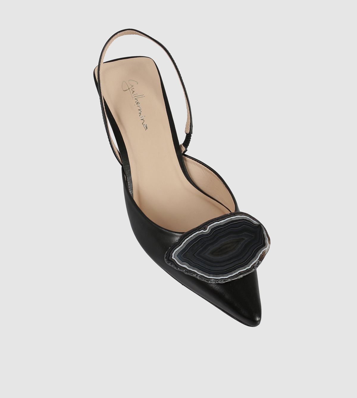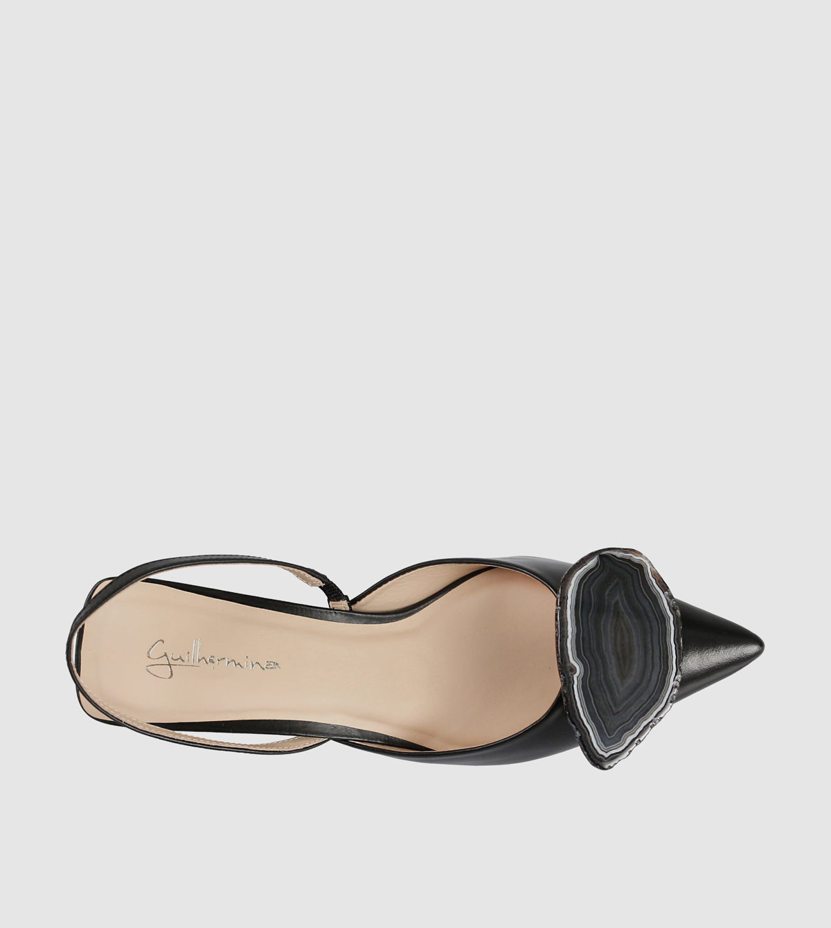 The Samina Heeled Sandals by Guilhermina bring a sculptural touch to a refined classic. Made in smooth black leather, this slingback style is defined by its pointed toe and striking agate stone embellishment. A low stiletto heel and delicate strap create a sleek silhouette that pairs effortlessly with both occasionwear and sharp tailoring.