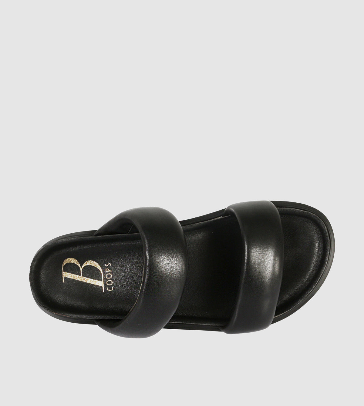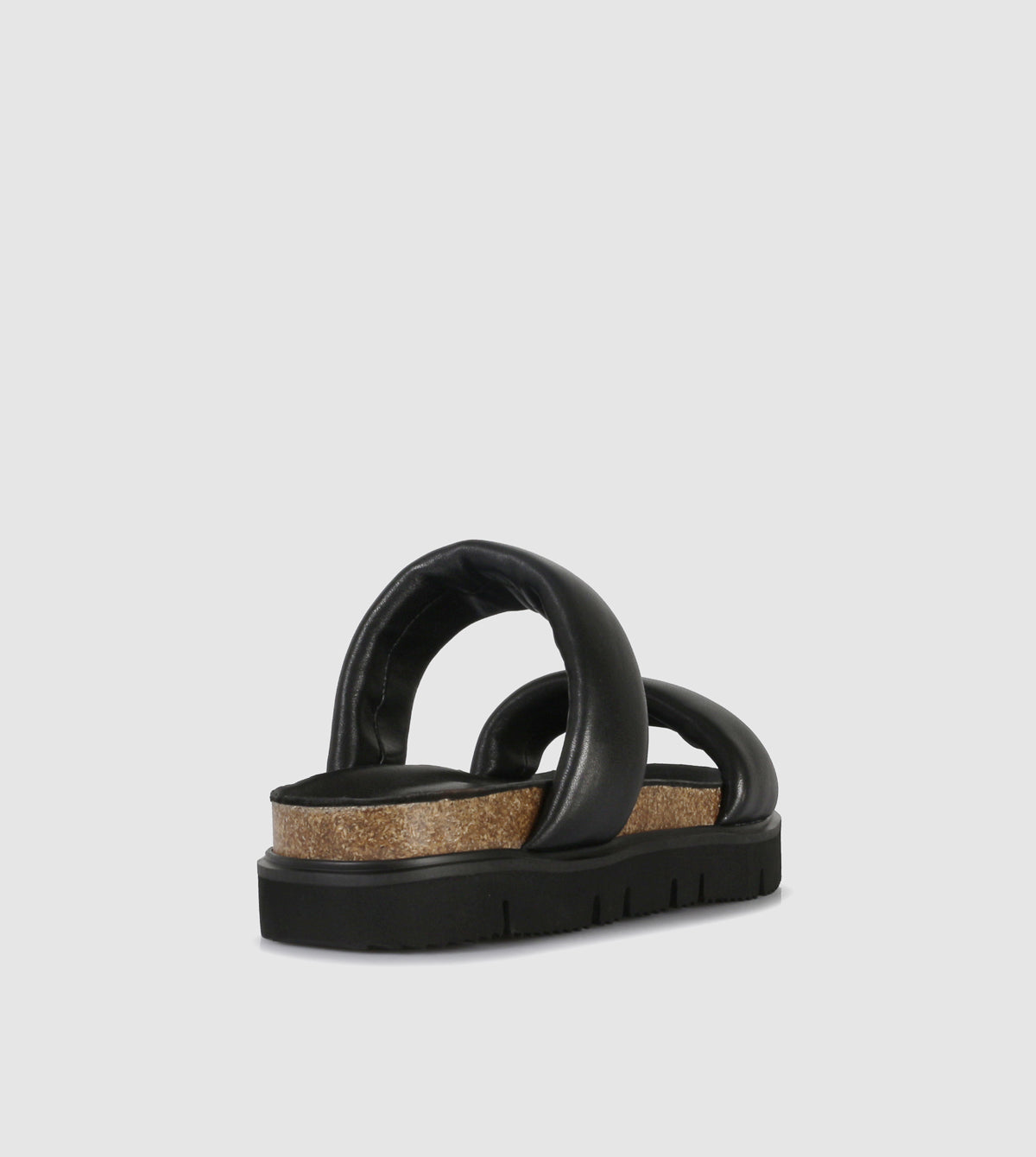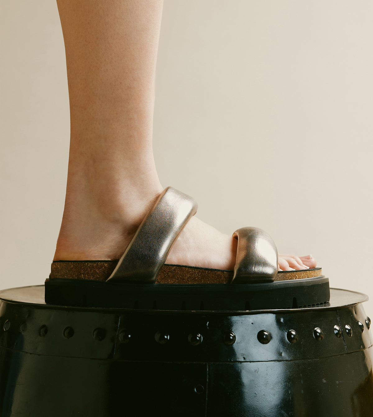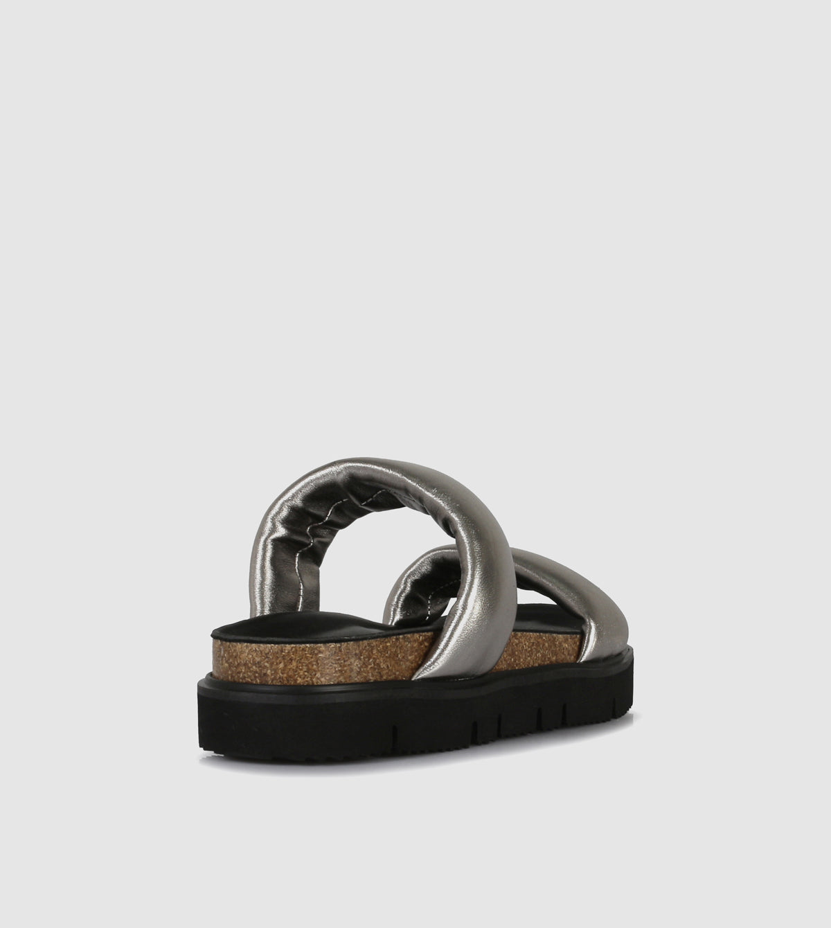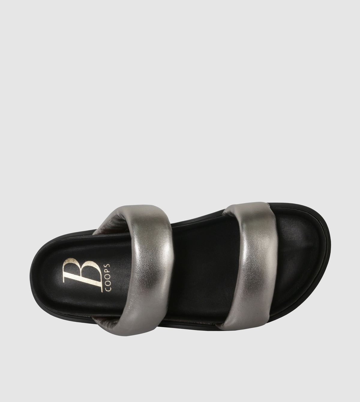 The Polaris Sandals by B Coops fuse casual comfort with a bold, contemporary edge. Defined by wide padded leather straps and a contoured cork footbed, this slip-on style balances laid-back ease with statement-making design. A chunky rubber sole adds durability and modern contrast, making Polaris the go-to sandal for elevated everyday wear. Available in metallic silver and black, it brings a sleek finish to warm-weather dressing.