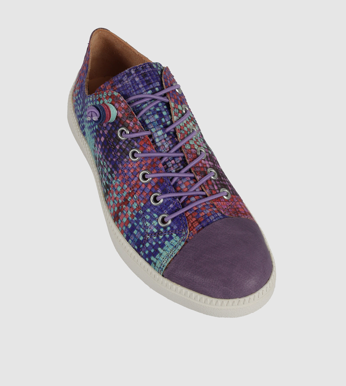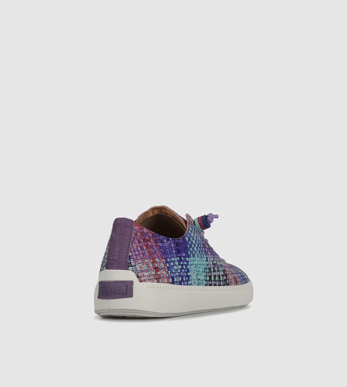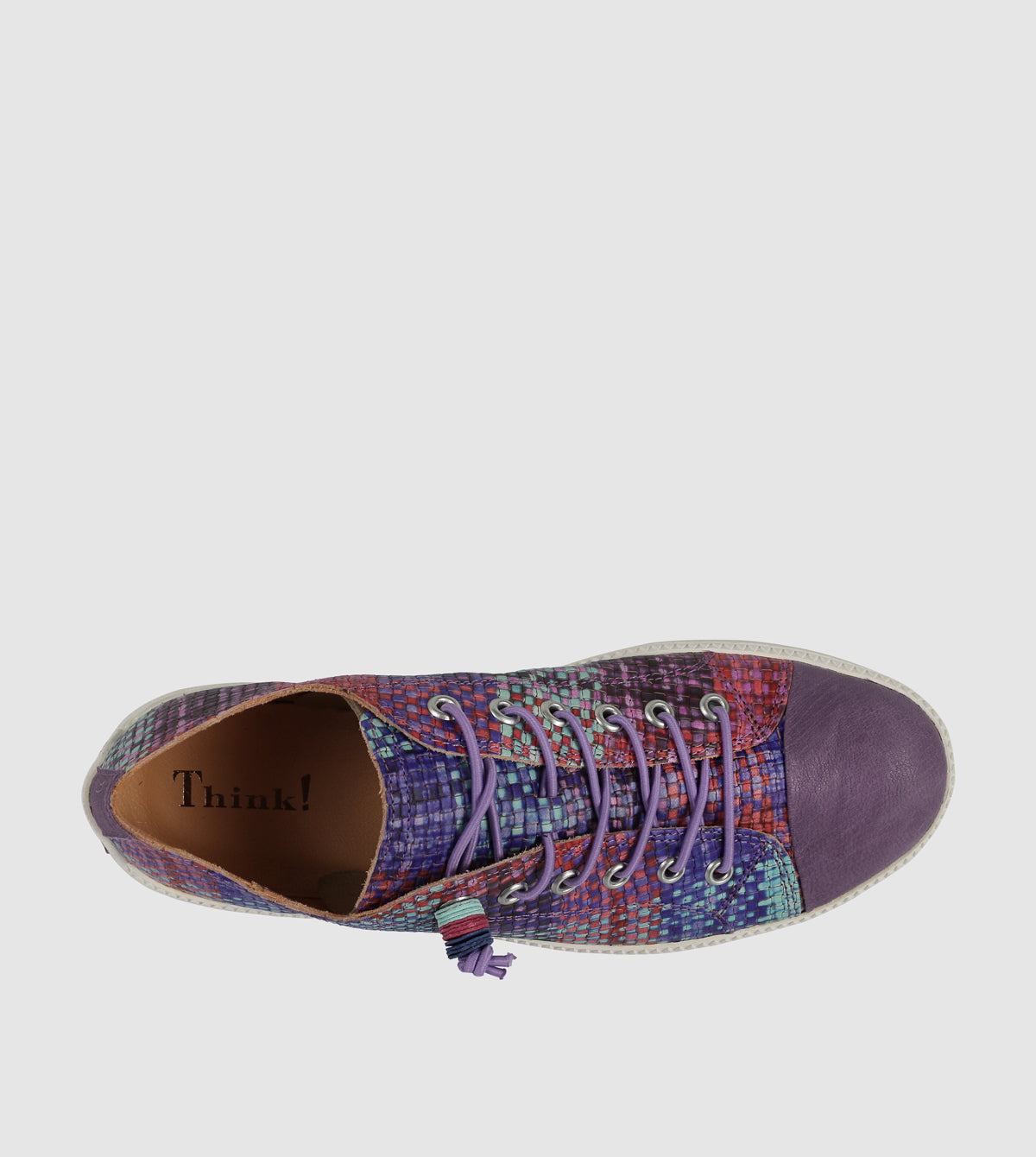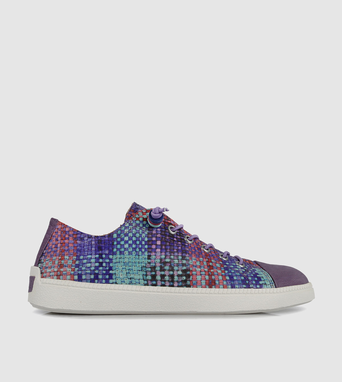 The Charlize sneakers by Think! combine comfort with artistic flair, featuring a woven, mosaic-like pattern that adds vibrancy to any outfit. The first design comes in cool tones of purple and blue, creating a bold and eye-catching effect. The second option offers a warm blend of greens and earthy hues, perfect for a subtle yet stylish look. Both styles bring a unique, creative touch to casual footwear, making them versatile choices for everyday wear.