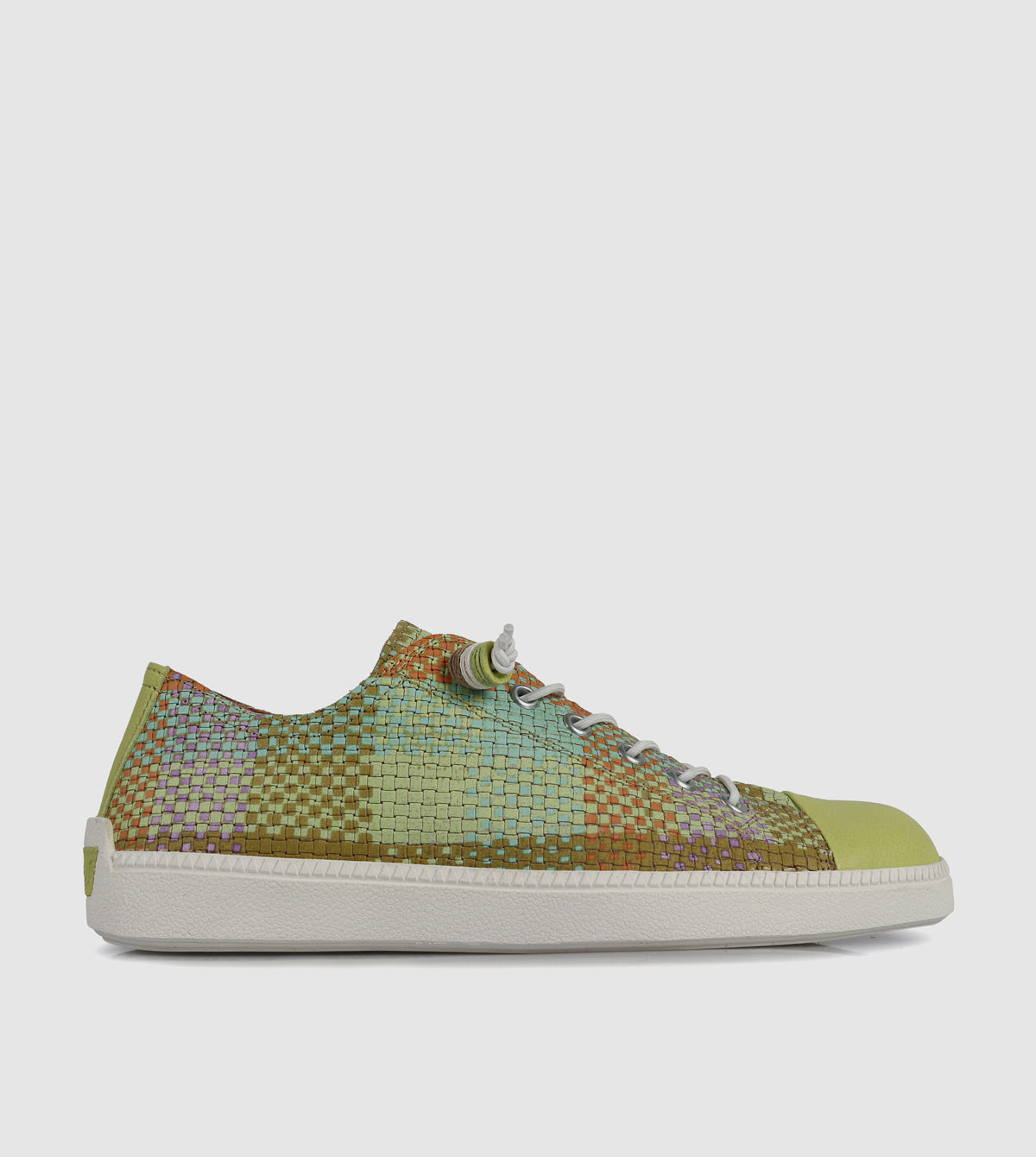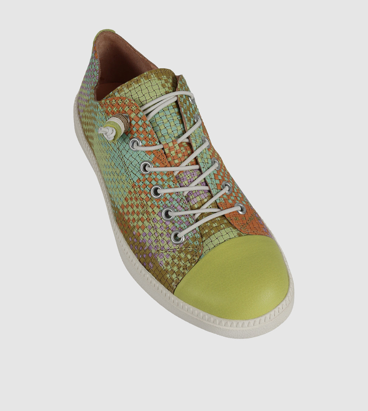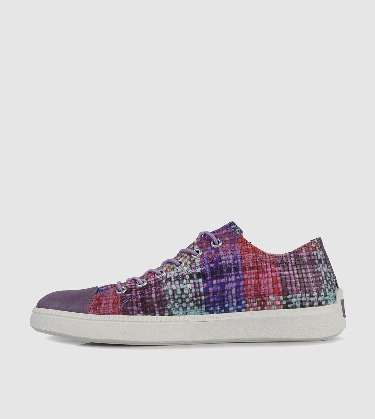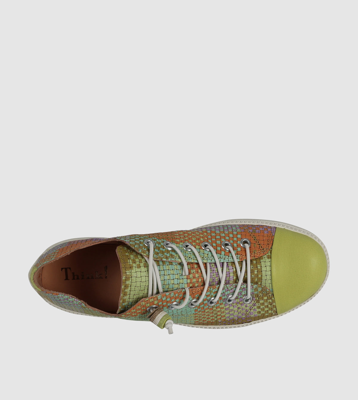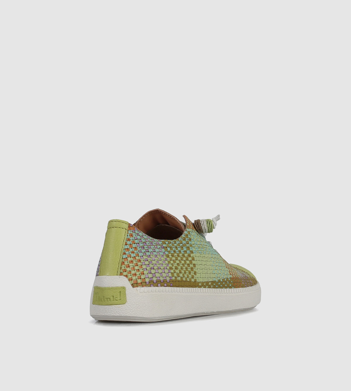 The Charlize sneakers by Think! combine comfort with artistic flair, featuring a woven, mosaic-like pattern that adds vibrancy to any outfit. The first design comes in cool tones of purple and blue, creating a bold and eye-catching effect. The second option offers a warm blend of greens and earthy hues, perfect for a subtle yet stylish look. Both styles bring a unique, creative touch to casual footwear, making them versatile choices for everyday wear.
