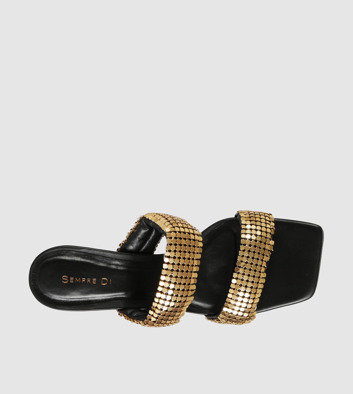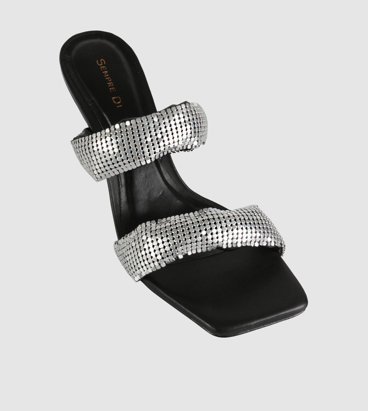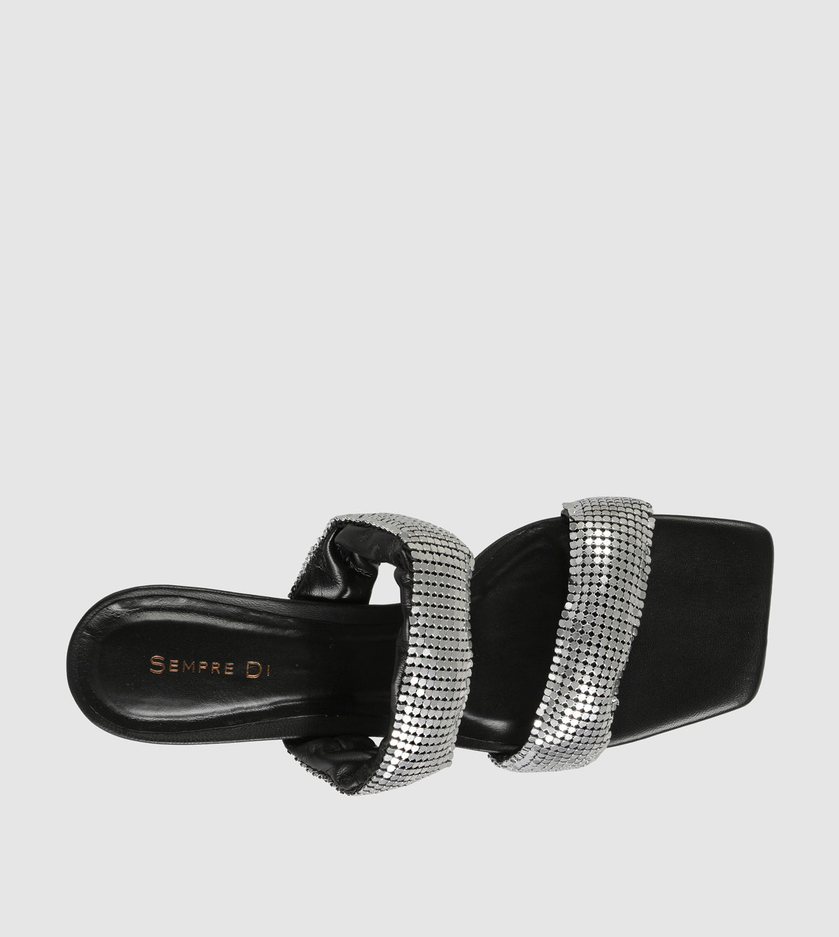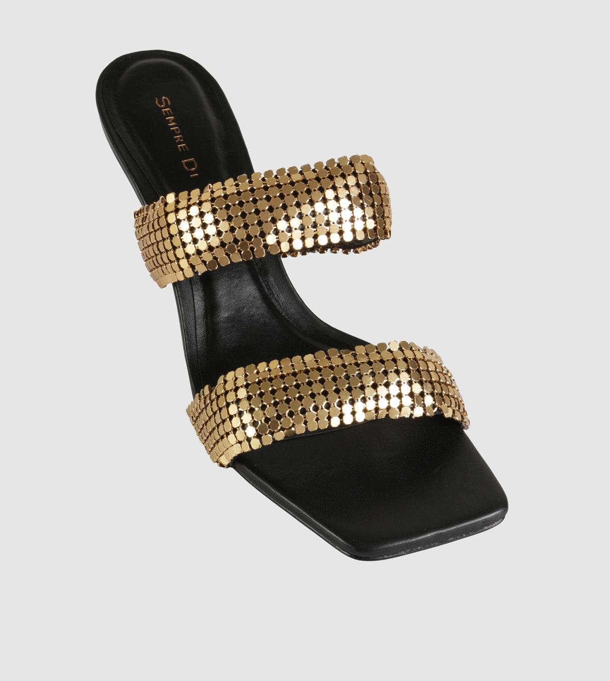 The Lizzy Heeled Sandals by Sempre Di brings you all the glamour needed! The open two strap design sits elegantly on the feet and are easy to pair to any outfit being it a gown or a ripped pair of jeans. It all works. The leather wide straps are covered in sequins and they come in the classic gold or silver version. Easy to slip on with the perfect medium height heel.
