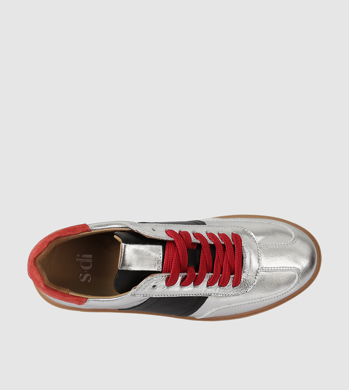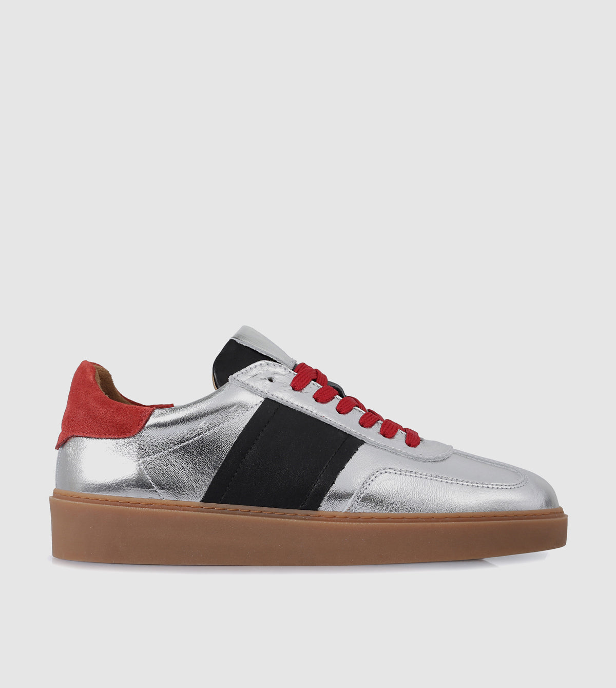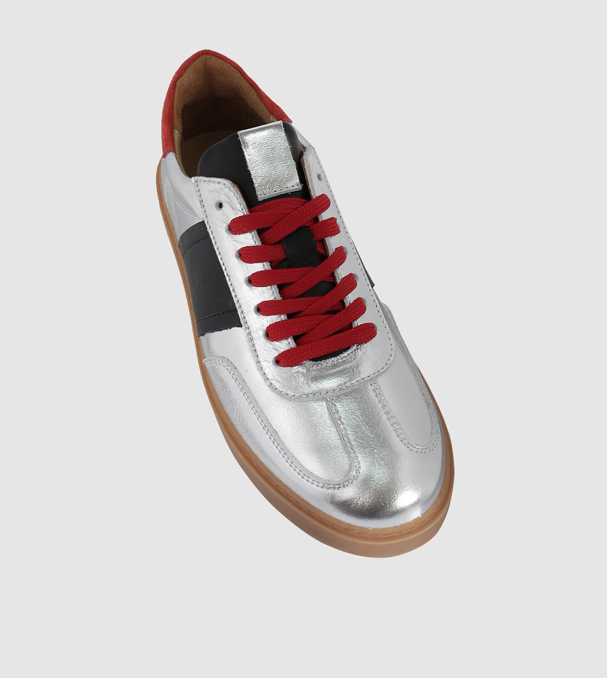 The Samira Low Top Sneakers by Sempre Di make a bold statement with their futuristic metallic finish and sporty silhouette. Crafted from premium leather, these sneakers feature a striking silver upper, contrast black side band, and vibrant red heel tab and laces. A cushioned footbed and rubber sole ensure comfort and grip, while the standout design adds a playful twist to any casual outfit.