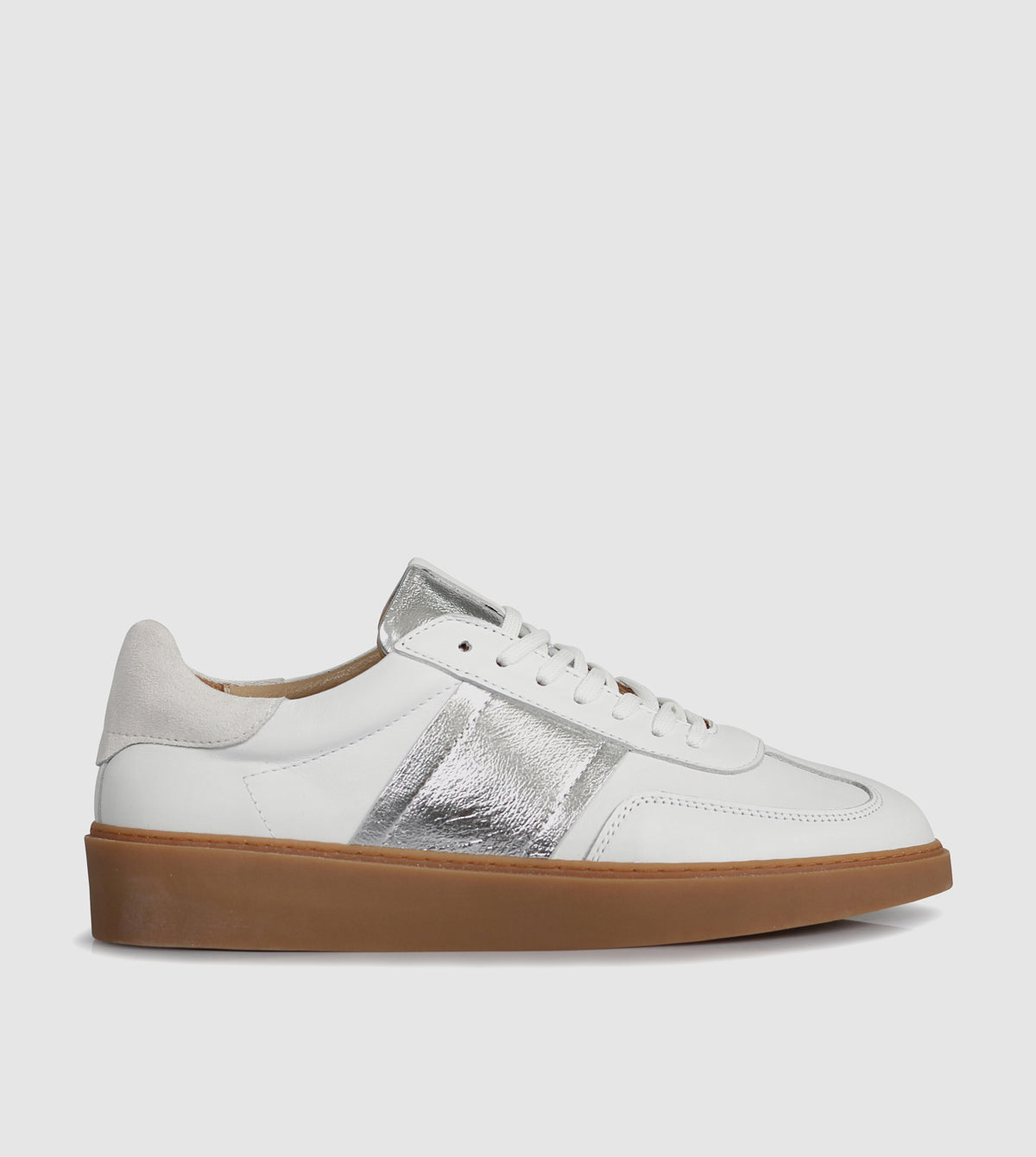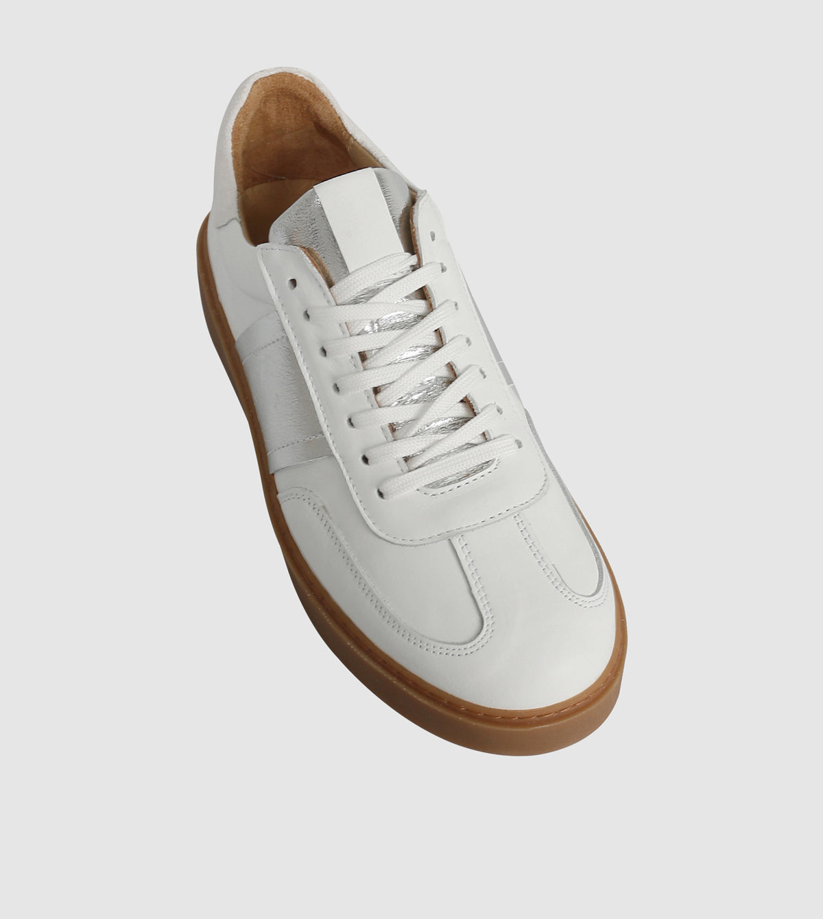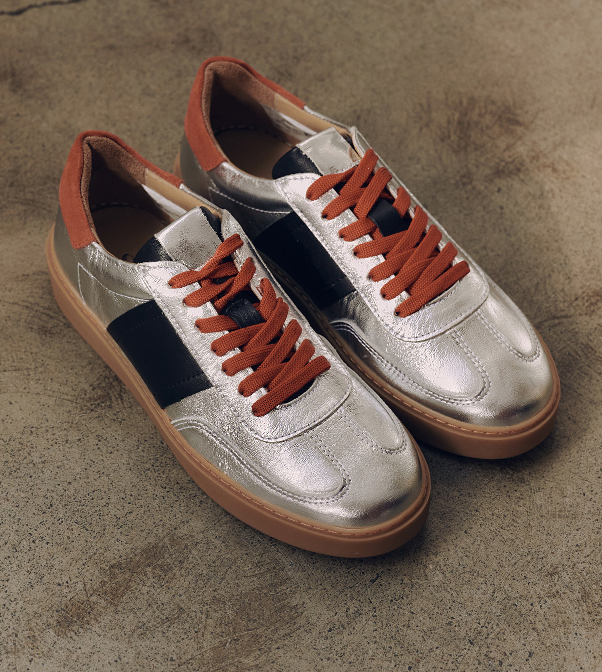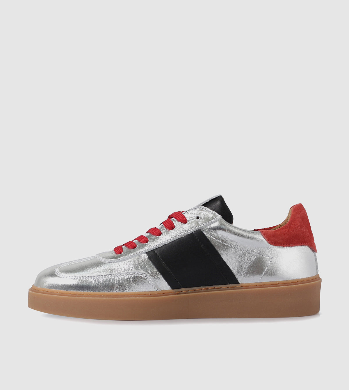 The Samira Low Top Sneakers by Sempre Di make a bold statement with their futuristic metallic finish and sporty silhouette. Crafted from premium leather, these sneakers feature a striking silver upper, contrast black side band, and vibrant red heel tab and laces. A cushioned footbed and rubber sole ensure comfort and grip, while the standout design adds a playful twist to any casual outfit.
