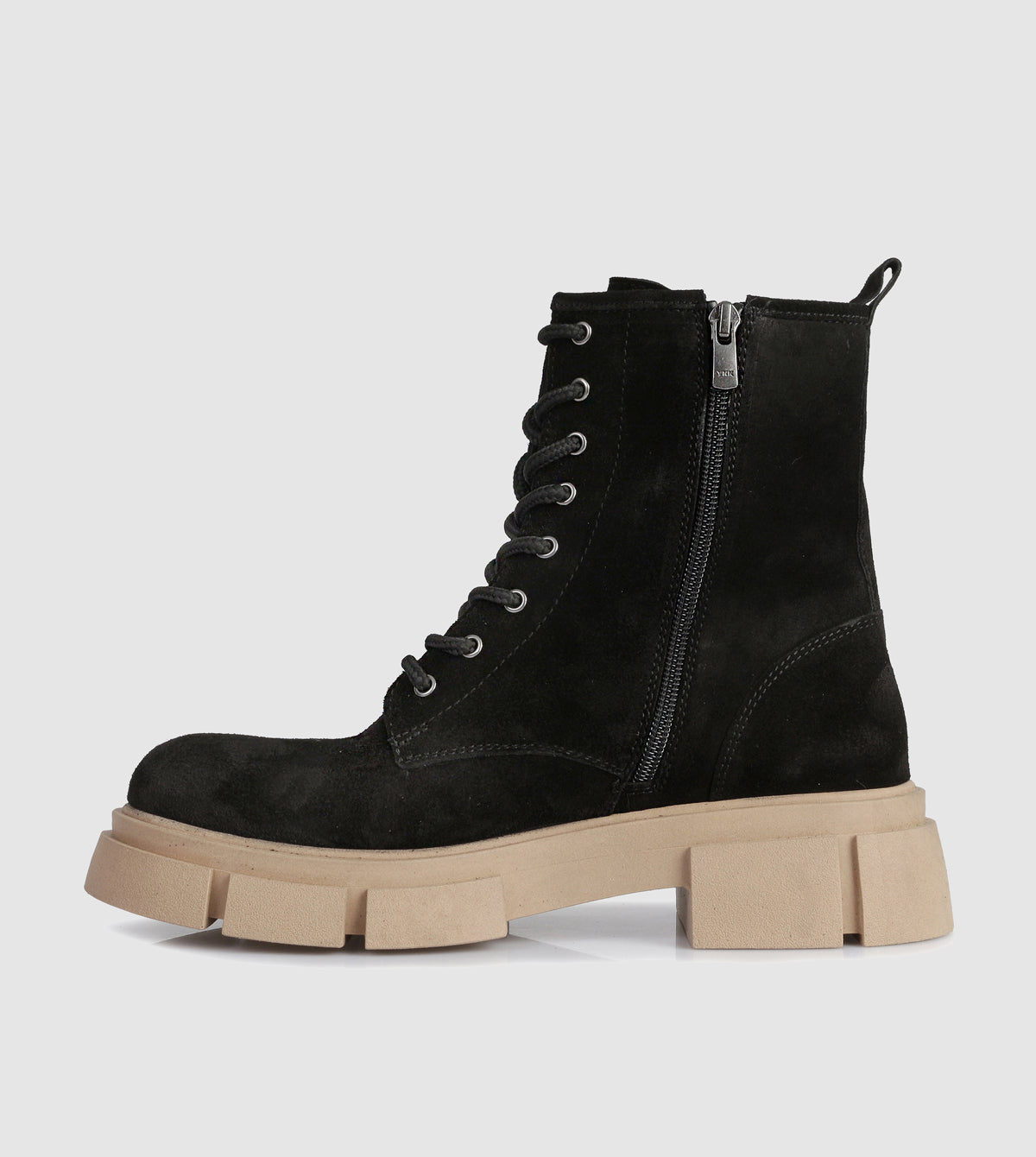 The Chiara Ankle Boots by S Sempre Di are crafted in soft suede and set on a chunky trek sole. They feature a round toe, Combat rubber sole . Wear them as a modern accent to a directional day edit.