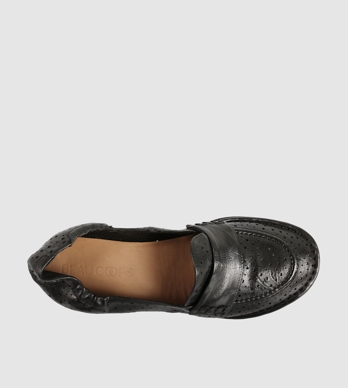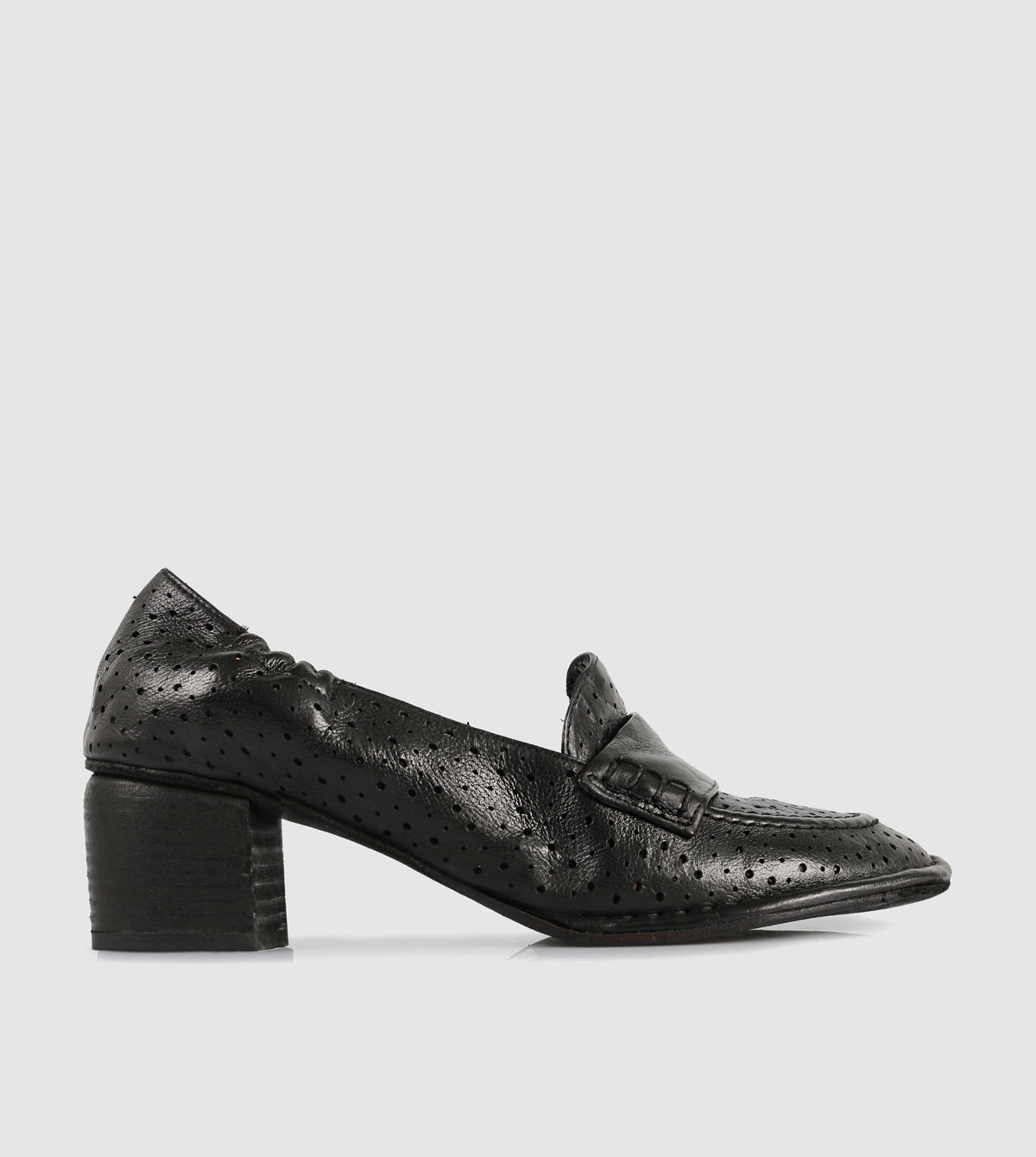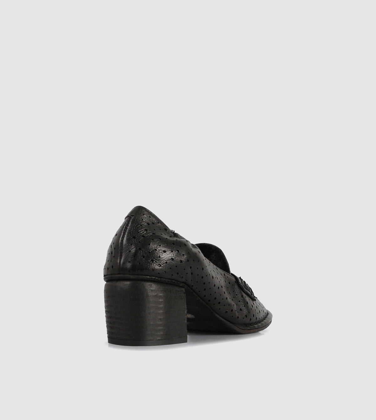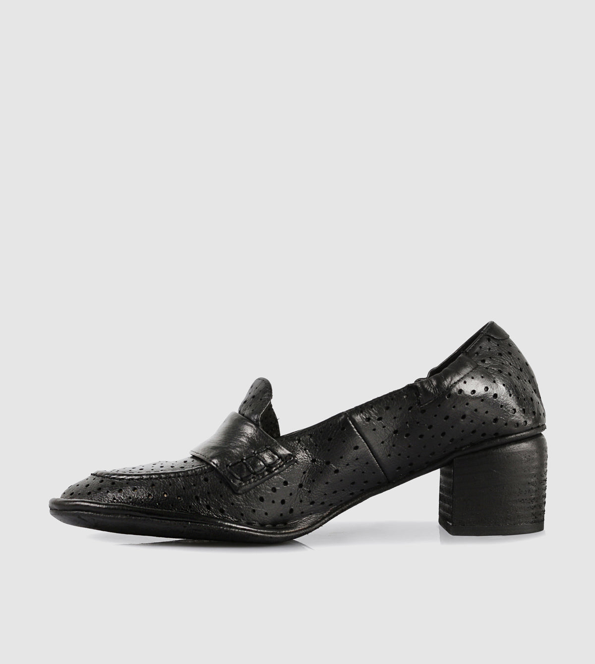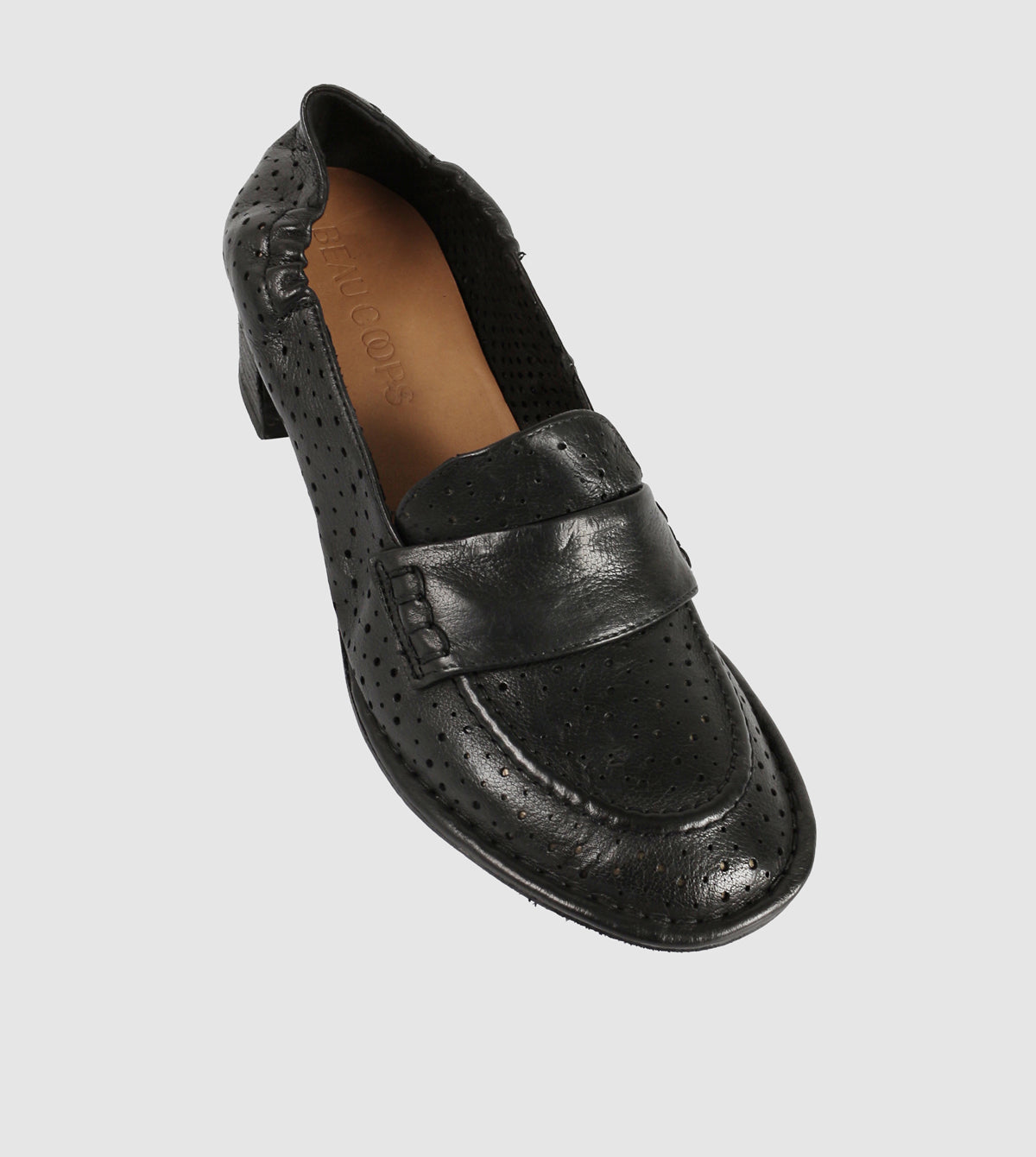 The Aluna Courtshoes by Beau Coops reimagine the classic loafer silhouette with artisanal character and a contemporary edge. Crafted in Italy from perforated leather, they feature a gently ruched topline and penny loafer-style strap across the vamp. Set on a comfortable mid-block heel with a leather sole, these shoes blend structure with softness—perfect for refined daily wear.