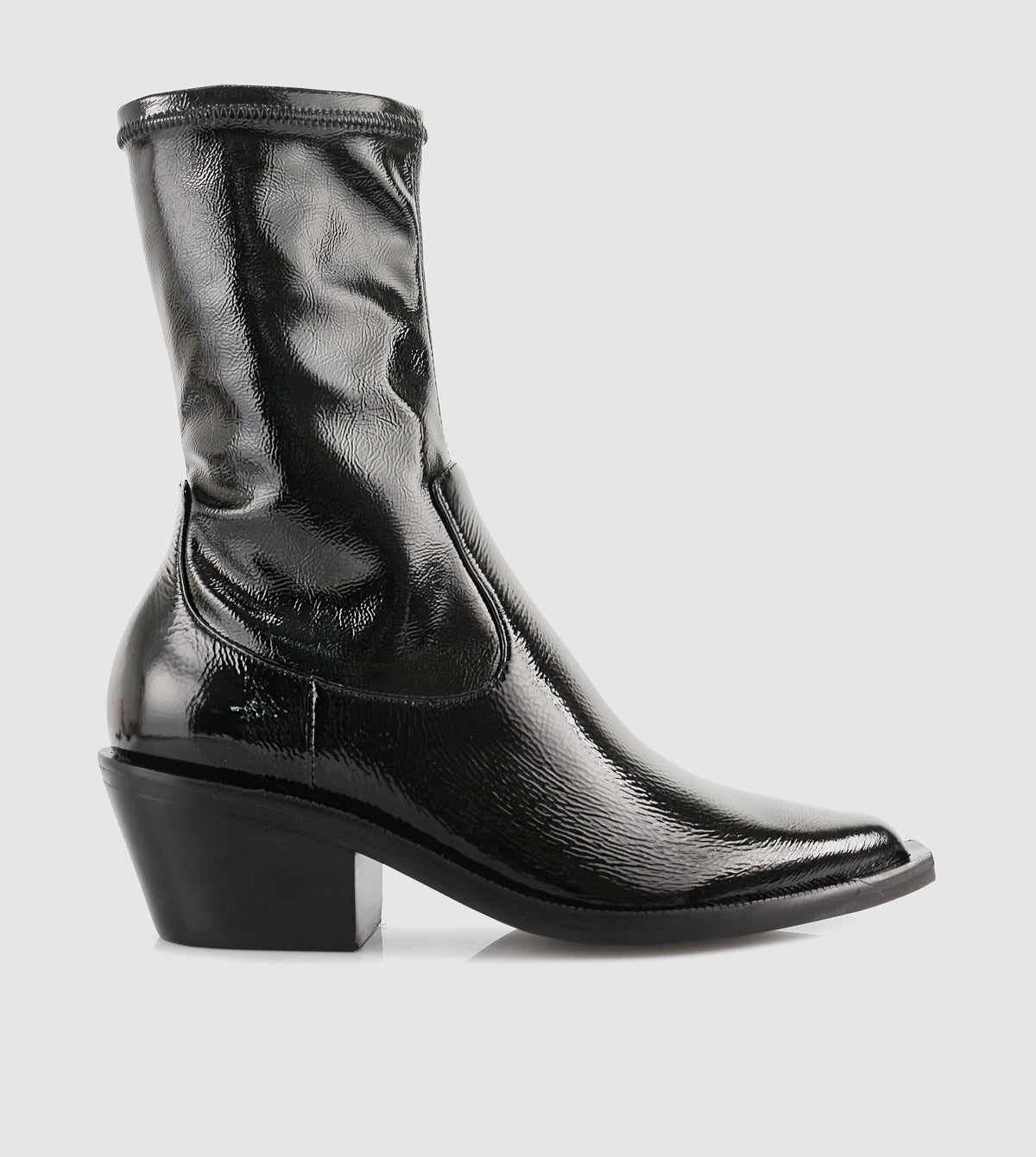 Add a bold edge to your wardrobe with the Jayda Patent Ankle Boots by Sempre Di. Designed with a sleek, glossy finish and a stylish mid-height block heel, these boots offer both statement style and comfort. The soft, stretchable upper ensures a perfect fit, while the pointed toe adds a modern touch. Perfect for pairing with dresses, jeans, or tailored pants, these versatile boots are your go-to choice for day-to-night wear.