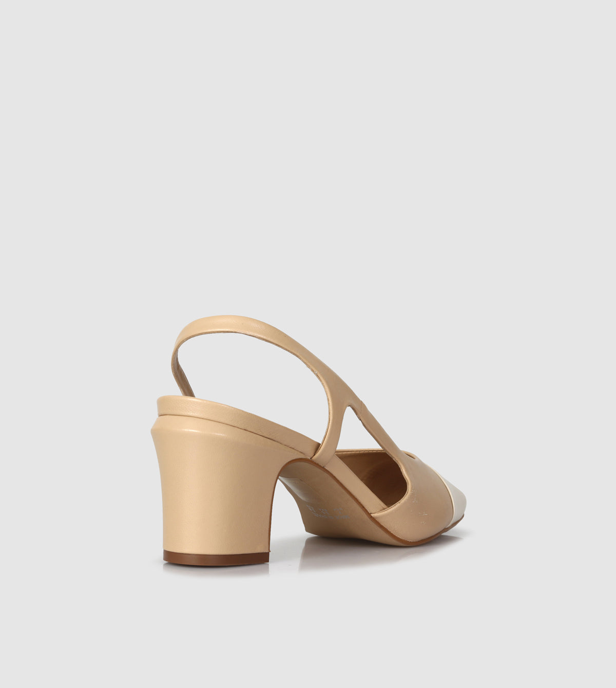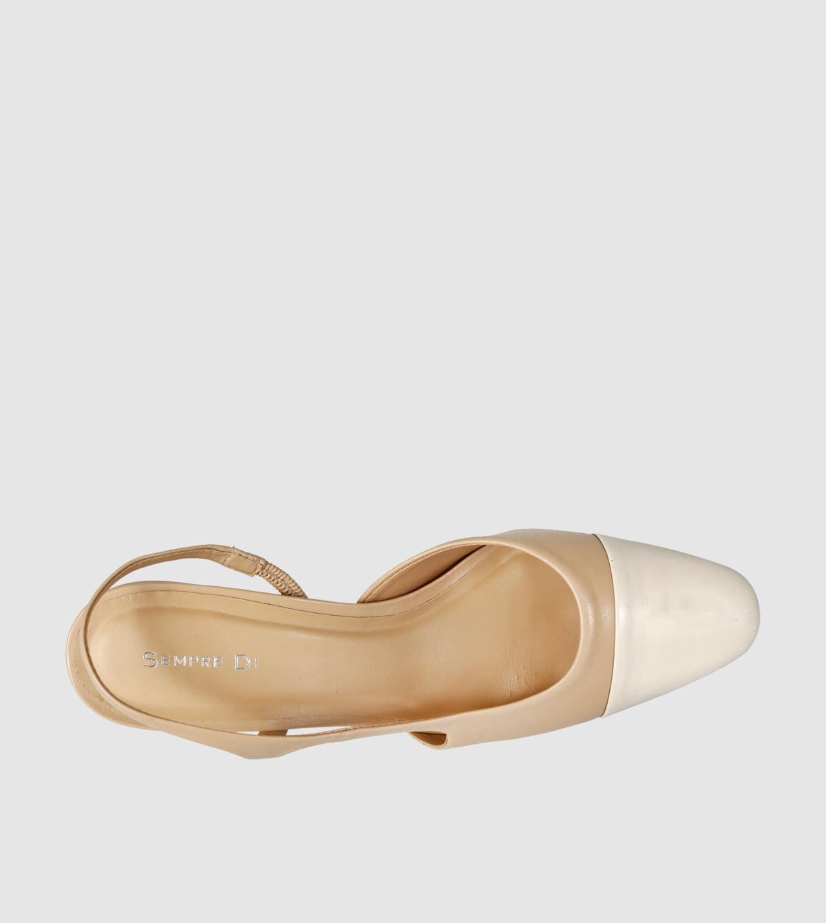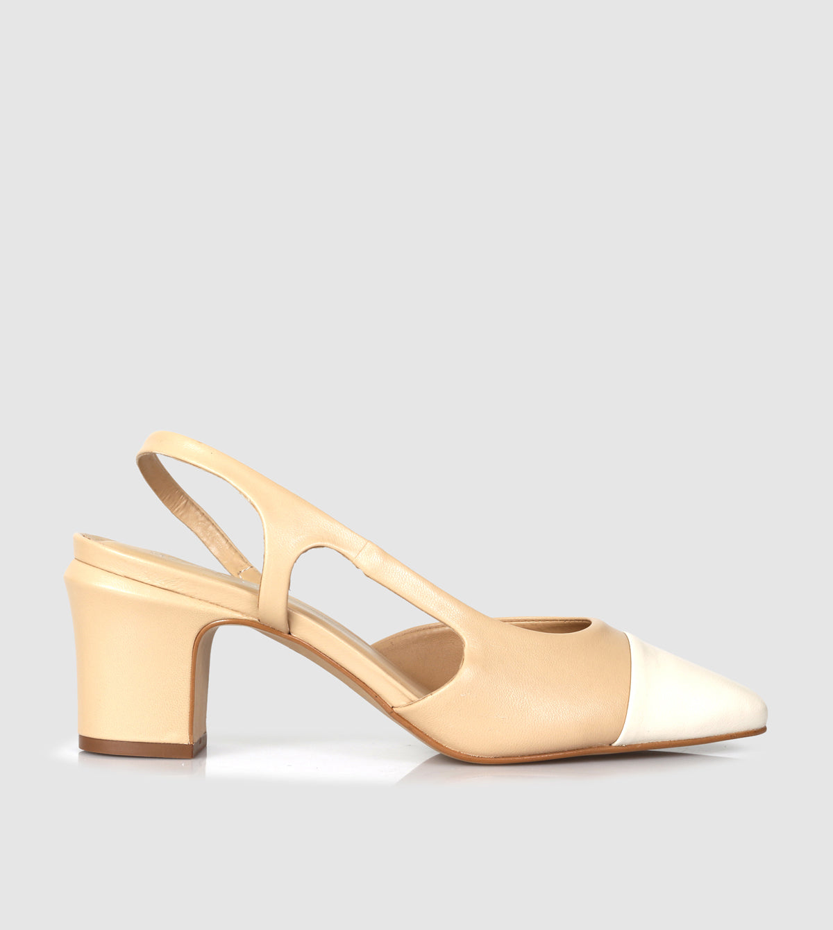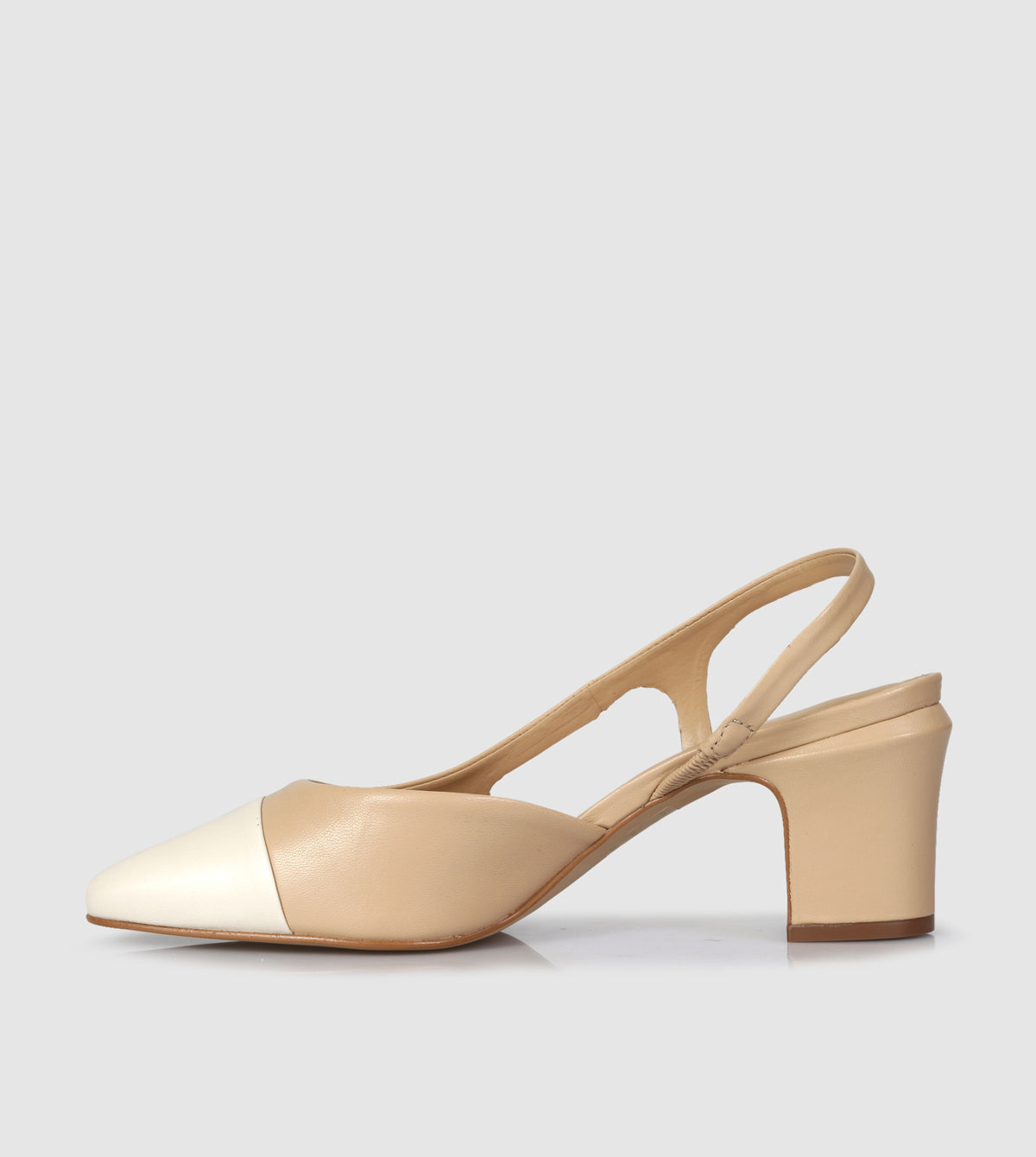 Introducing the Luisa slingbacks by Sempre Di. Made with a soft kid upper in a two-tone combination, these slingbacks offer a style from a bygone era. The block heel features a unique sculptured design, while the soft rounded toe adds a touch of elegance. Elevate your look with these expertly crafted slingbacks.