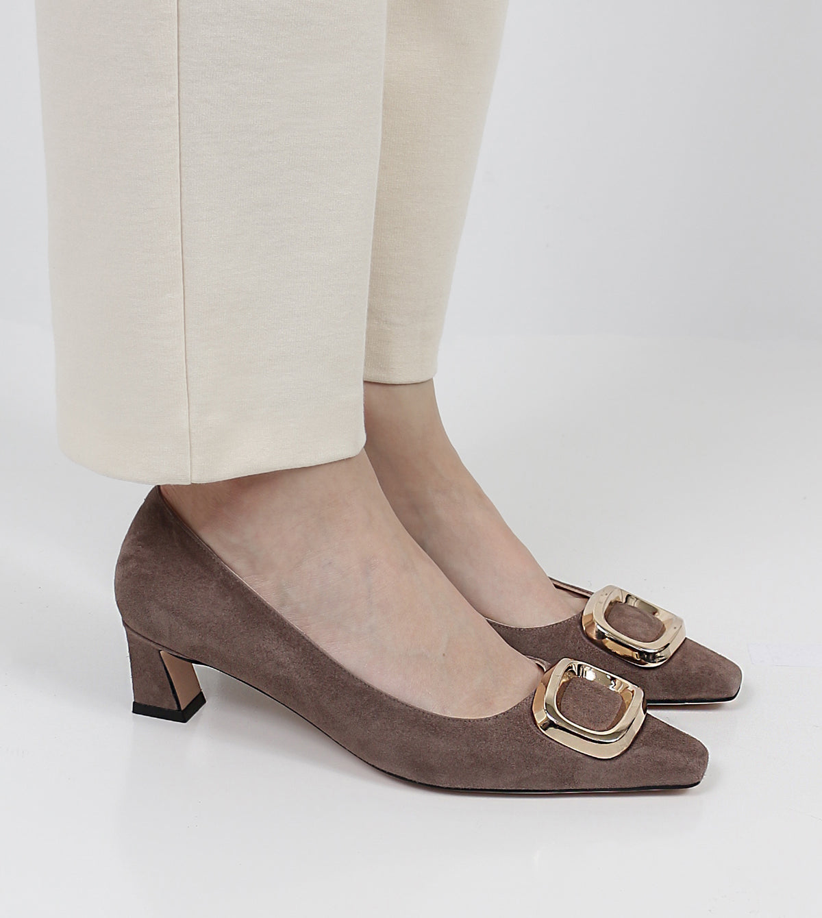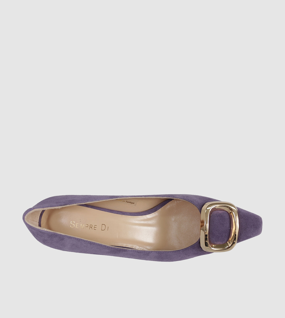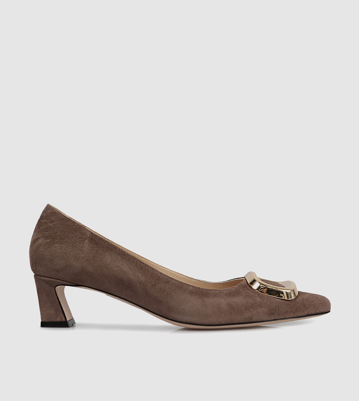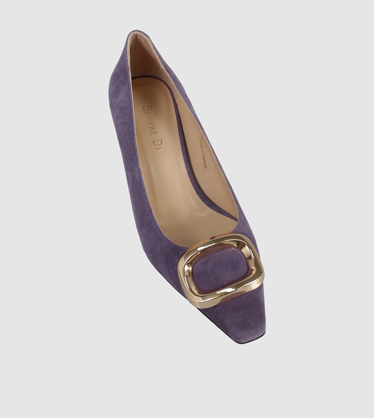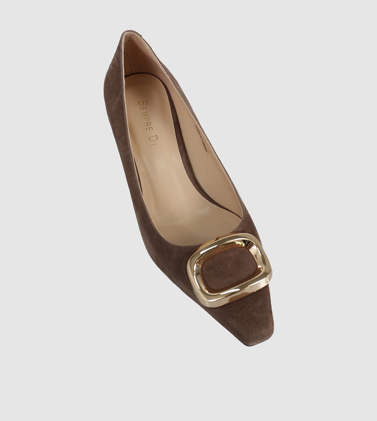 The Kiara Courtshoes by Sempre Di blend feminine charm with refined elegance. Featuring a soft suede finish and a metallic buckle detail on the toe, these mid-heeled court shoes are ideal for both office days and special occasions.