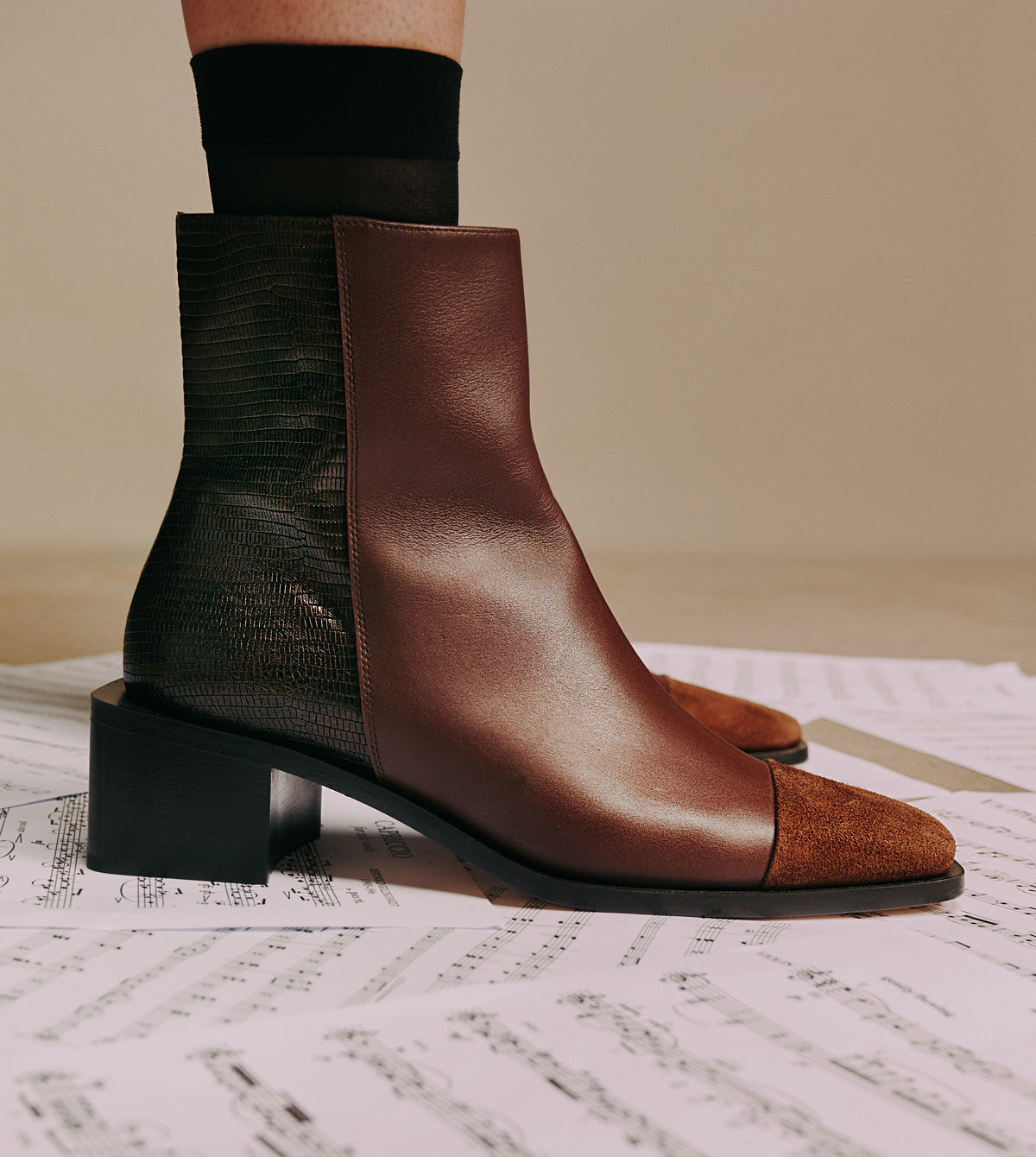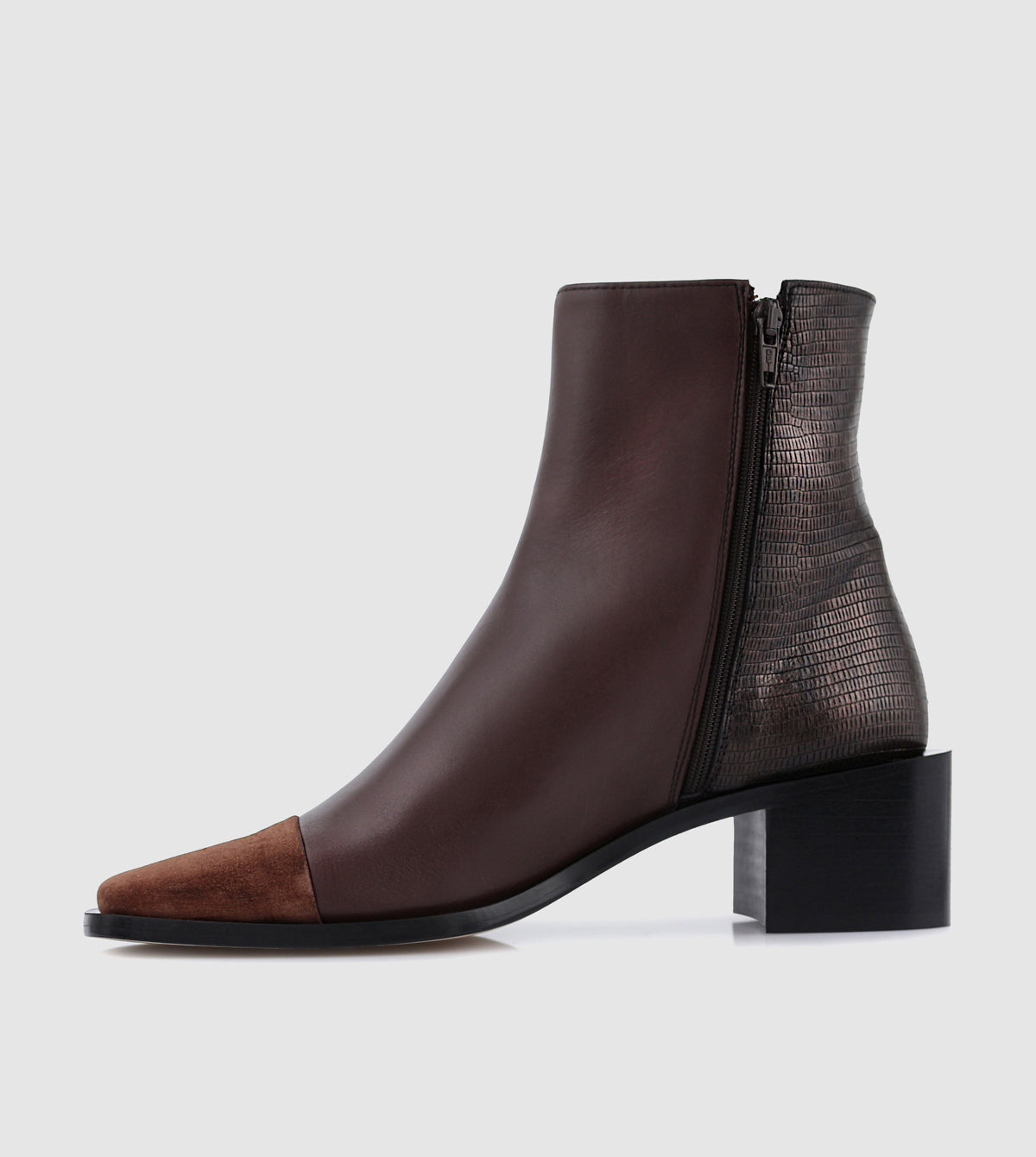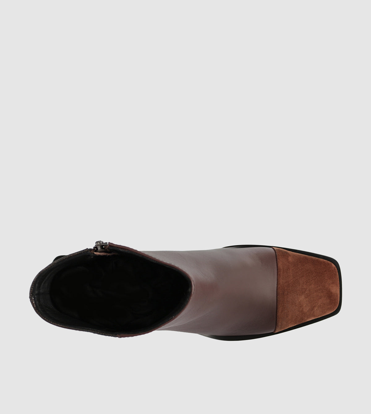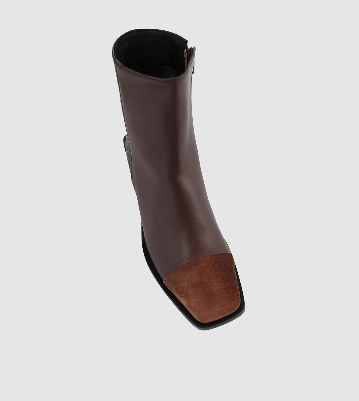 The Abia Ankle Boots by Beau Coops are a sophisticated blend of modern elegance and timeless craftsmanship. Made in Italy, these boots feature a sleek leather upper with a distinctive contrast suede toe cap, adding a contemporary twist to a classic silhouette. The structured square toe and block heel create a bold yet refined look, making them the perfect addition to any wardrobe. Designed for style and comfort, these boots are ideal for pairing with tailored trousers, midi skirts, or your favourite denim for a chic and polished ensemble.