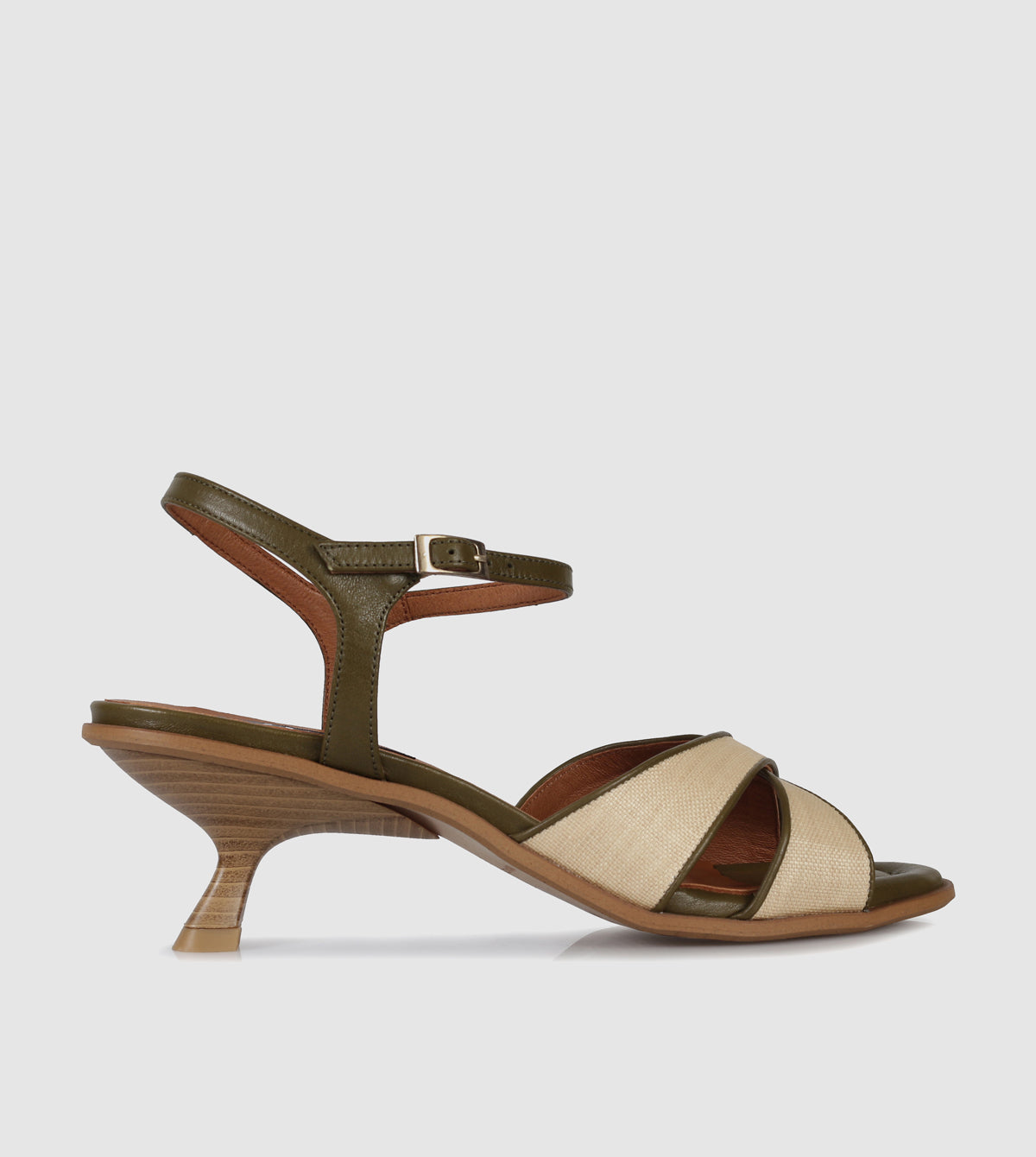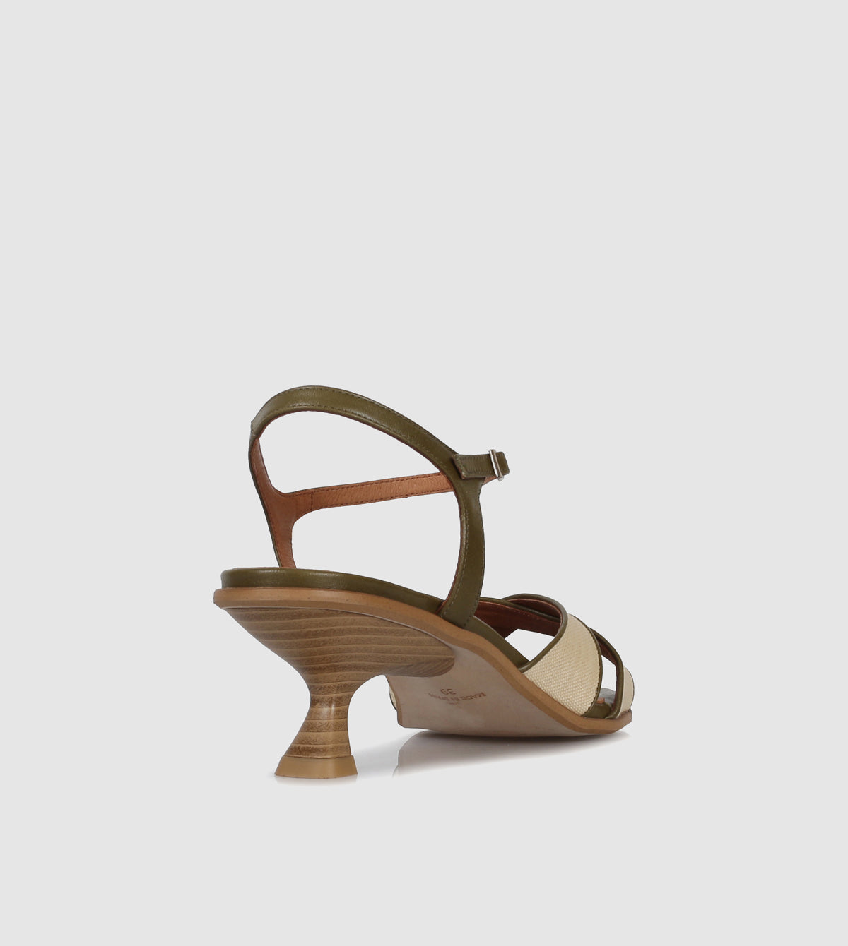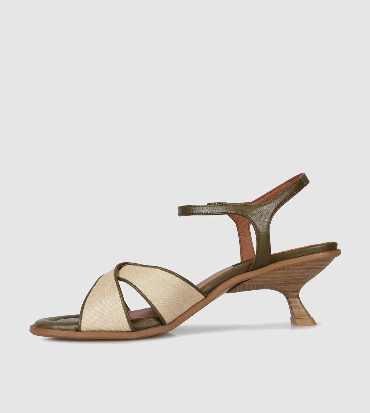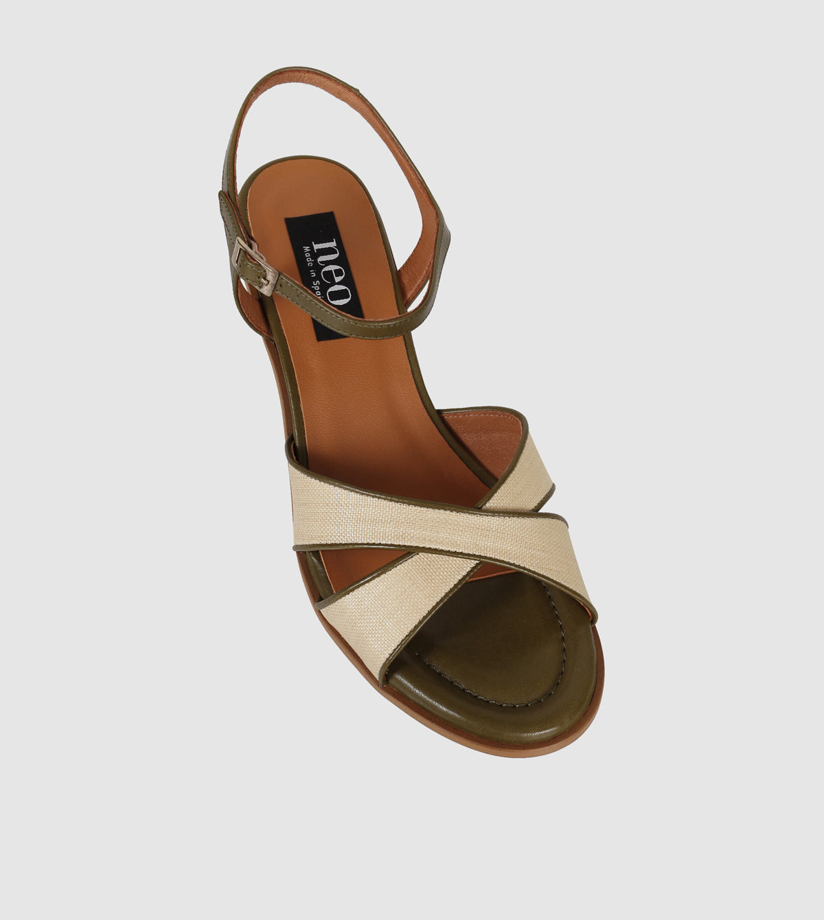 Meet the Kamry Heeled Sandals by Neo, featuring a stylish kitten heel, blending comfort with elegance. Available with either black or khaki accents, the design combines leather with beige cross-over straps, offering a refined, earthy aesthetic. With an adjustable ankle strap for a secure fit, this versatile sandal is perfect for day-to-night wear, adding a touch of sophistication to both casual and dressy outfits.
