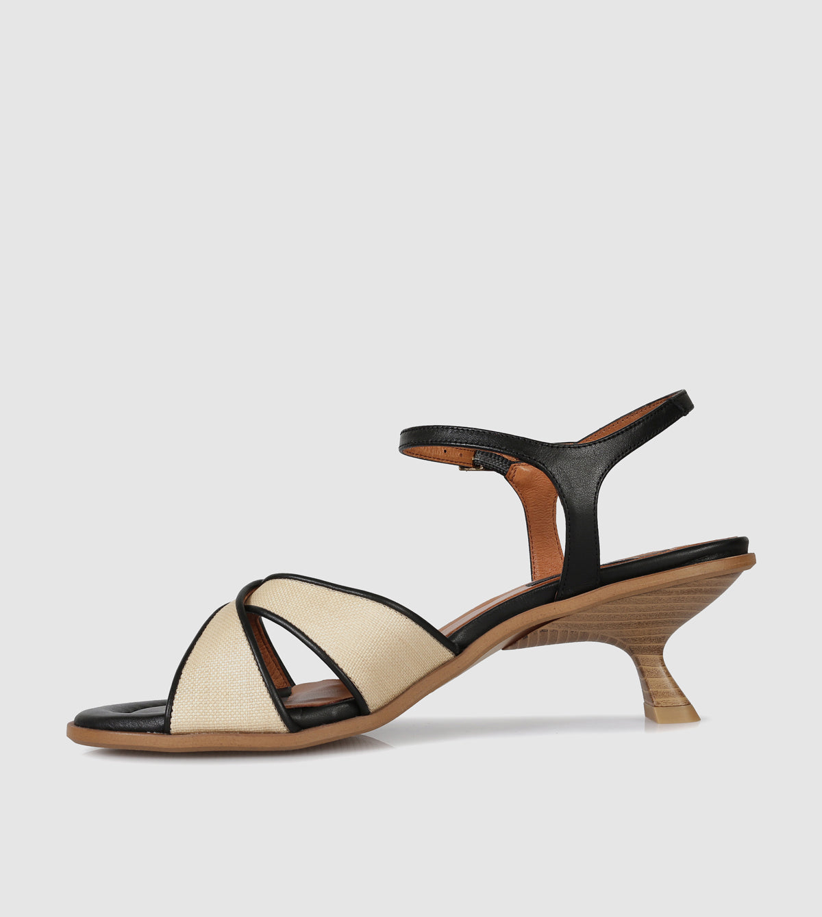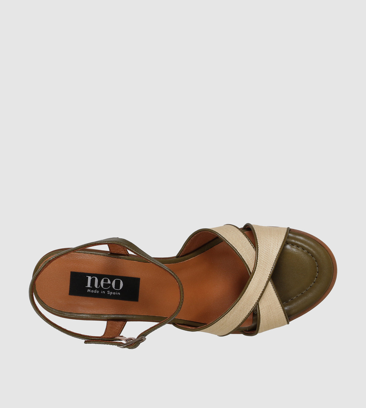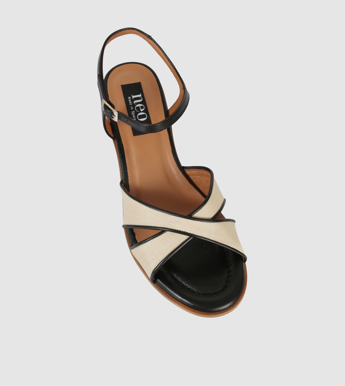 Meet the Kamry Heeled Sandals by Neo, featuring a stylish kitten heel, blending comfort with elegance. Available with either black or khaki accents, the design combines leather with beige cross-over straps, offering a refined, earthy aesthetic. With an adjustable ankle strap for a secure fit, this versatile sandal is perfect for day-to-night wear, adding a touch of sophistication to both casual and dressy outfits.