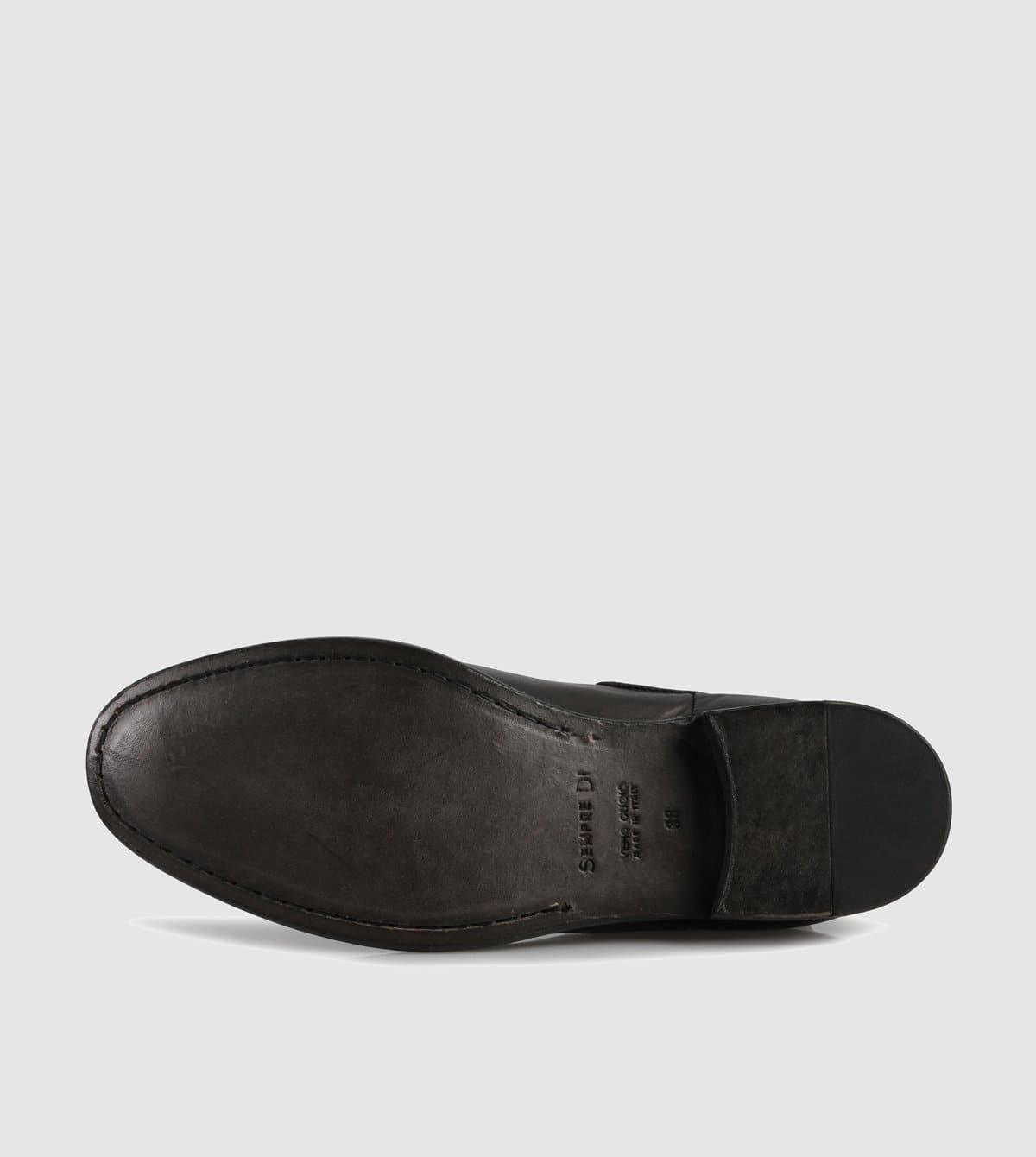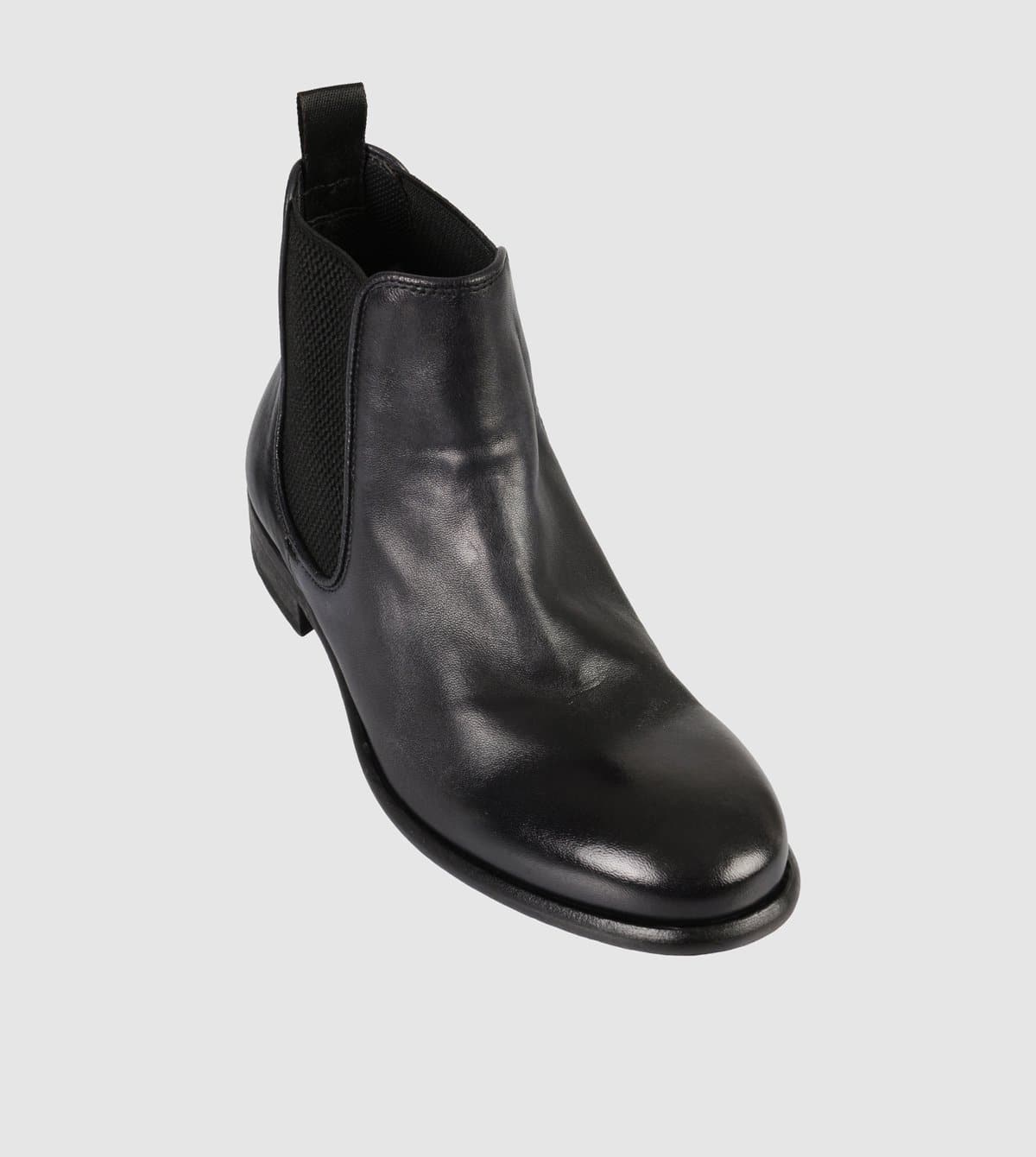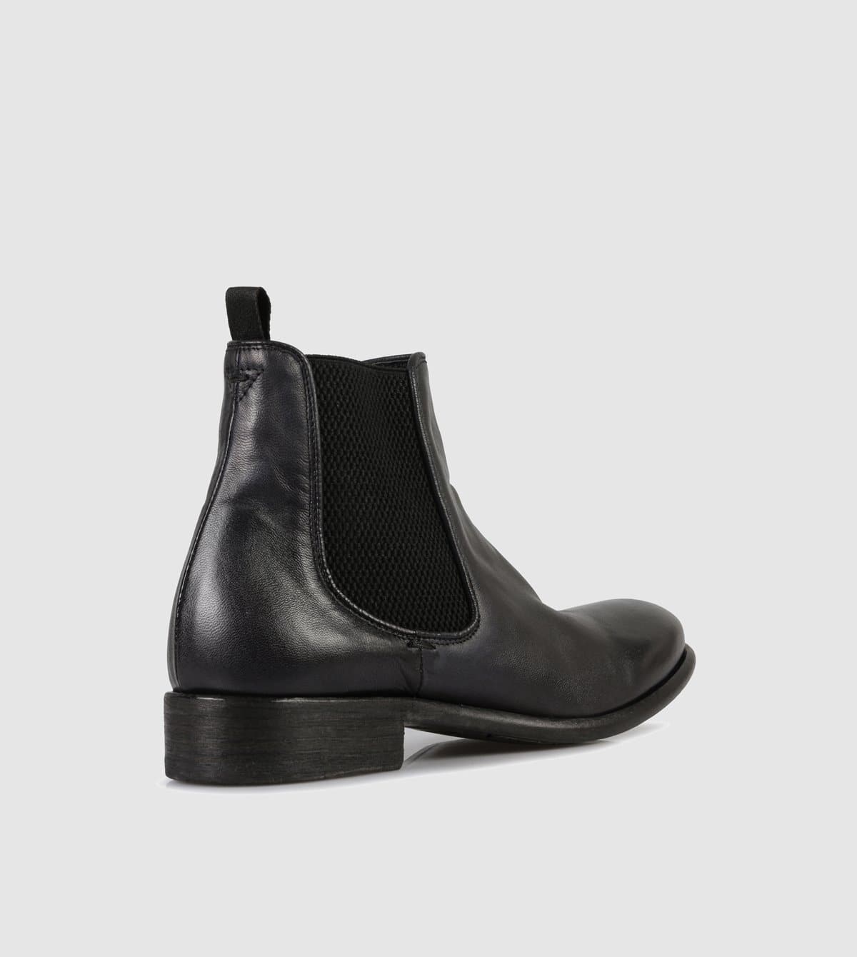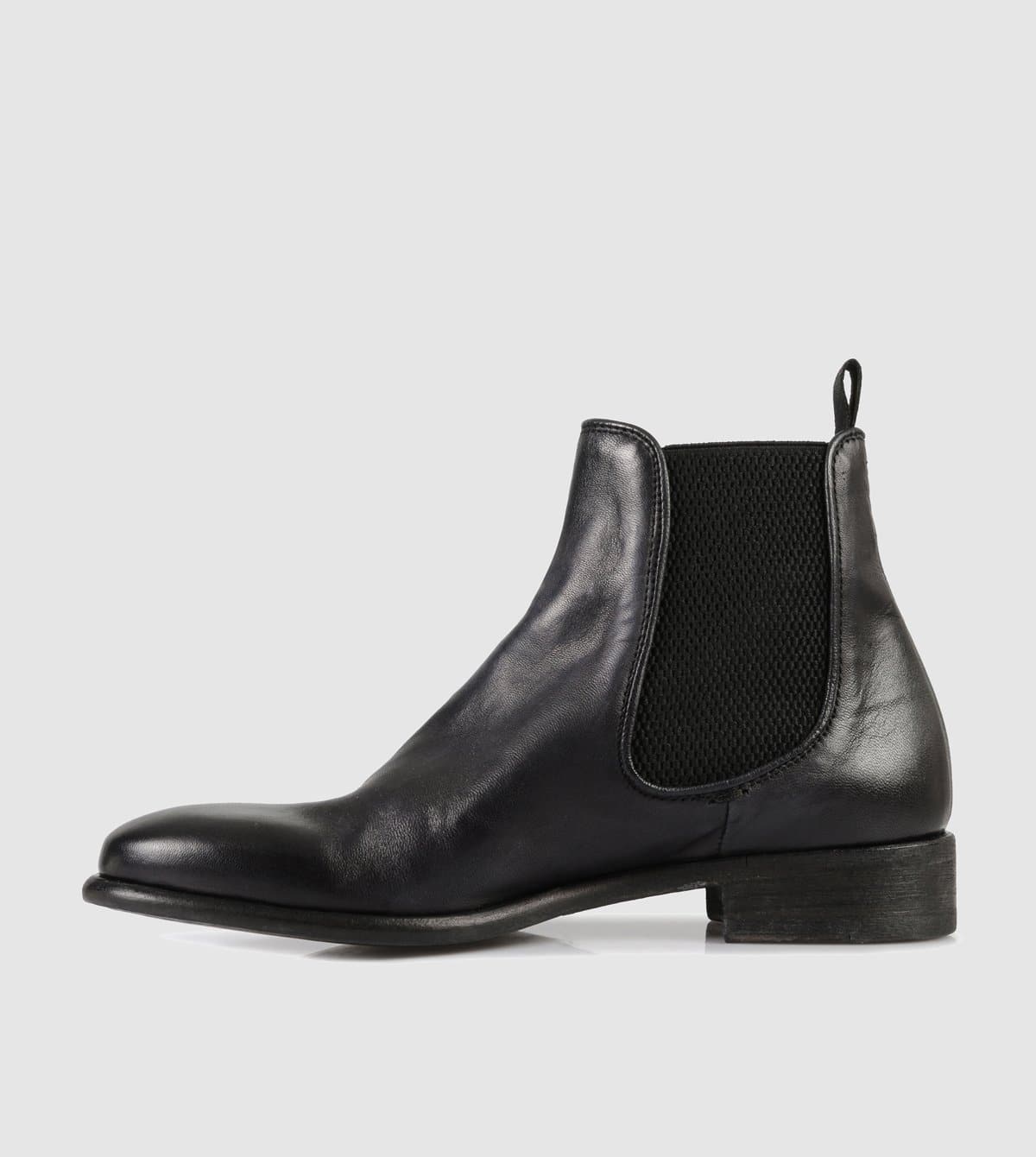 The Betols Kiss Ankle Boots by Sempre Di are made in Italy, with shine-finish leather in black or brown. A roughed-up Chelsea boot with an upturned toe, low heel, and thick, elasticated side gussets. The chic way to channel worker-boot style.- Confort padded insole