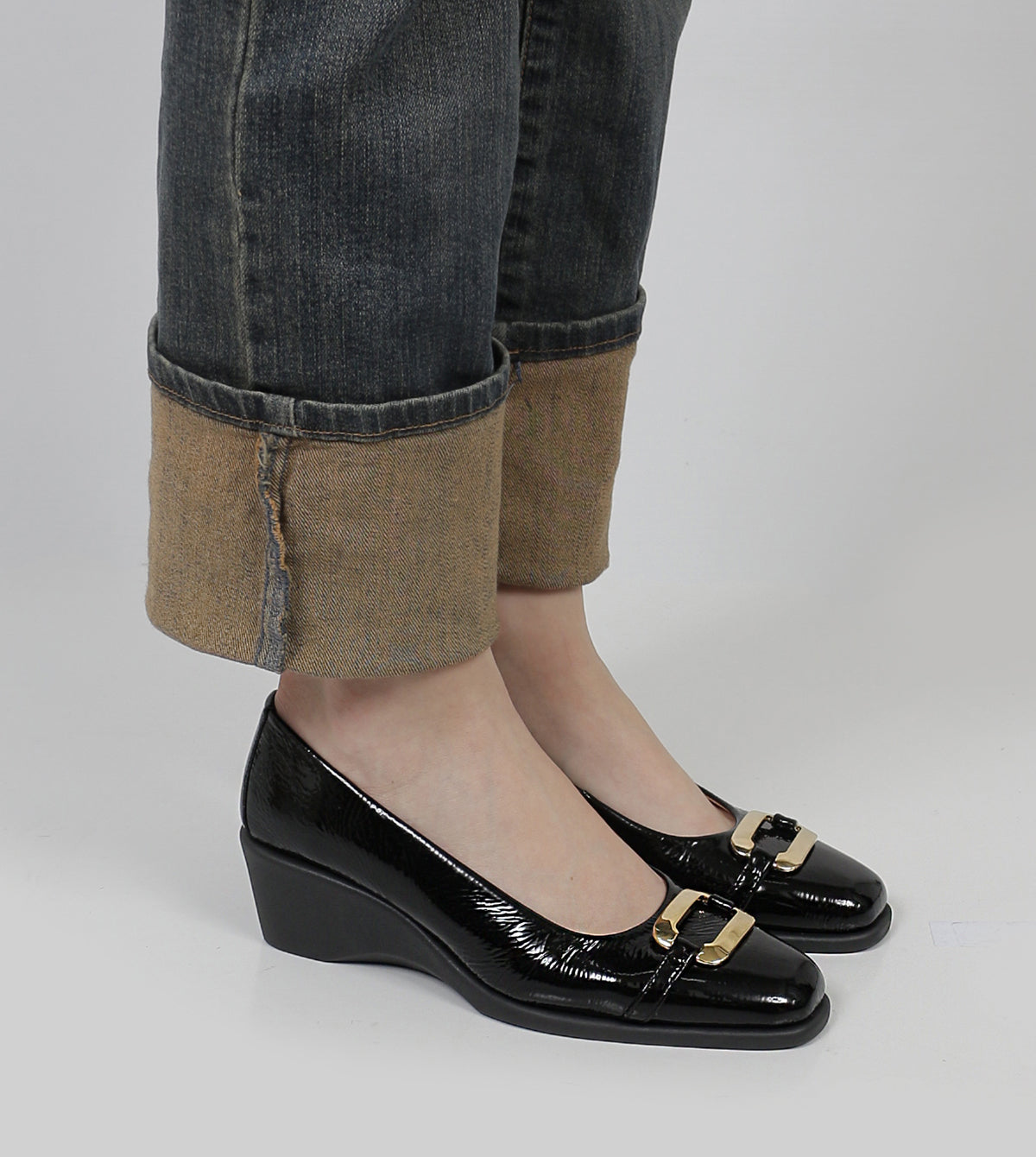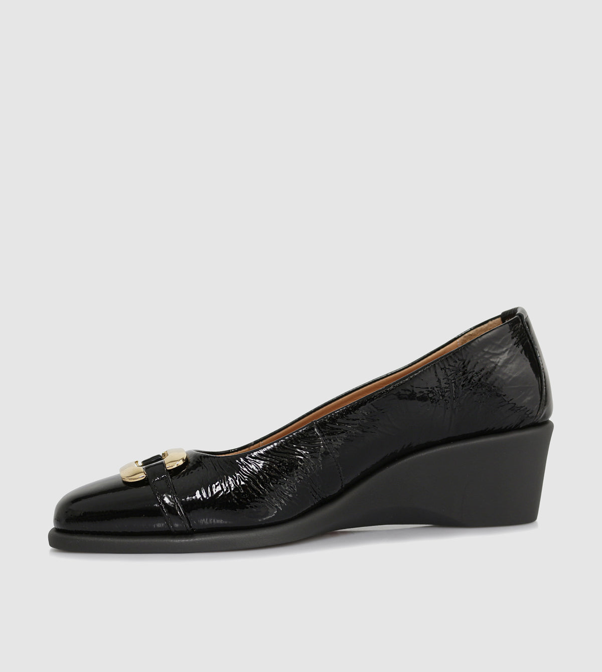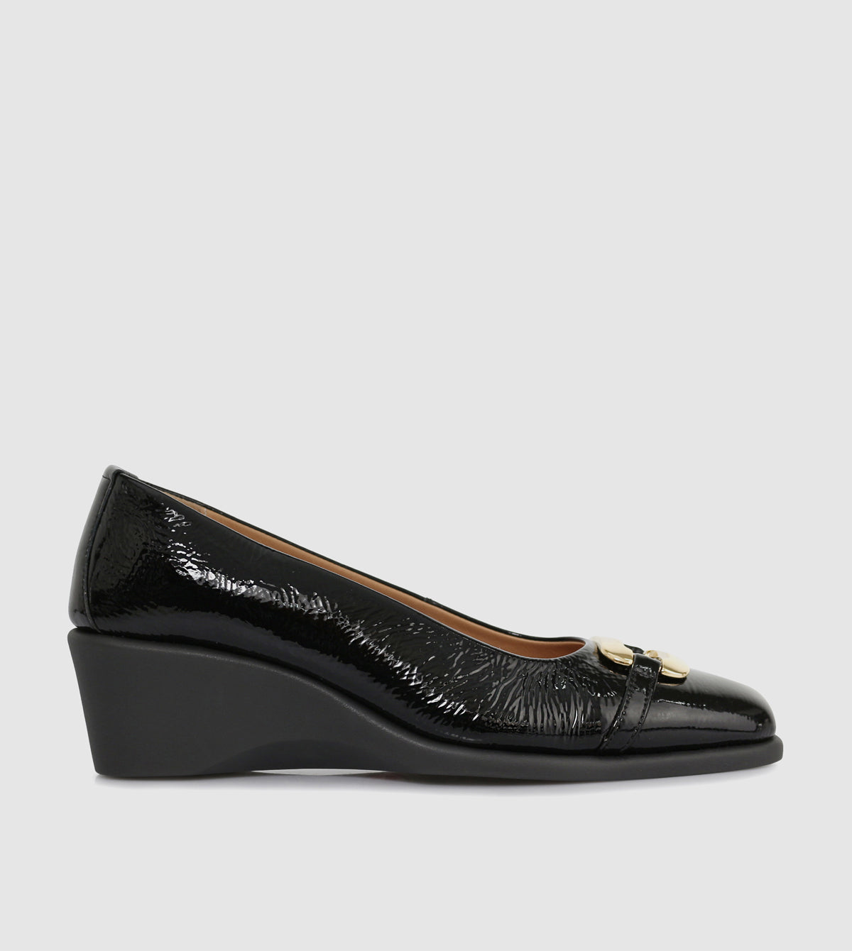 The Seraphina Courtshoes by Relax deliver a polished look with everyday practicality. Featuring a sleek patent finish and chic chain detail, these wedge court shoes offer stylish elevation and exceptional comfort.