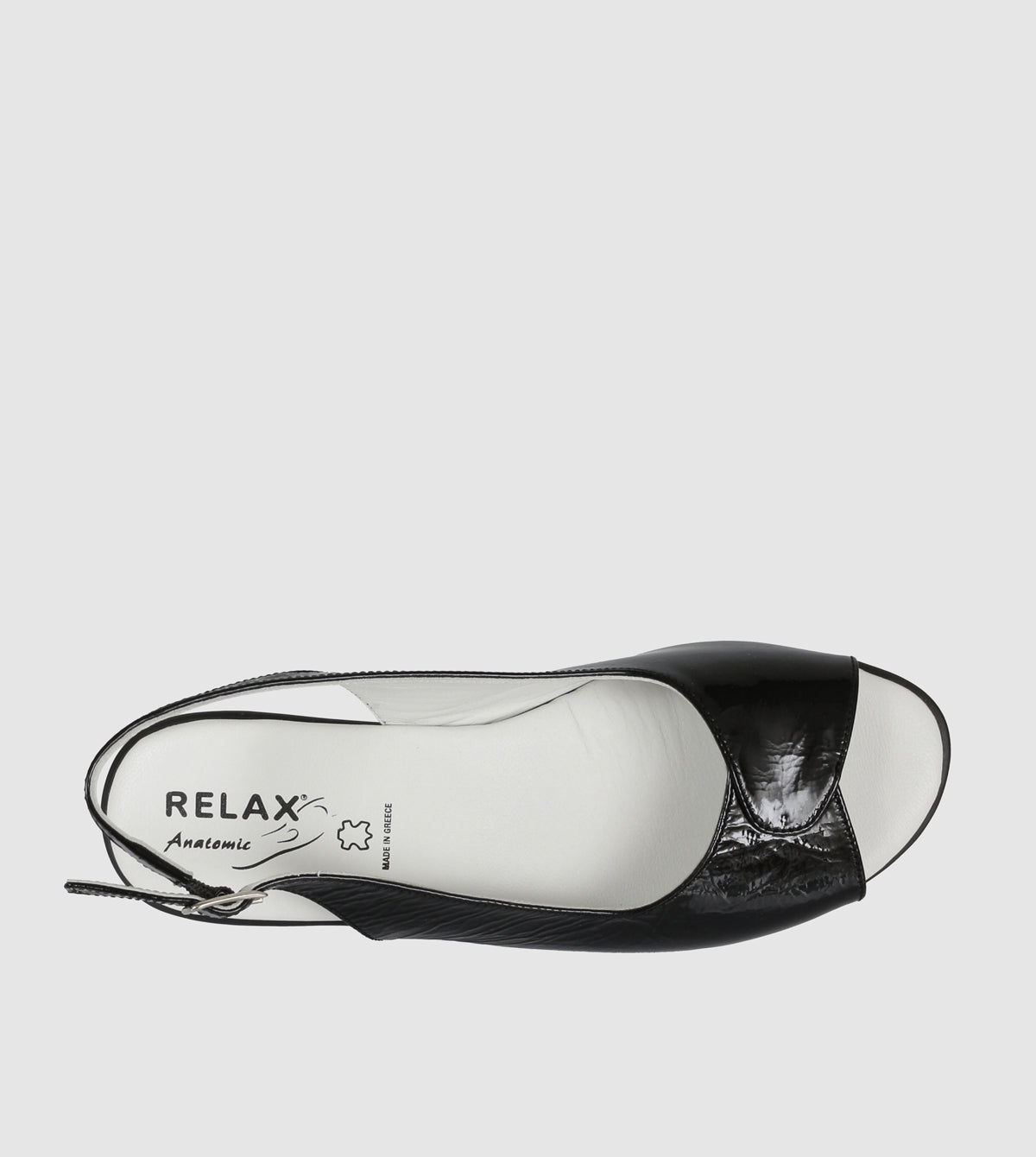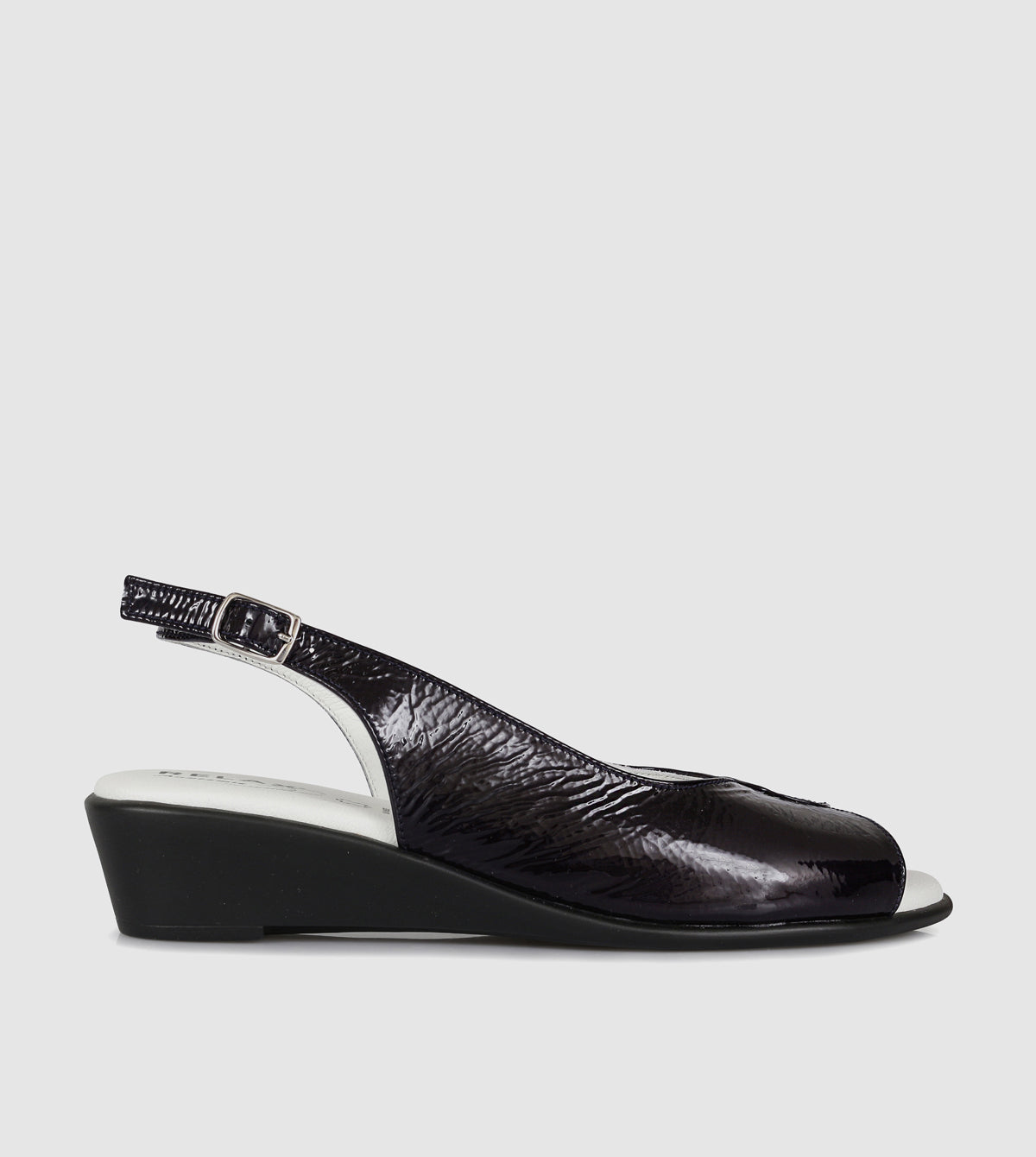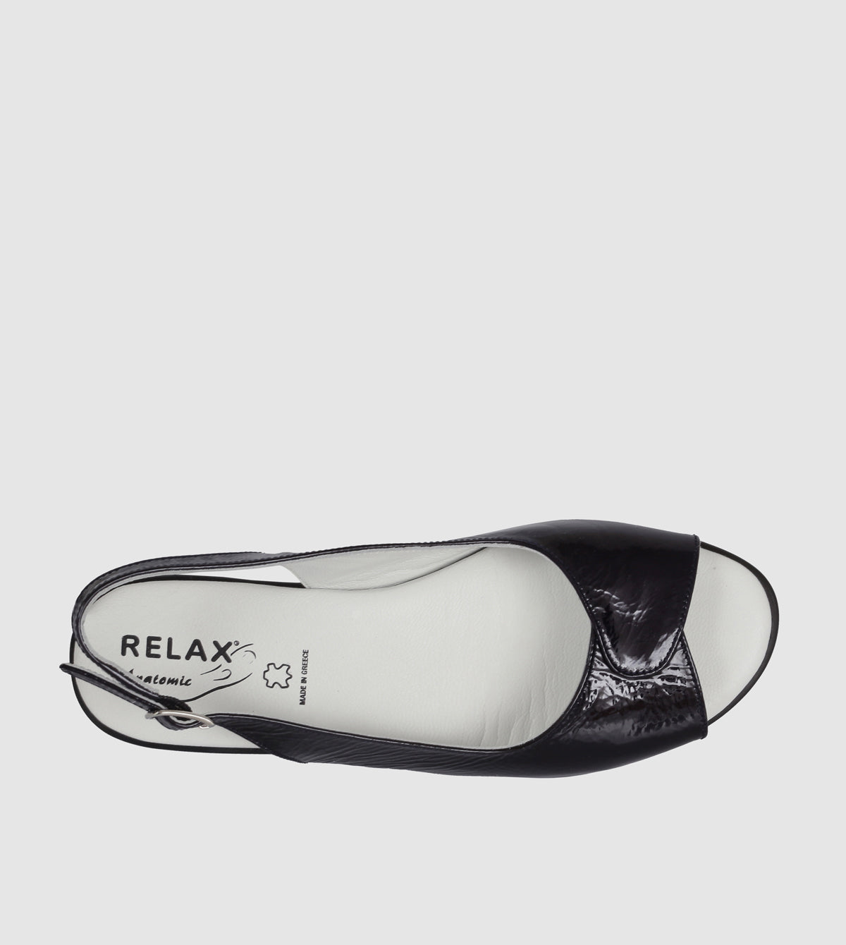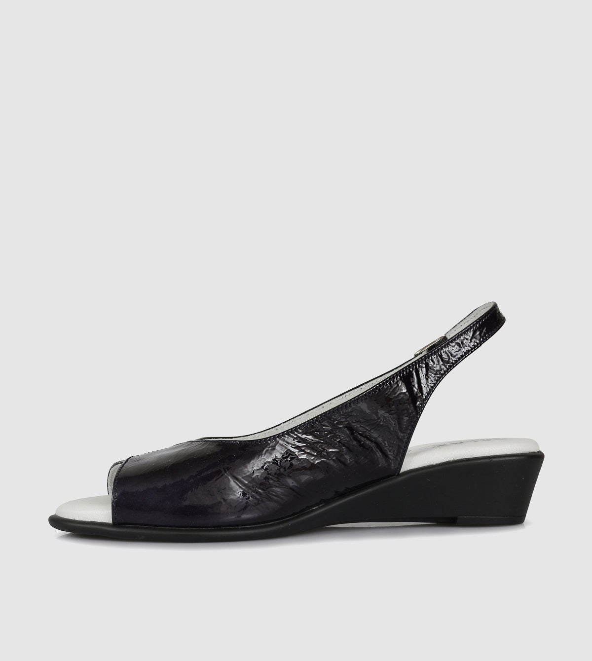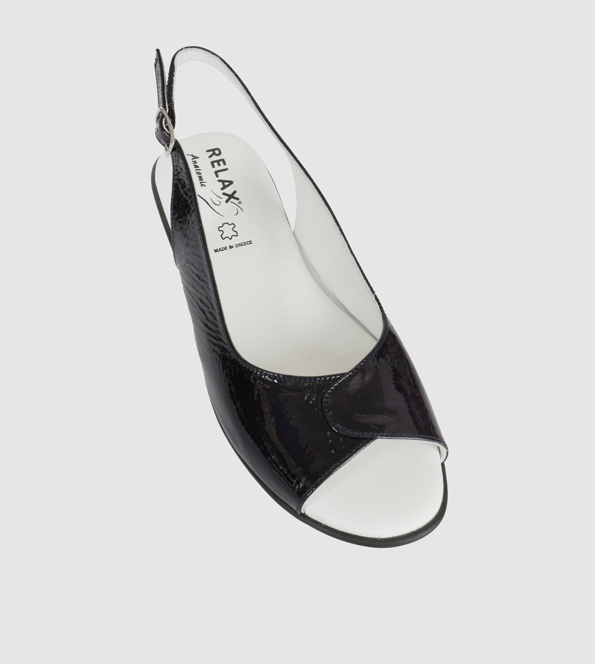 Meet the Eleni sandals by Relax, combining classic style with comfort, perfect for day-to-evening wear. Available in black or navy, it features a sleek patent finish with a low wedge heel for subtle lift and all-day ease. The adjustable ankle strap ensures a secure fit, while the open-toe design adds a touch of sophistication. Ideal for pairing with both casual and dressy outfits, this versatile sandal brings effortless style to any occasion.