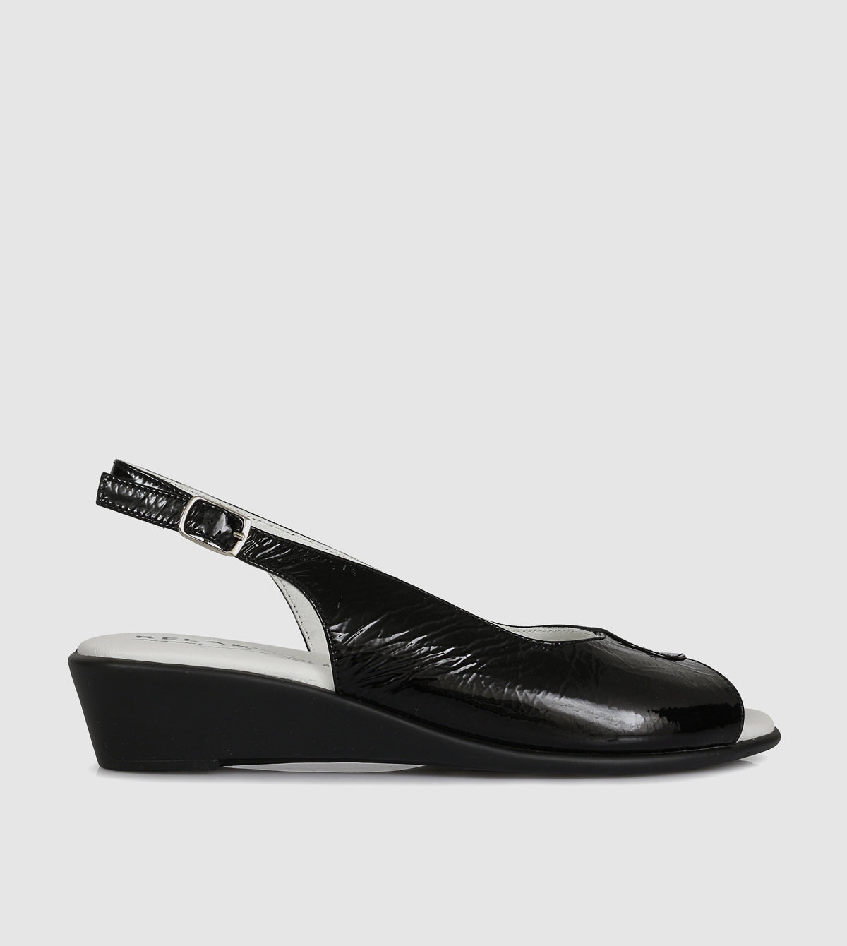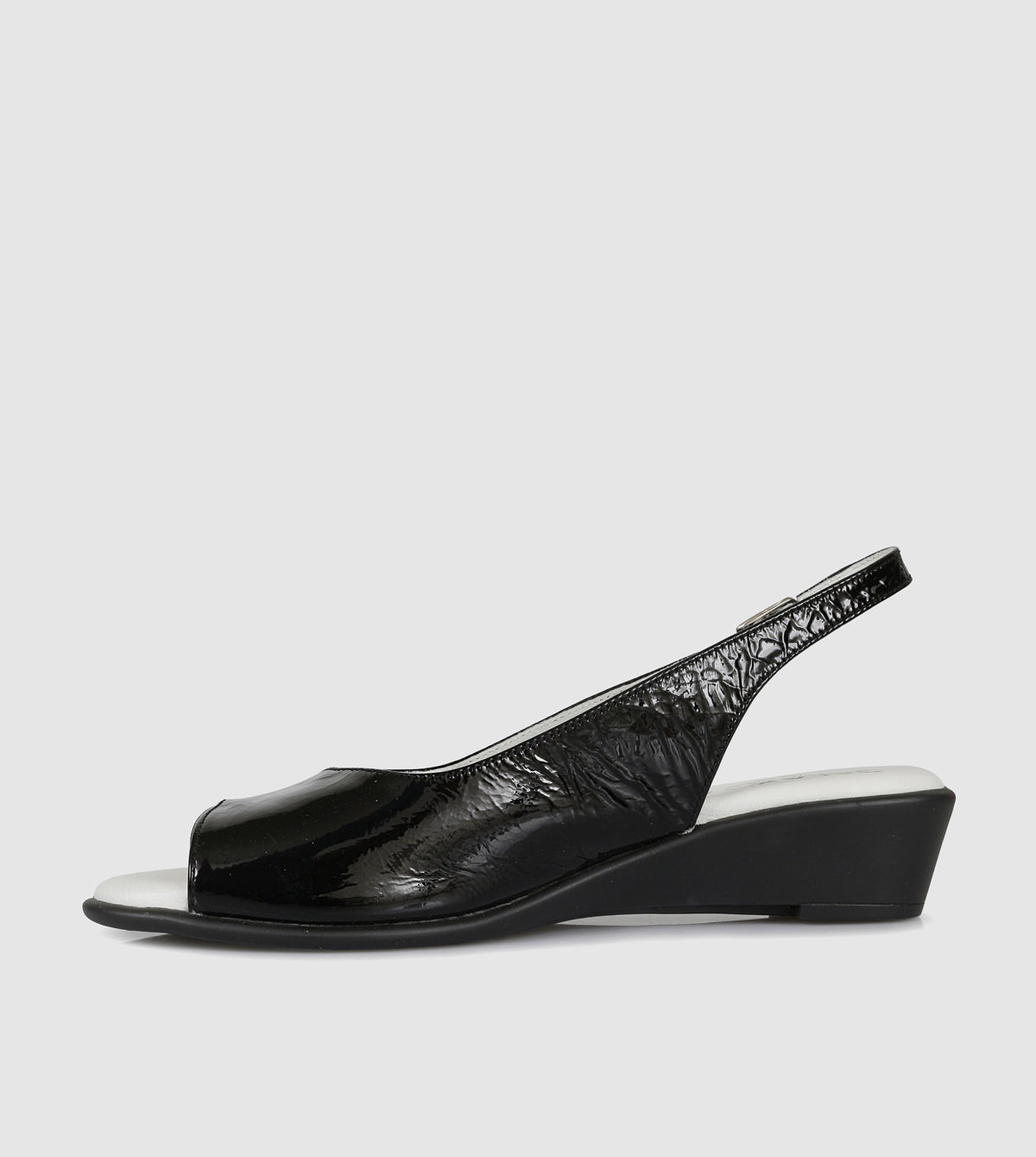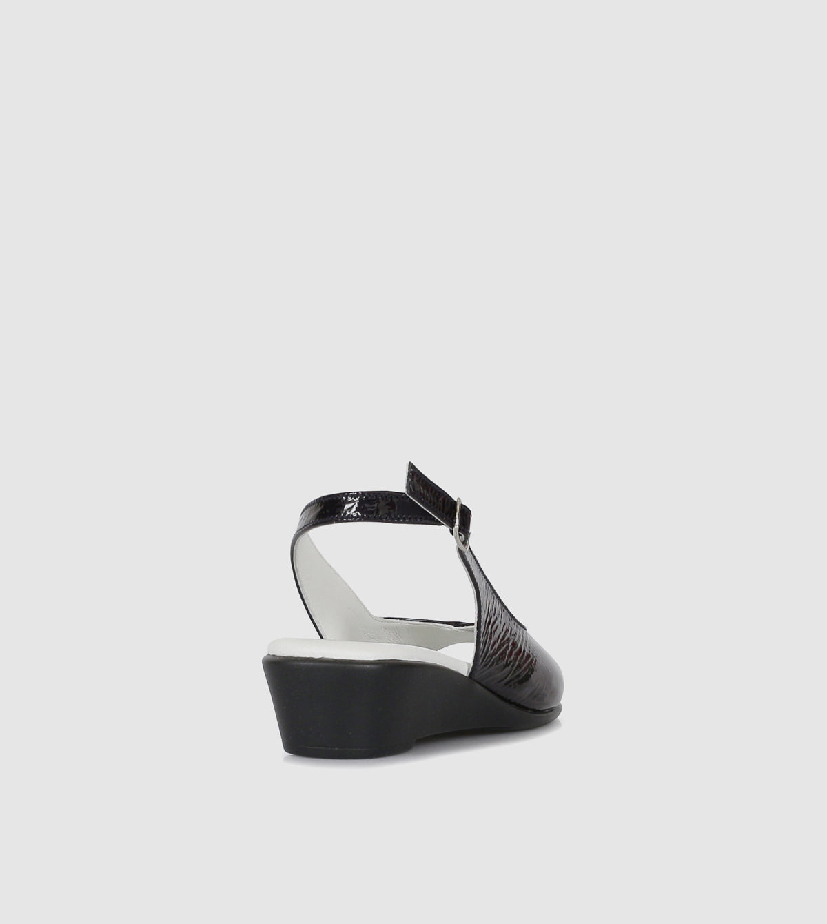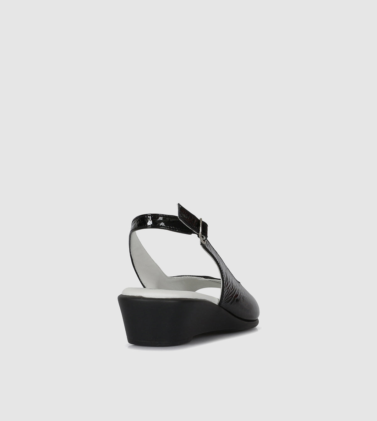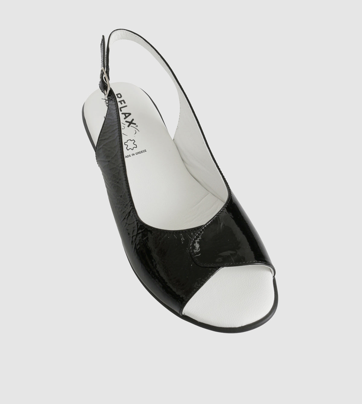 Meet the Eleni sandals by Relax, combining classic style with comfort, perfect for day-to-evening wear. Available in black or navy, it features a sleek patent finish with a low wedge heel for subtle lift and all-day ease. The adjustable ankle strap ensures a secure fit, while the open-toe design adds a touch of sophistication. Ideal for pairing with both casual and dressy outfits, this versatile sandal brings effortless style to any occasion.
