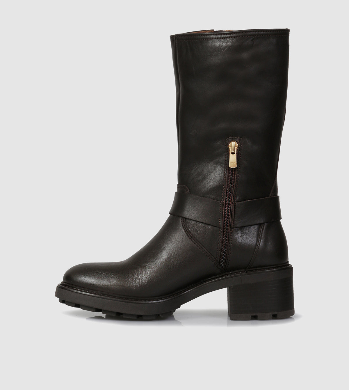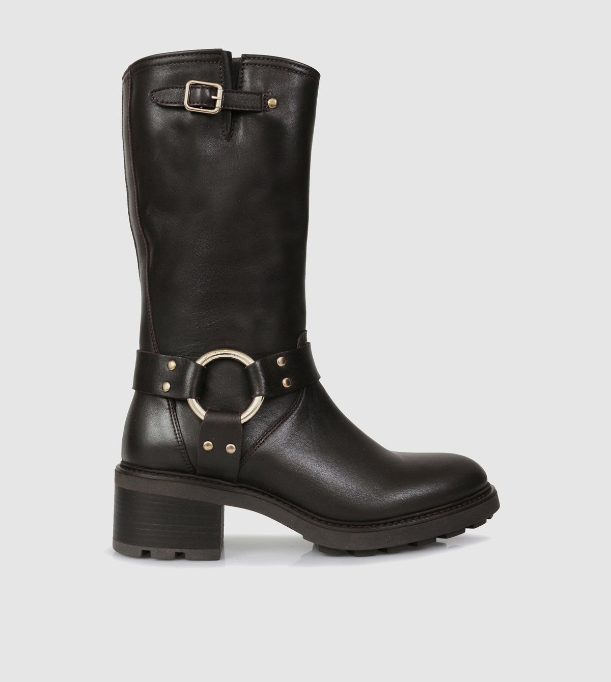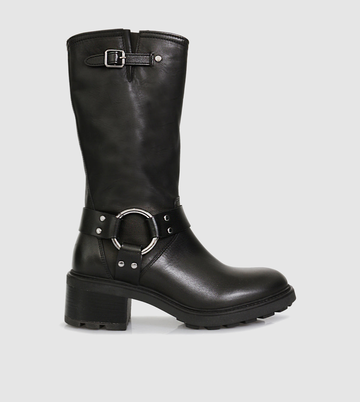 Expertly crafted with polished leather, the Rylee Mid Calf Boots by Sempre di feature a bold rounded toe and a cleated rubber sole for added traction. The sturdy block heel provides comfort and style, while the internal zip allows for easy on and off. The iconic metal ring and strap ankle feature complete these versatile biker boots.