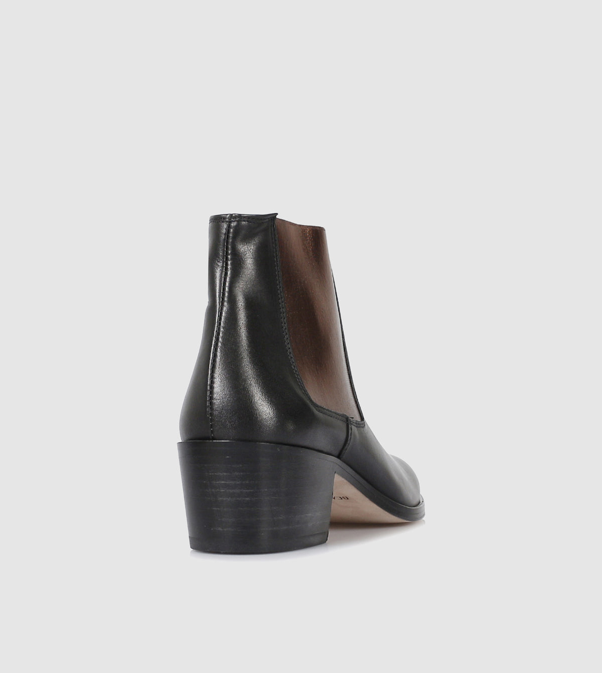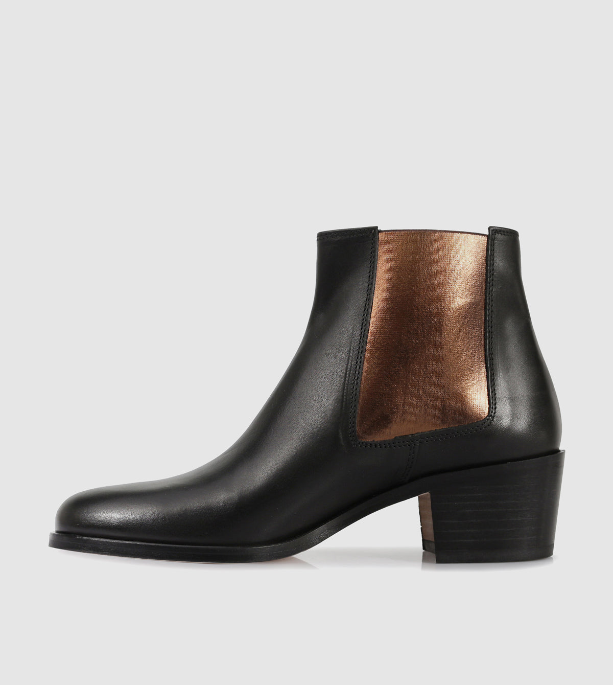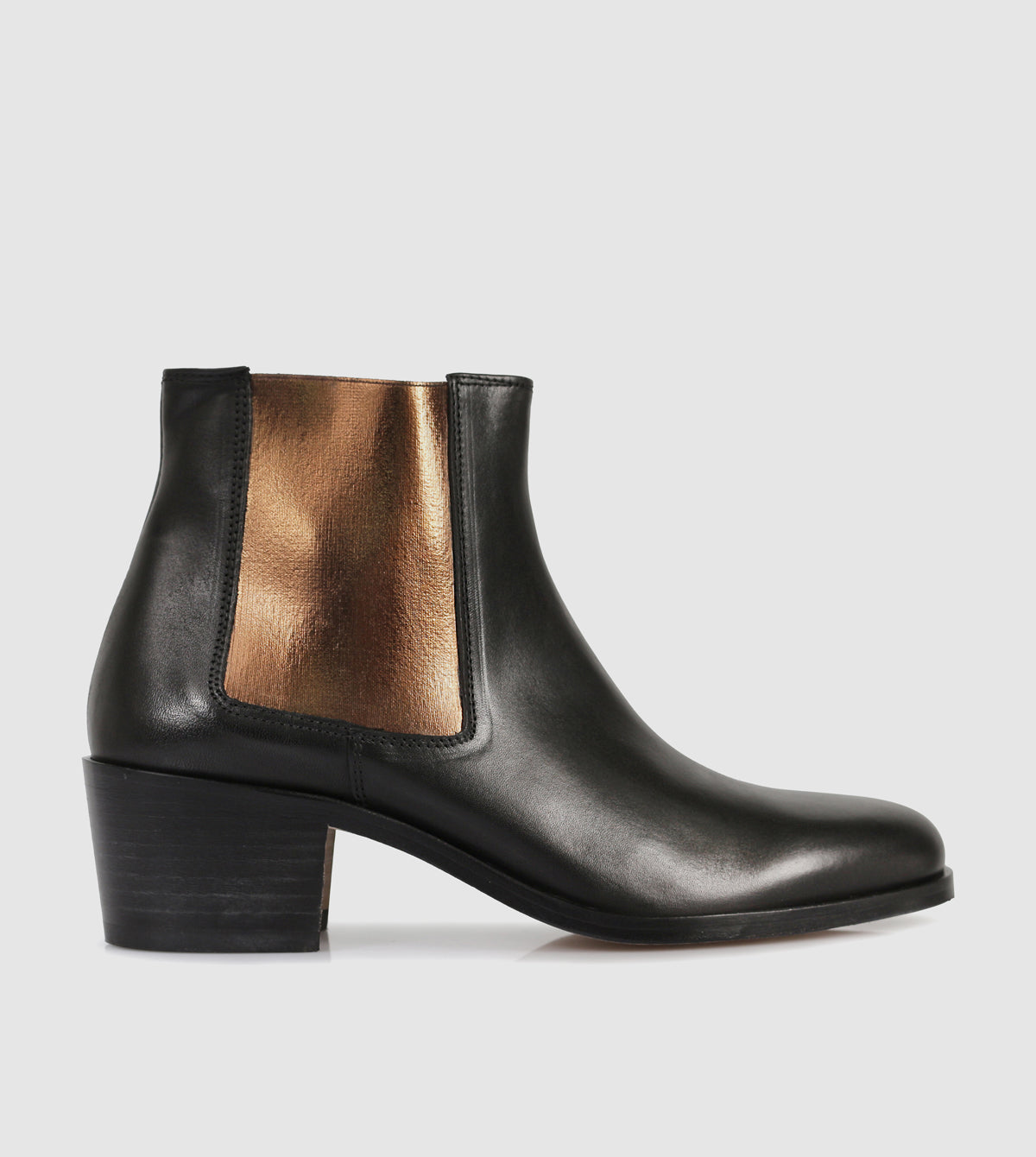 The Jerry Ankle Boots by Beau Coops offer a refined take on the Chelsea boot. Made in Italy from smooth black leather, this timeless silhouette is elevated by metallic bronze side gussets that catch the light with every step. A stacked block heel and clean almond toe shape make Jerry a versatile option for everyday wear—with just enough shine to stand out.