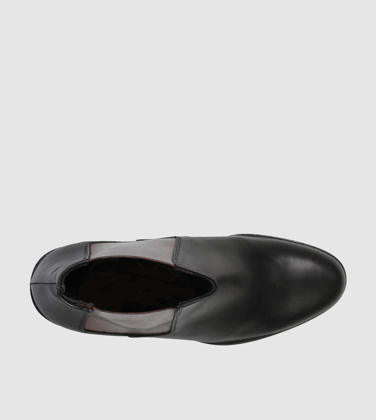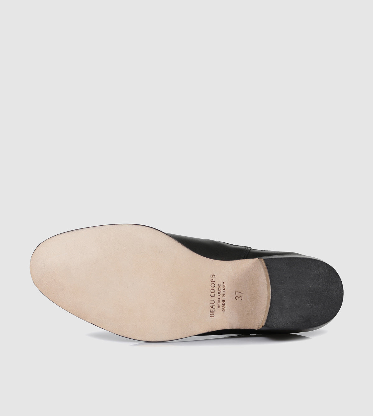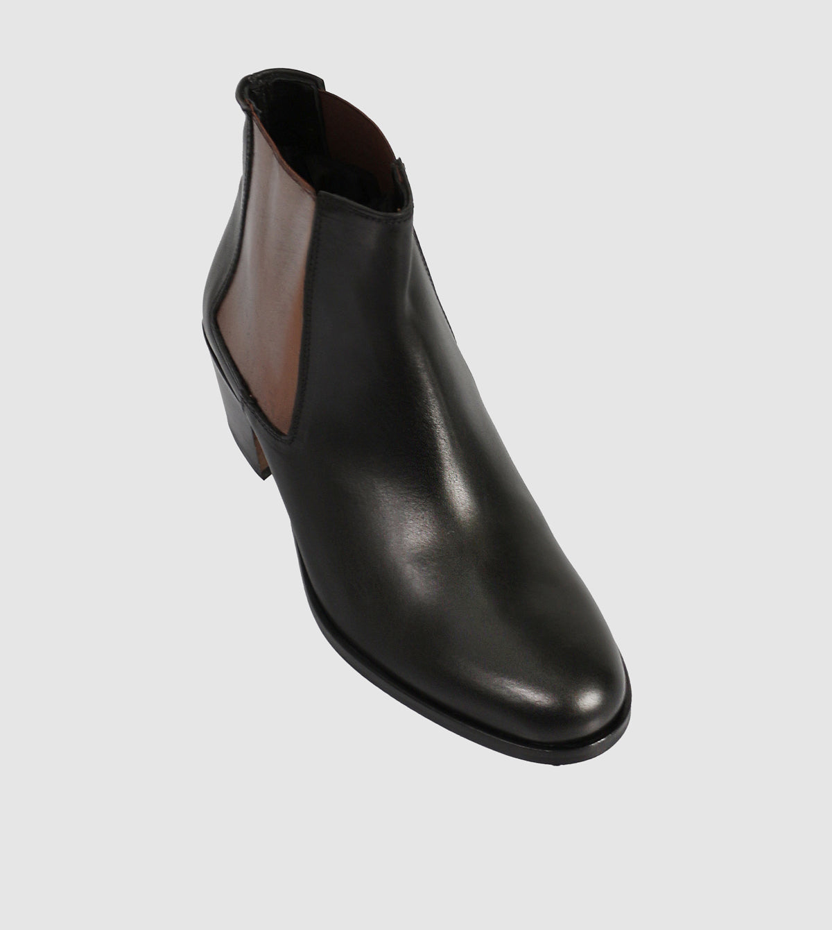 The Jerry Ankle Boots by Beau Coops offer a refined take on the Chelsea boot. Made in Italy from smooth black leather, this timeless silhouette is elevated by metallic bronze side gussets that catch the light with every step. A stacked block heel and clean almond toe shape make Jerry a versatile option for everyday wear—with just enough shine to stand out.