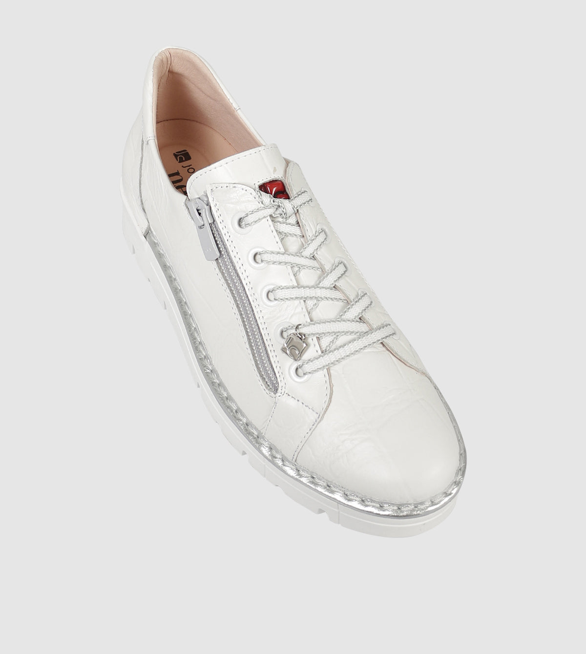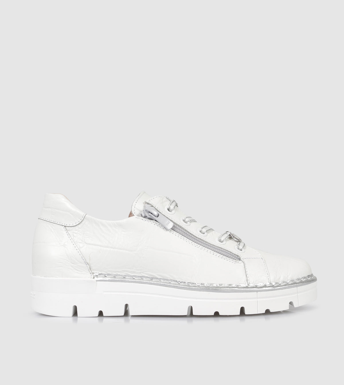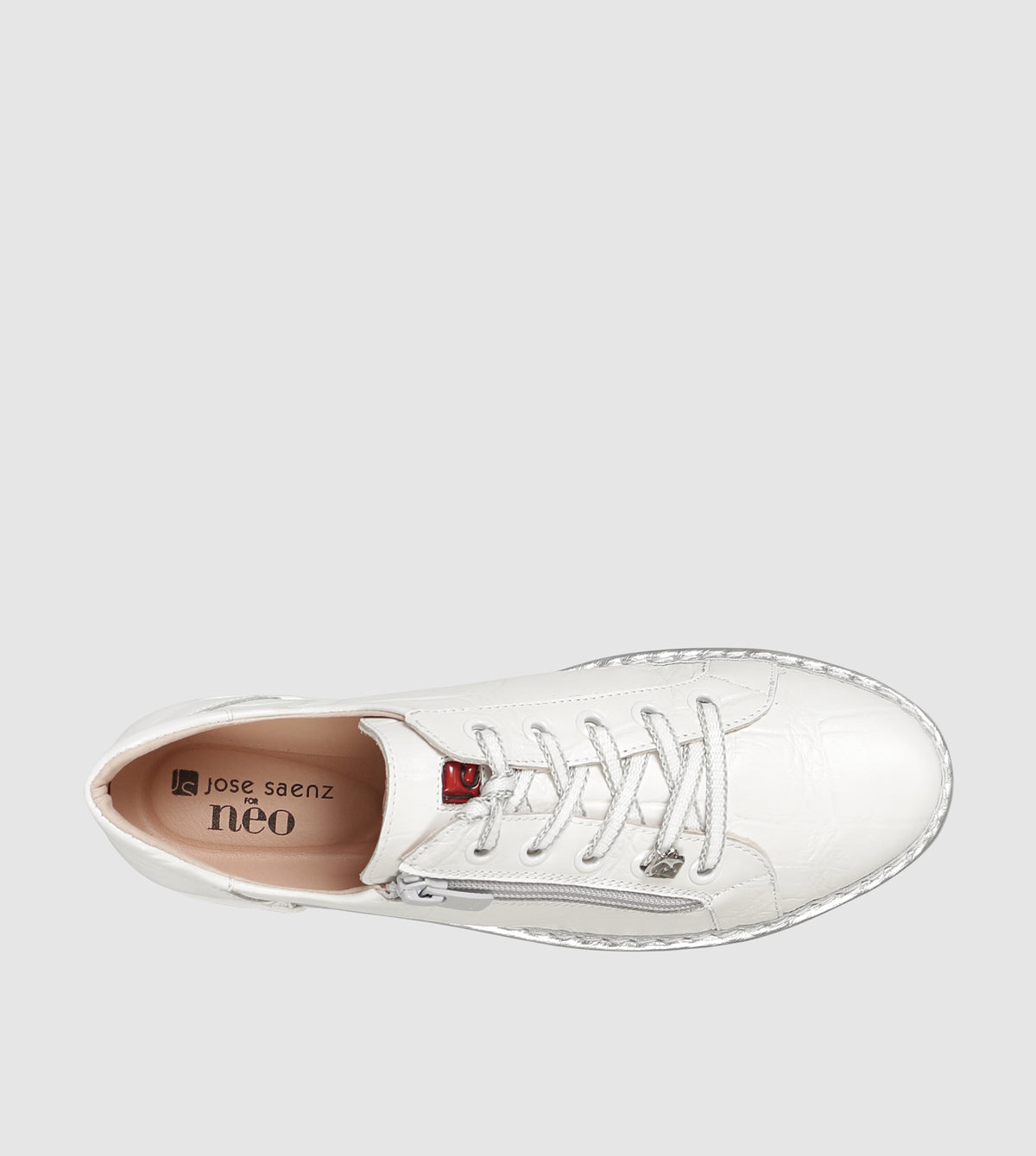 The Dersey Low Top Sneakers by Neo blend sporty ease with polished detail. Made from textured white leather with a subtle croc-embossed finish, these sneakers feature a chunky sole, silver accents, and a side zip for extra convenience. Perfect for off-duty dressing or elevated casual looks, Dersey delivers all-day comfort with a standout edge.