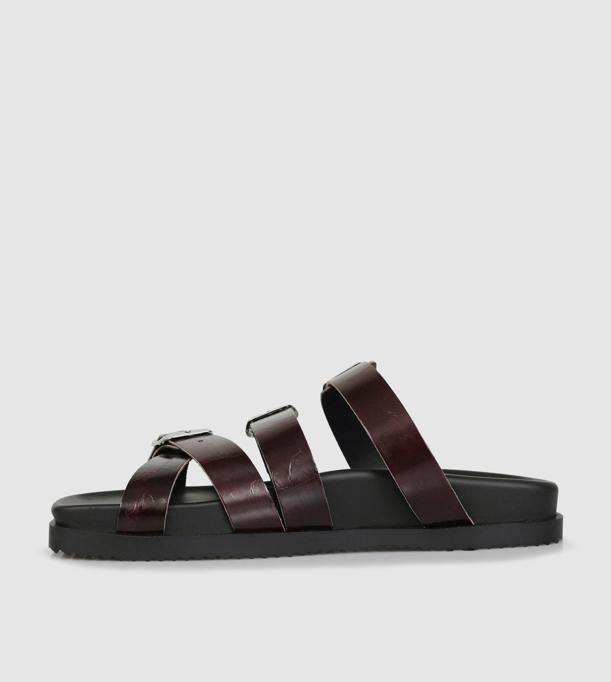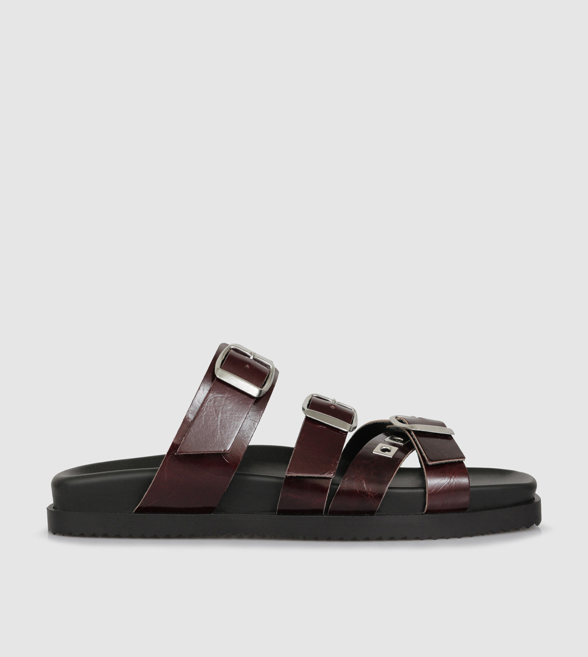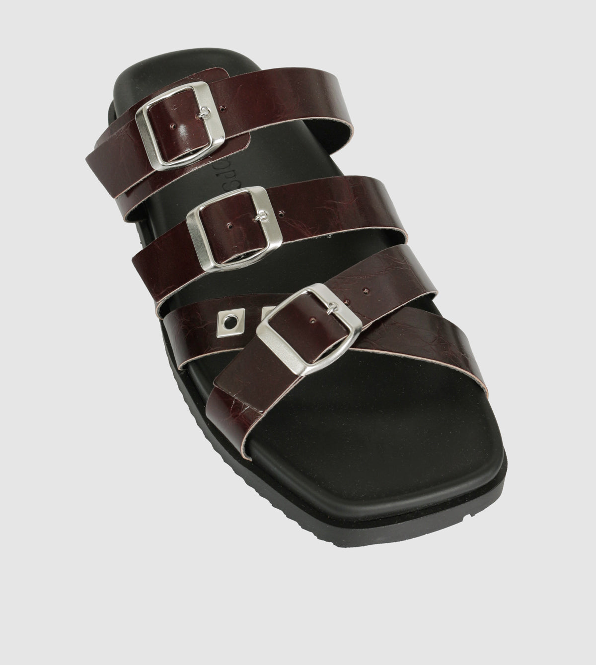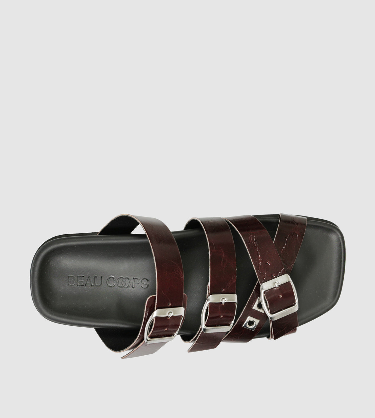 Created in Italy using Vaccheta leather or crinkeled painted leather, Parte Slide from beau Coops stand out with criss cross straps, oversized buckles and square eyelets. Their square toed footbed adds a modern twist to any look.