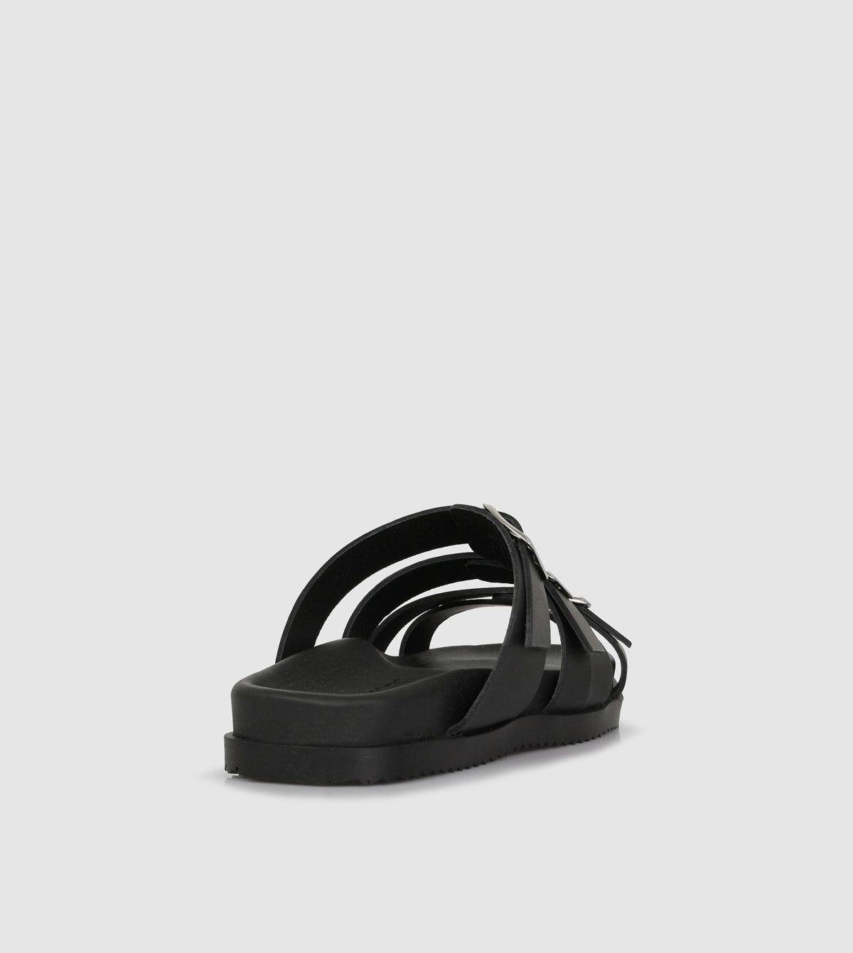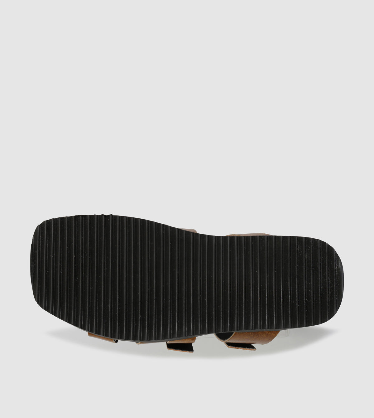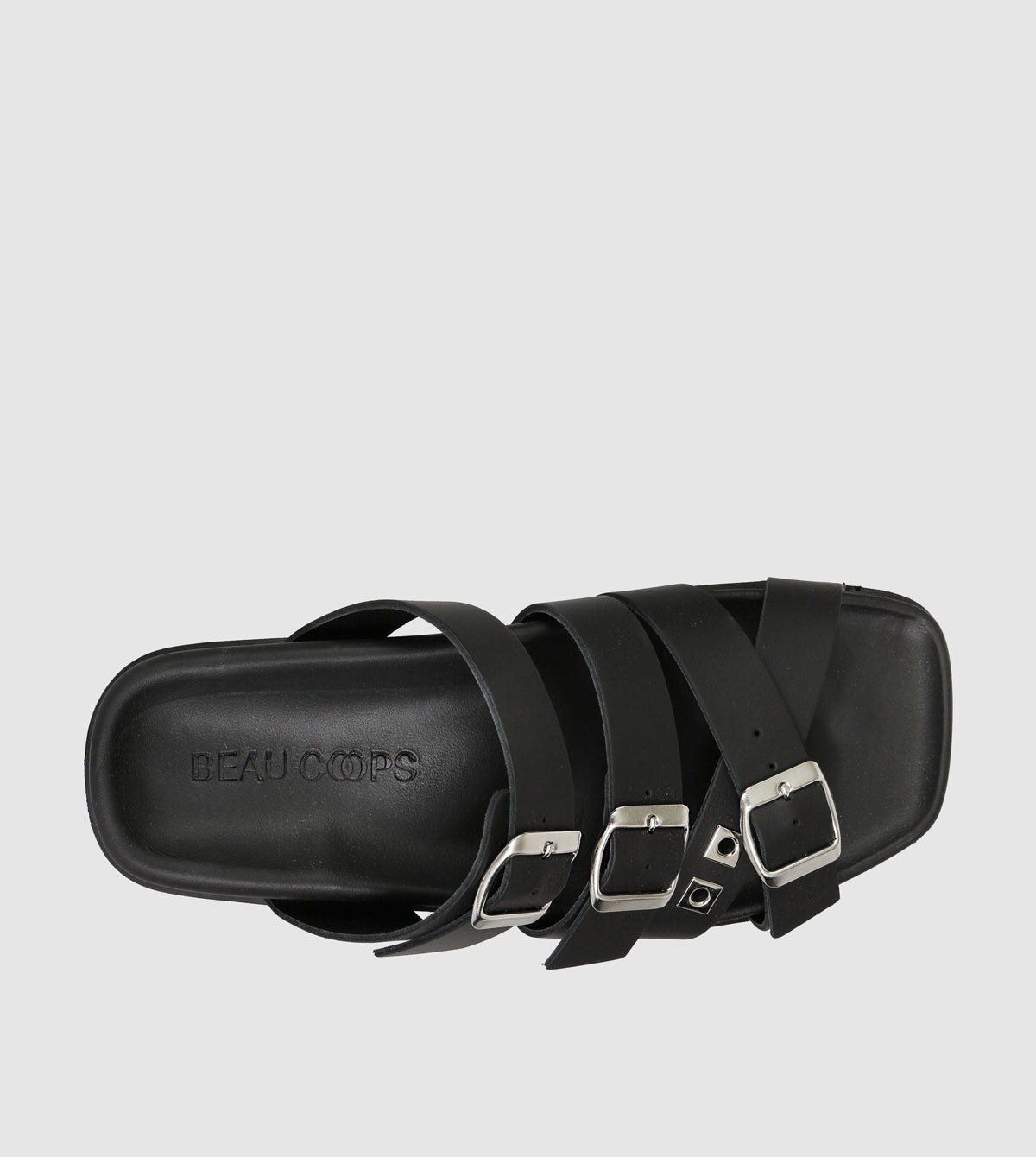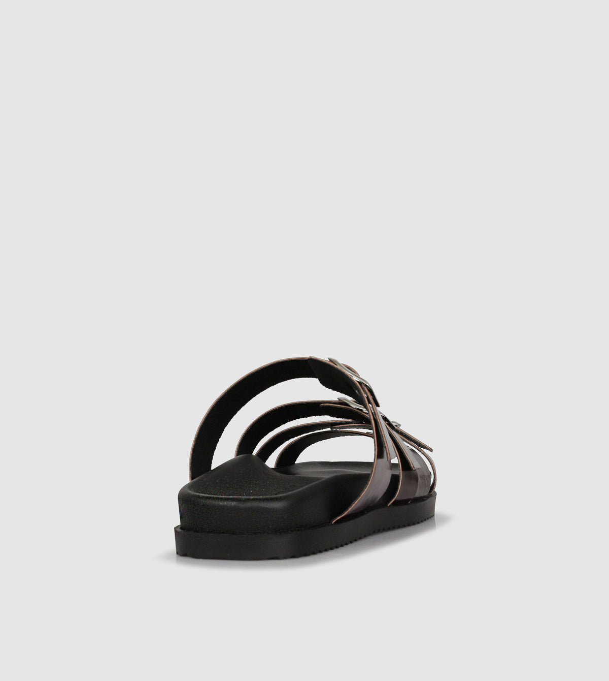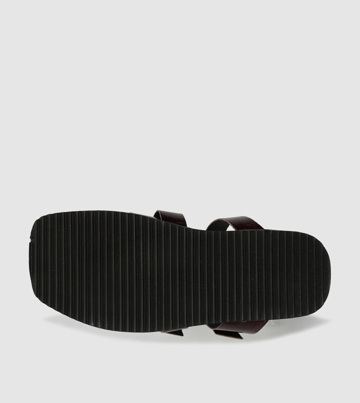 Created in Italy using Vaccheta leather or crinkeled painted leather, Parte Slide from beau Coops stand out with criss cross straps, oversized buckles and square eyelets. Their square toed footbed adds a modern twist to any look.