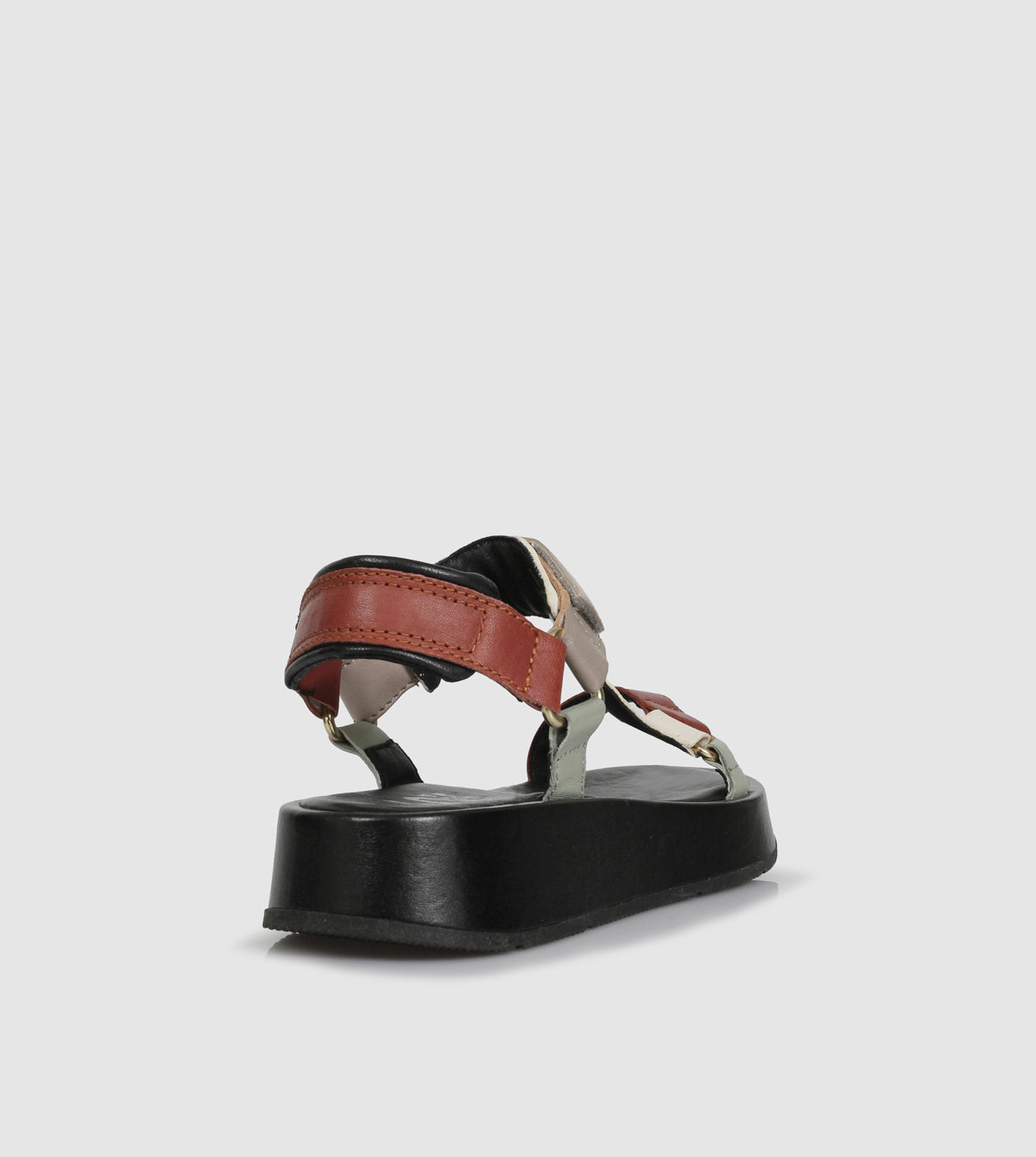 Ermyne sandals provide a stylish and comfortable look with its leather-covered flat form and iconic velcro strap asymmetric design. The padded foot bed offers extra cushioning and support, while the multicolored upper lets you express your unique style.